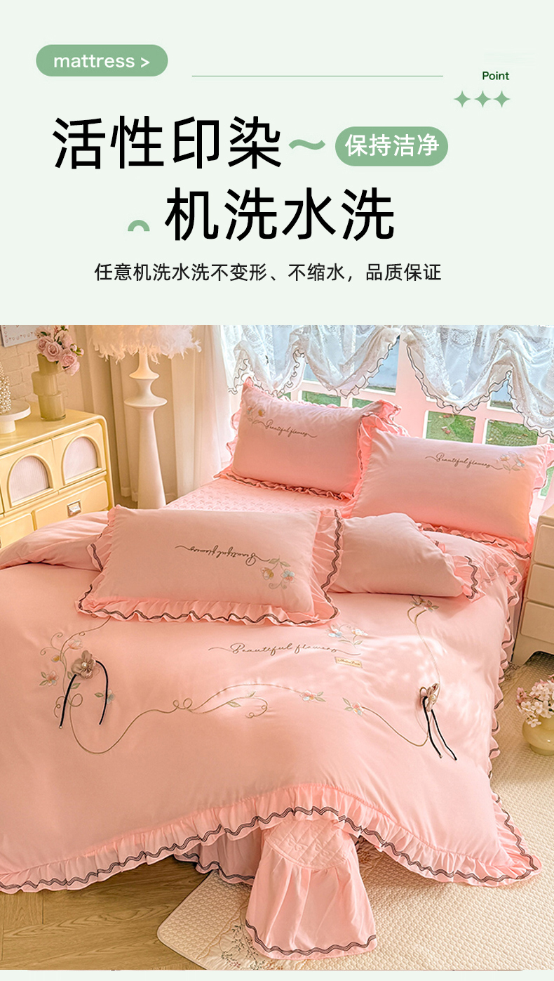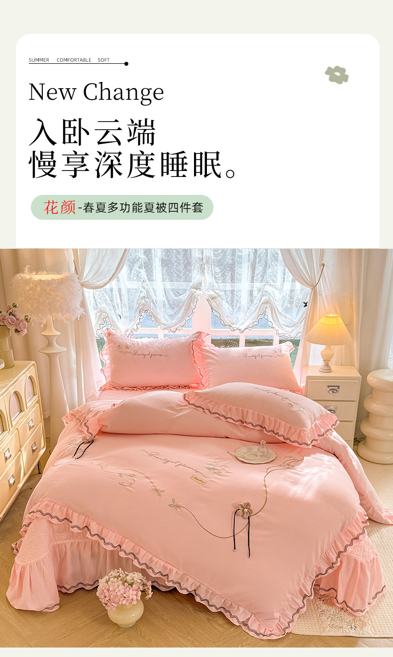 (总)(总)专柜品质苏米娜家纺2026春夏韩版法式公主风水洗棉床盖款多功能二合一被套 夏被床盖四件套--花颜系列,花颜-樱花粉 ,花颜-梦幻蓝 ,花颜-奶油白 ,花颜-嫩芽绿 ,花颜-香芋紫