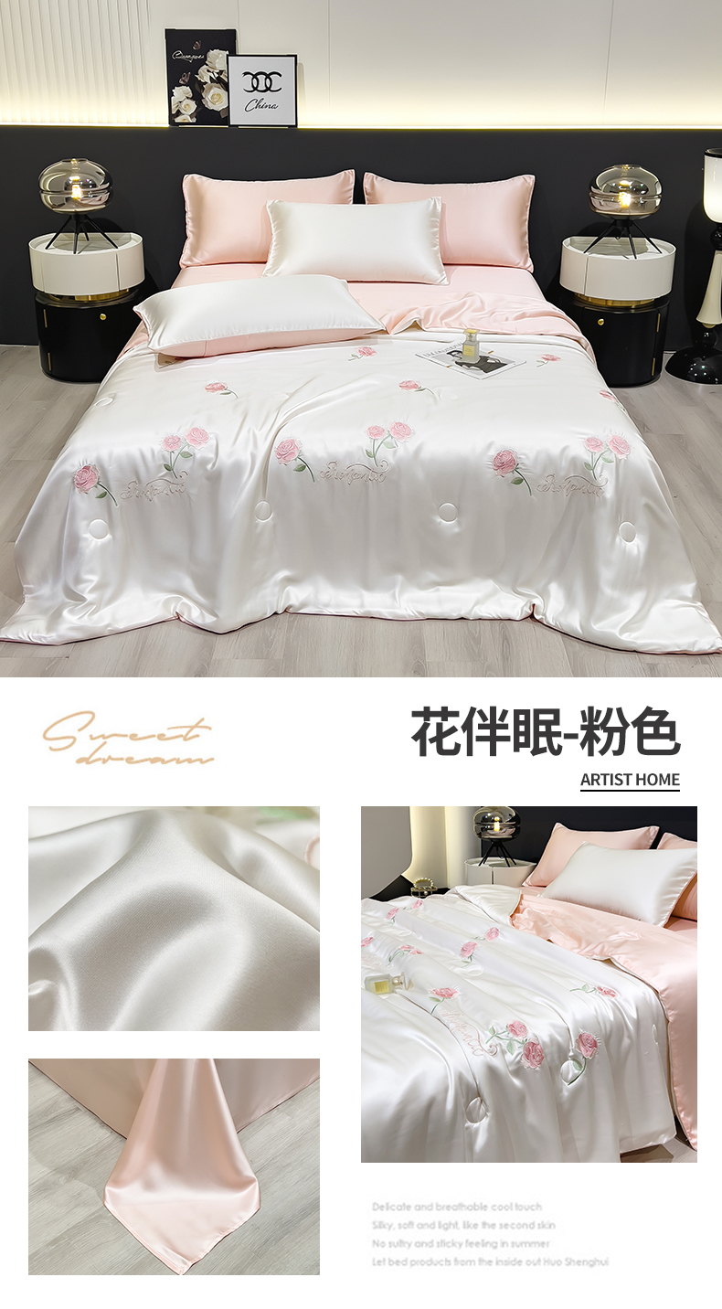 • 91家纺网 家纺一手货源 找家纺 兄弟坊 2026新款水洗冰丝刺绣夏被夏凉被夏被四件套 花伴眠-粉色