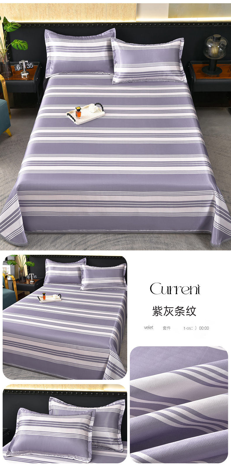 商品名称:念家居 2026新款轻奢可机洗水洗床单款高密大版斜纹冰丝凉席三件套 紫灰条纹