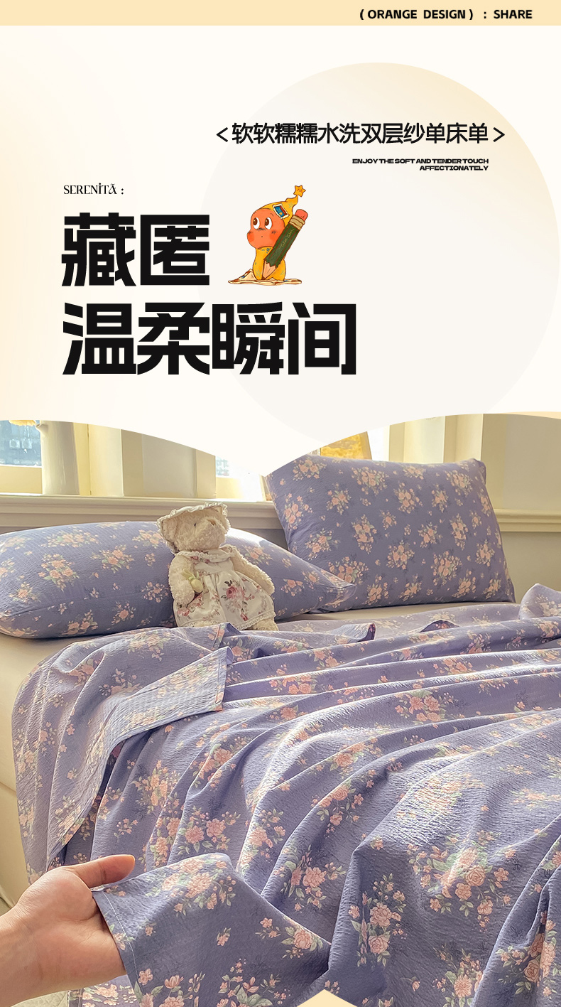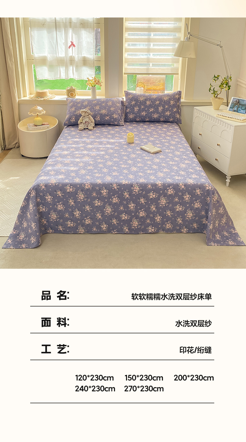 (总)晓时候 2026新款A类云感双层纱床单三件套单品单件床单,安然入夏,缤纷水果,冰川灰,豆蔻,多彩波点,繁花,蝴蝶结-紫,花间兔,蓝色泡芙狗,洛神花间,萌宠派对,萌萌星星人,奶芙狗,柠檬黄,芊芊花语,牵牛紫,俏皮狗,青春蓝,青竹绿,甜甜西高地,甜心女孩,小确幸,星星喵,樱花粉,云朵白