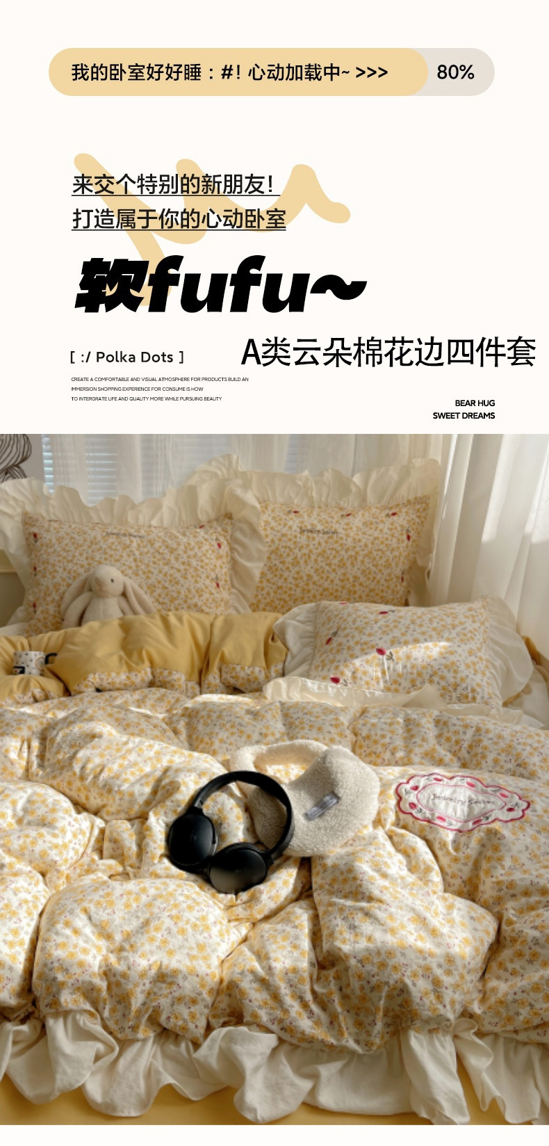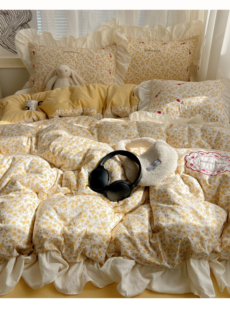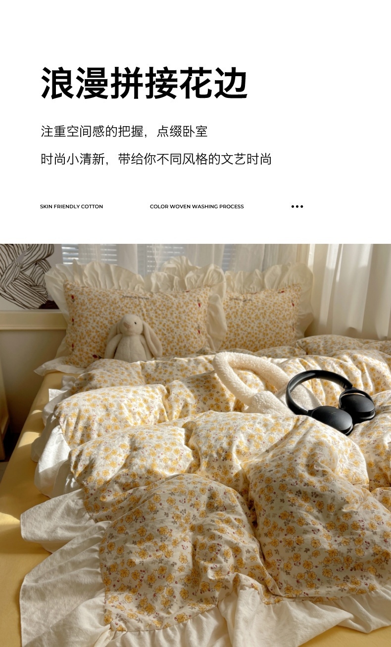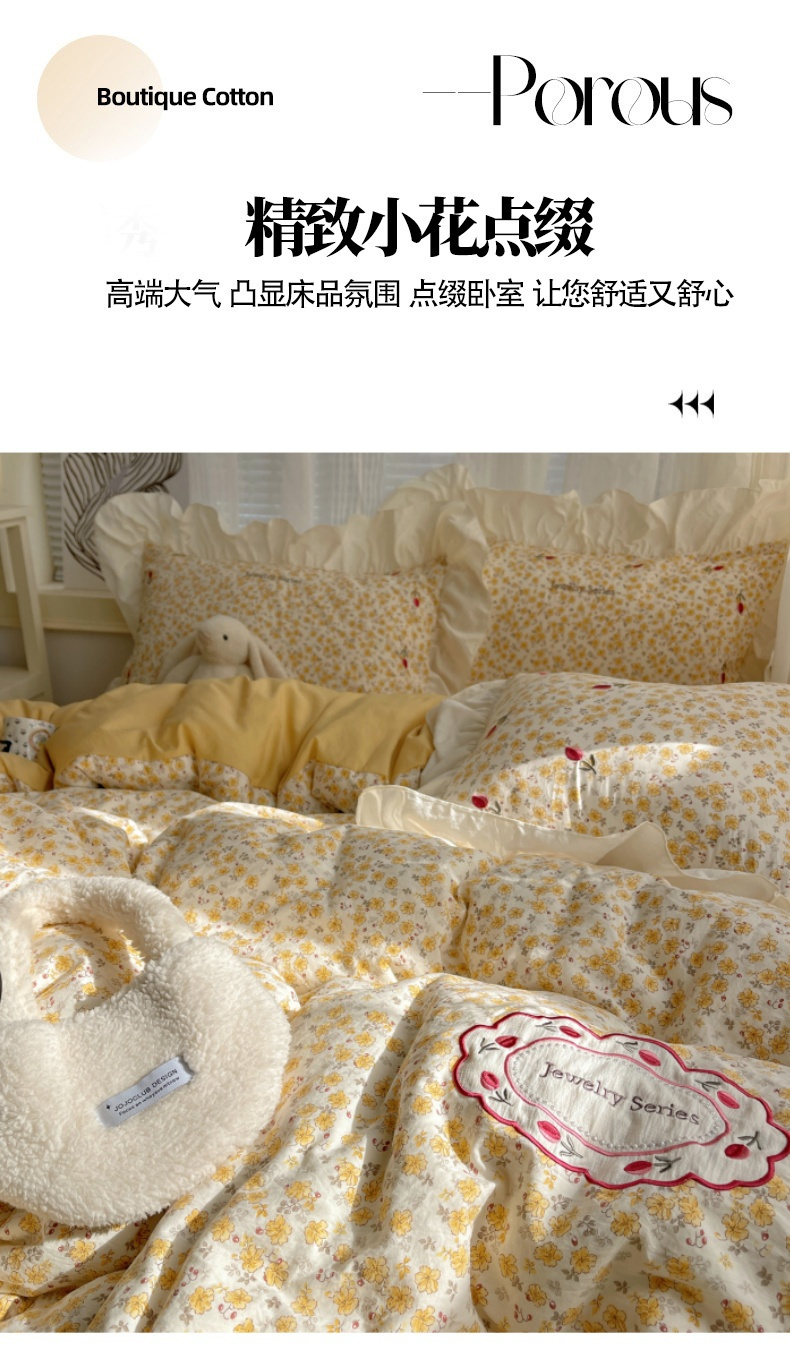 商品名称:梦舒羽 2026新款A类云朵棉亲肤四季款刺绣1.8m四件套席床单宿舍绣花1.5米三件套 春日暖阳(刺绣款)