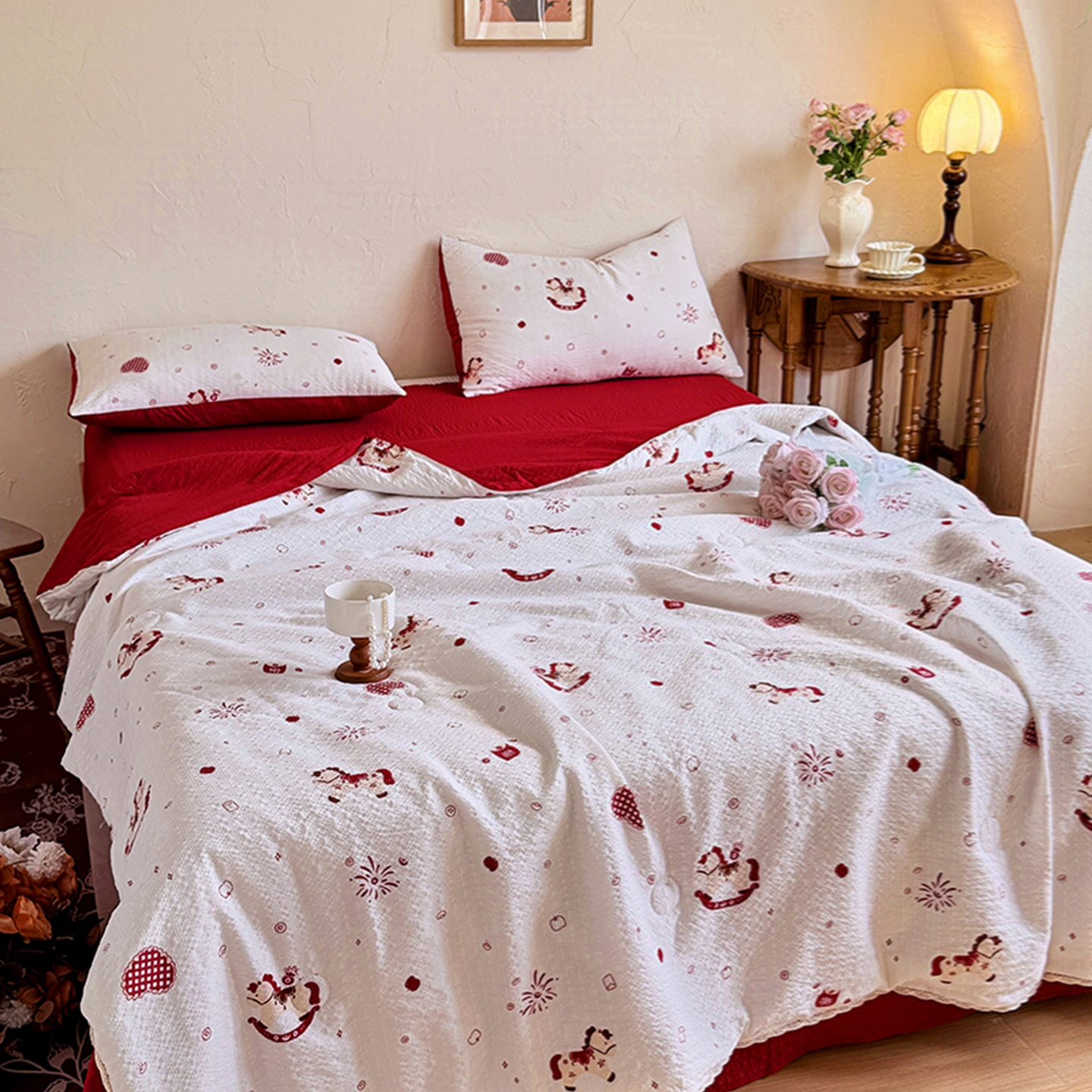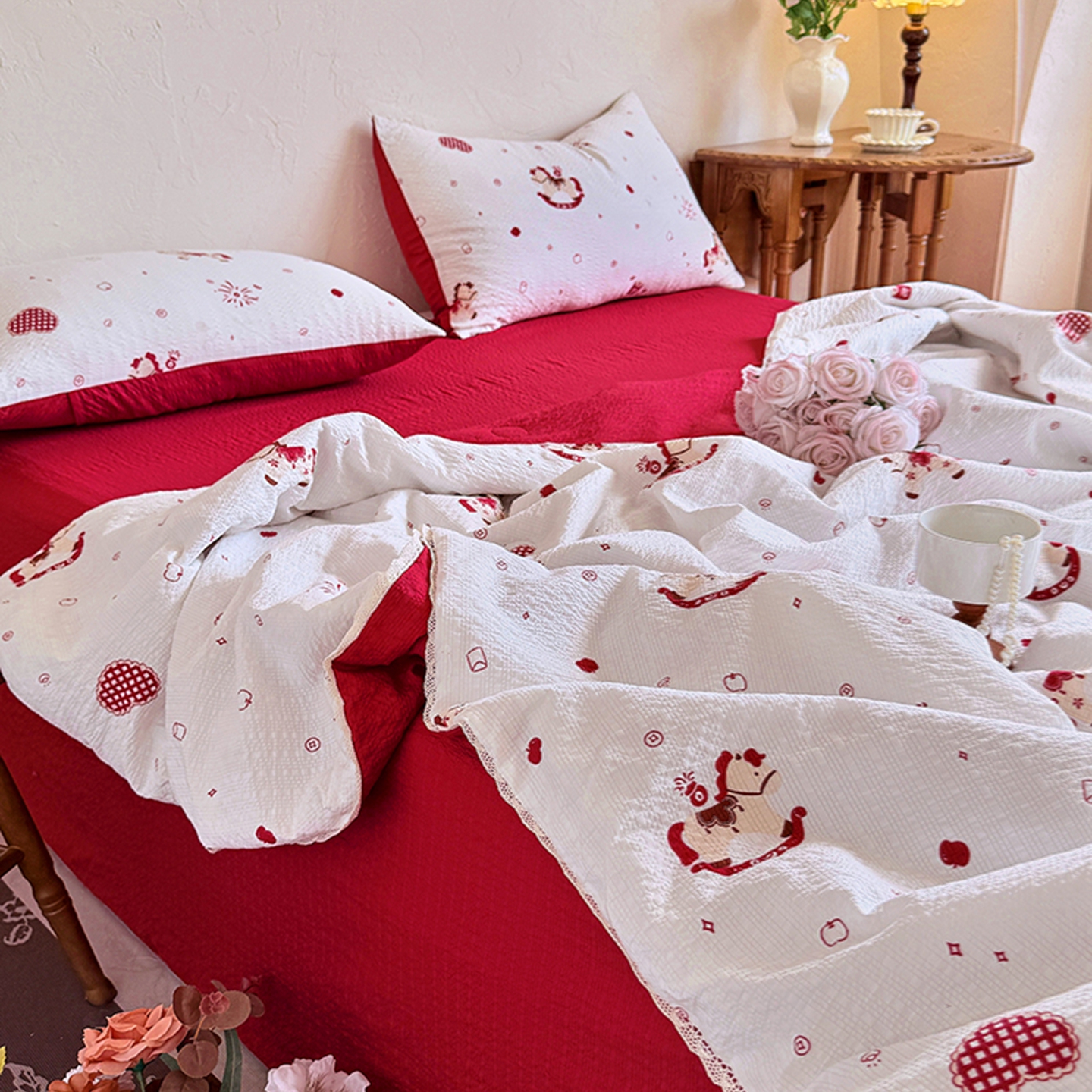 亿品家纺 2026直播爆款韩版赫本风花边款水洗双层纱夏被四件套【有买家秀加V】,茶墨,朵颜,蔷薇岛,山茶左岸,山奈,幸运,虞美人,组合图仅供展示