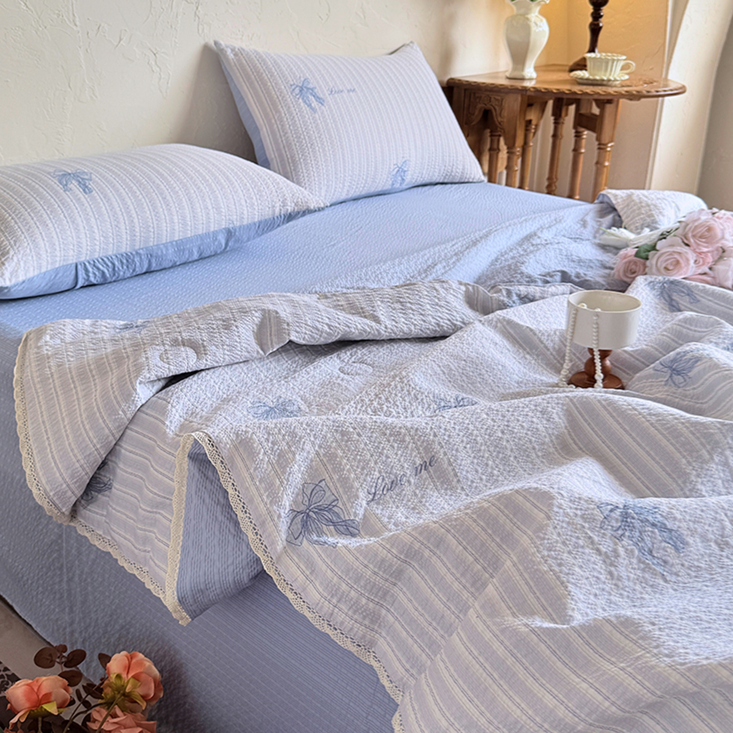 商品名称:亿品家纺 2026新款泡芙棉花边款夏被夏凉被空调被 南法假日蓝