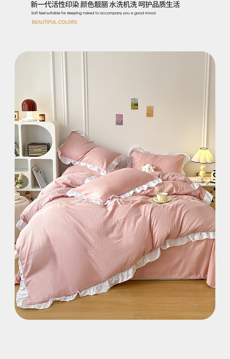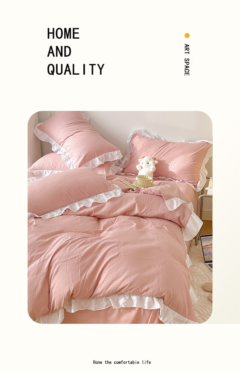 商品名称:啊雅家居 2026新款轻奢韩式花边华夫格四件套-花边款 花边款 梦幻粉