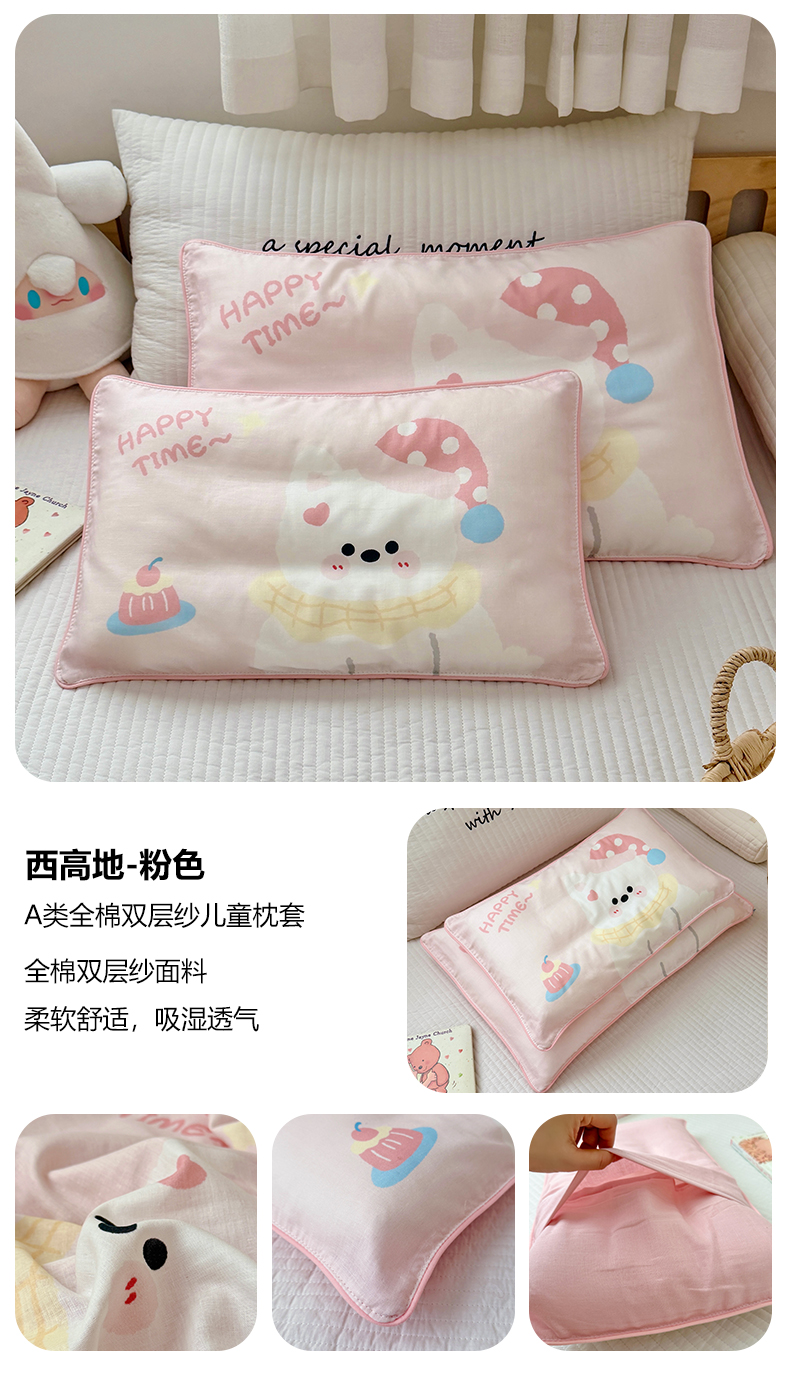 (总)萌宝家纺 2026春夏纯棉双层纱儿童枕套A类宝宝纱布枕头枕芯(萌宠系列),快乐小马,绿恐龙,西高地-粉色,西高地-蓝色,小海豹,小企鹅,小狮子,小兔子,小象,组合图仅供参考不可下单