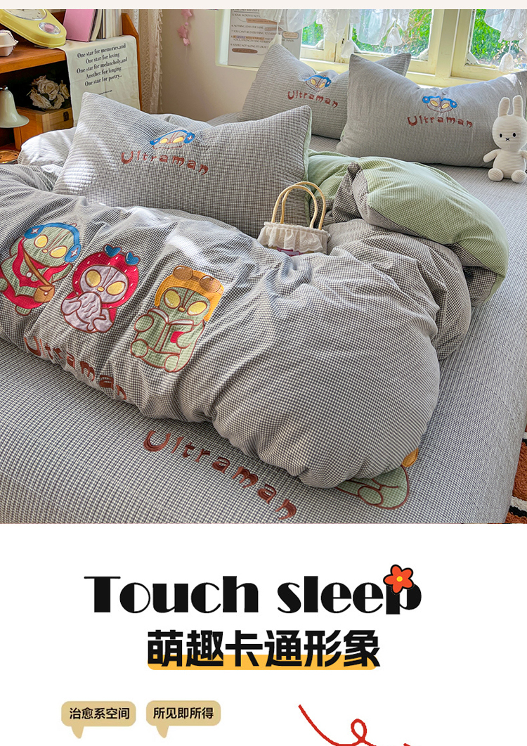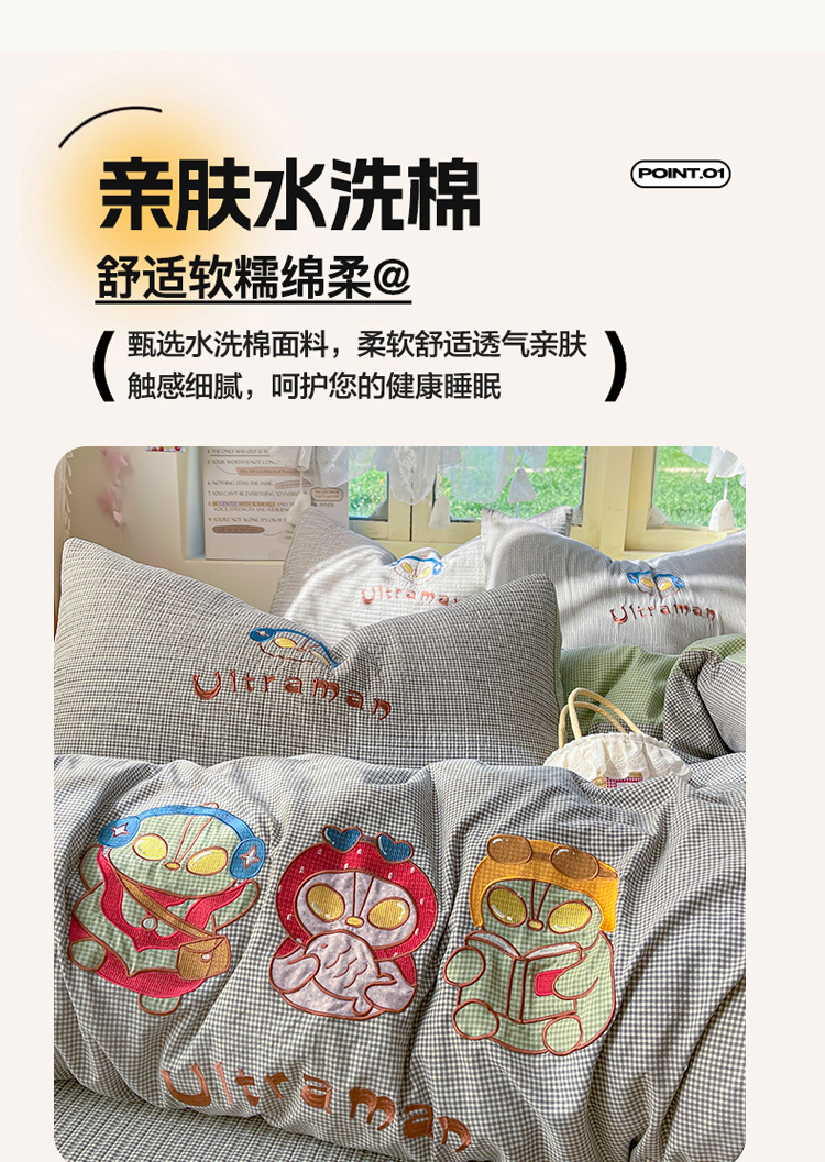 (总)宜家坊 2026直播热款卡通贴布绣加厚仿棉古棉单人双人单倍套三四件套,奥特兄妹,吉象三宝,美小蒂,萌萌兔绿,旺旺狗狗,熊猫卡皮