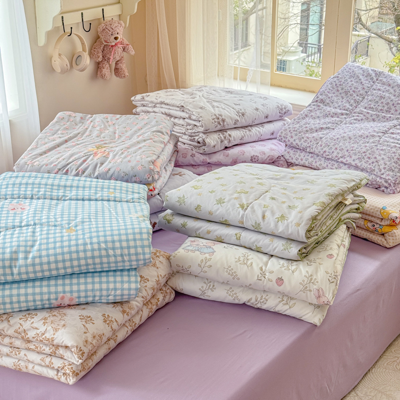(总)梦舒阳家纺 2026新款仿棉夏凉被古法水洗棉夏被空调被跑量款,花涧小兔,黄格子星星,蓝格子兔子,绿色星叶,水墨花,兔兔闺蜜,韵味狗,枝叶,紫萱,紫韵