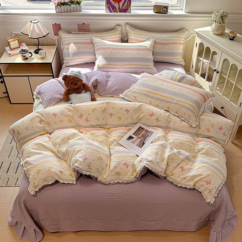 (总)一比一家纺 2026新款彩色全棉花边木棉皱皱纱四件套,阿吉豆,初心粉,初心蓝,扶摇,赫本,花间女孩,花漫漫,花蜜,阑珊,罗卡,奶芙喵,甜心格格,午后花园,小马驹,邂逅,野餐兔,樱花季,悠然,紫烟
