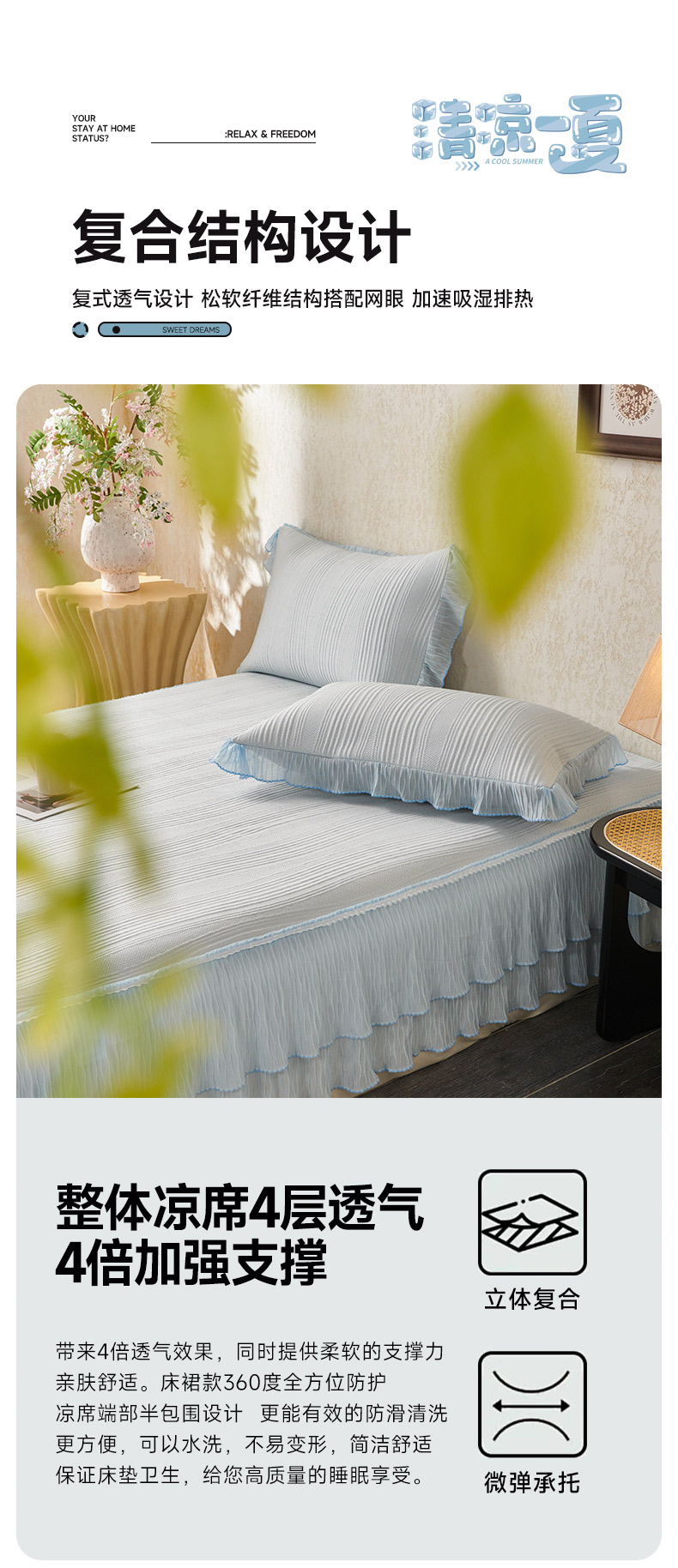 (总)桂雅居 2026新款高分子冰感蕾丝床裙床笠款凉席三件套,浅夏桃风,清氧浅绿,柔雾奶咖,素影灰纱,云漫冰蓝