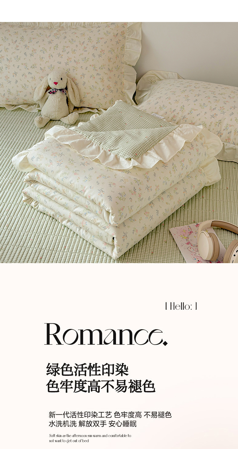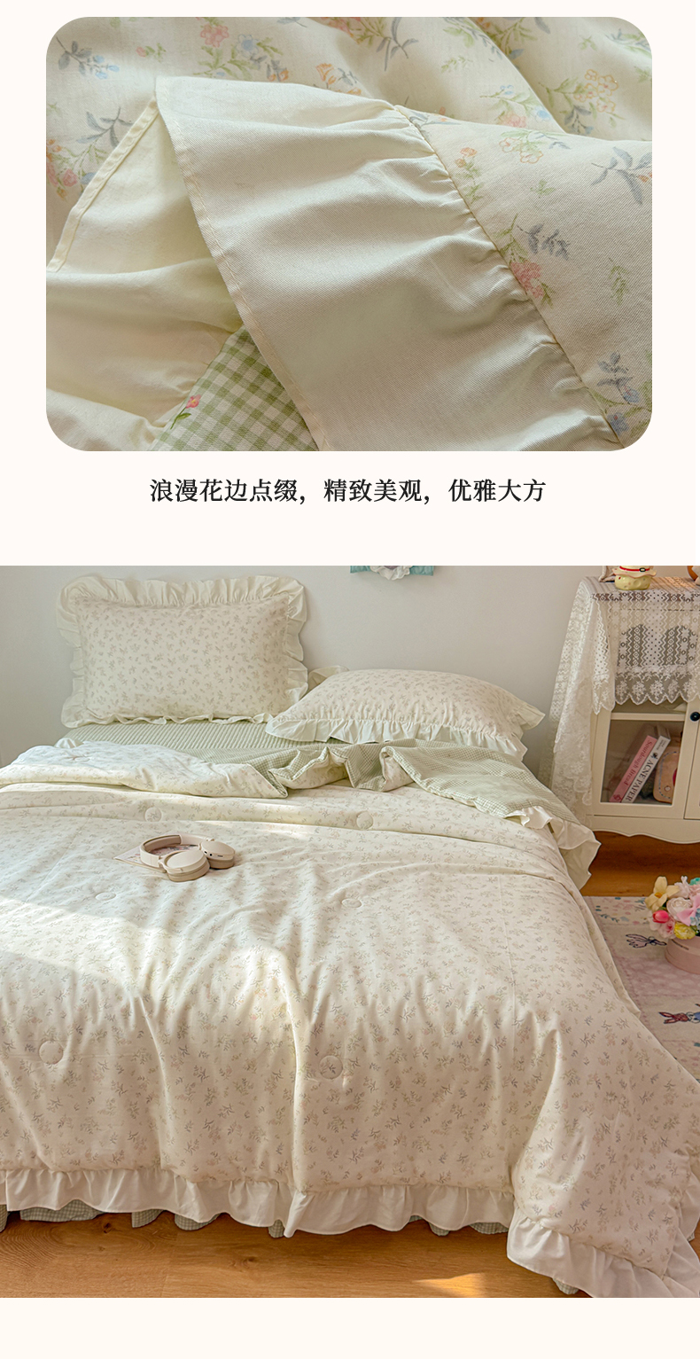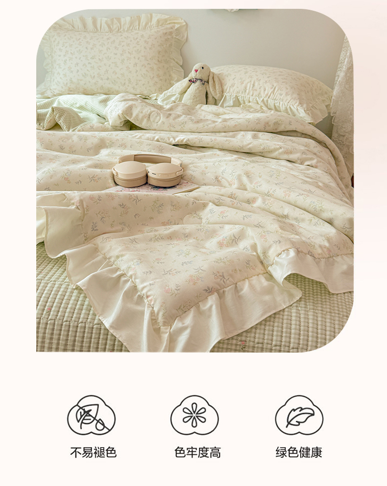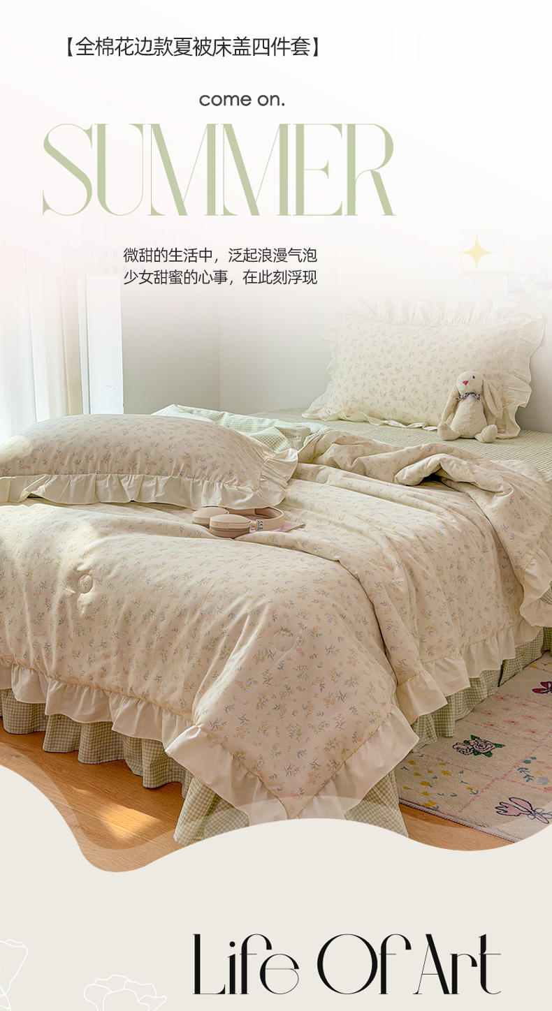 • 91家纺网 家纺一手货源 找家纺 女子家纺 2026新款全棉花边夏被全棉床盖夏被四件套 晚棠枝语
