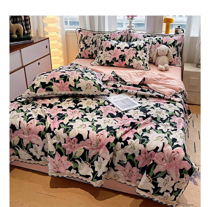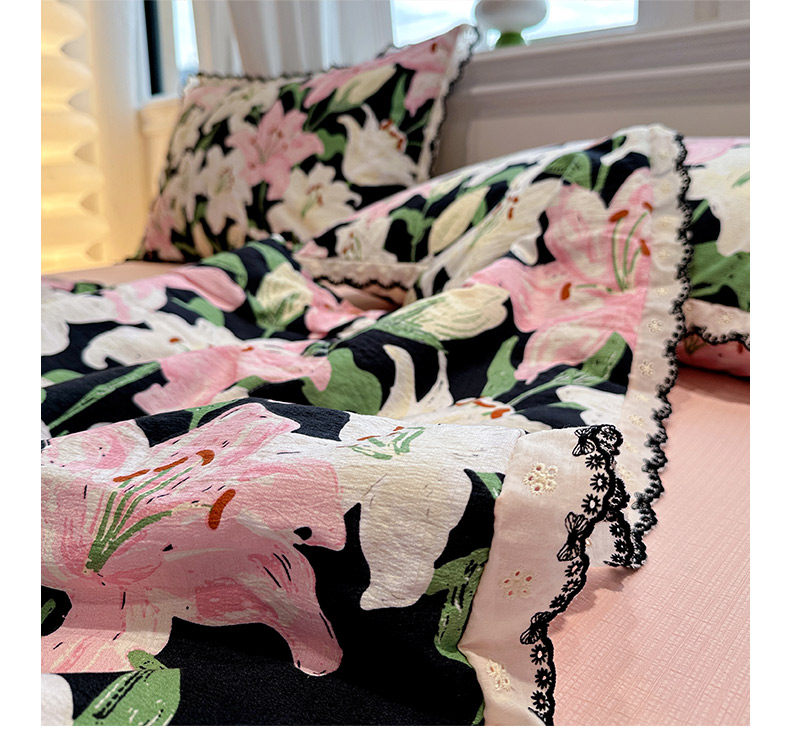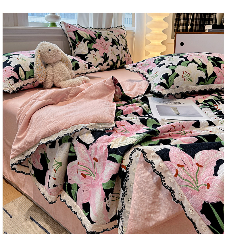 • 91家纺网 家纺一手货源 找家纺 花伞家居 2026新款蕾丝花边皱皱双层纱夏被四件套含买家秀 夏被-盛开粉