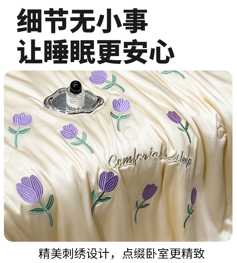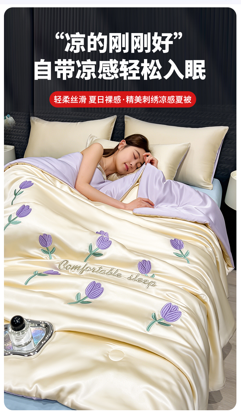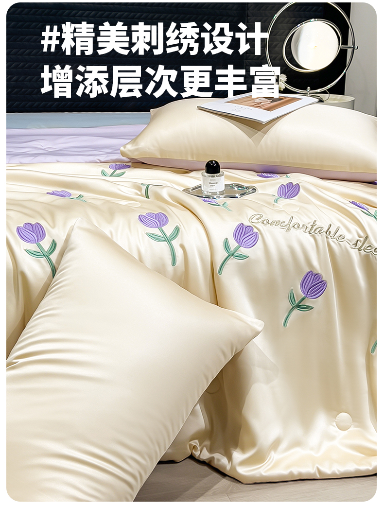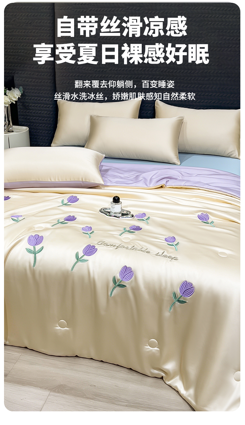 • 91家纺网 家纺一手货源 找家纺 爱彼家纺 2026夏季新款水洗冰丝轻奢刺绣凉感夏被夏凉被空调被 花朵-奶白紫
