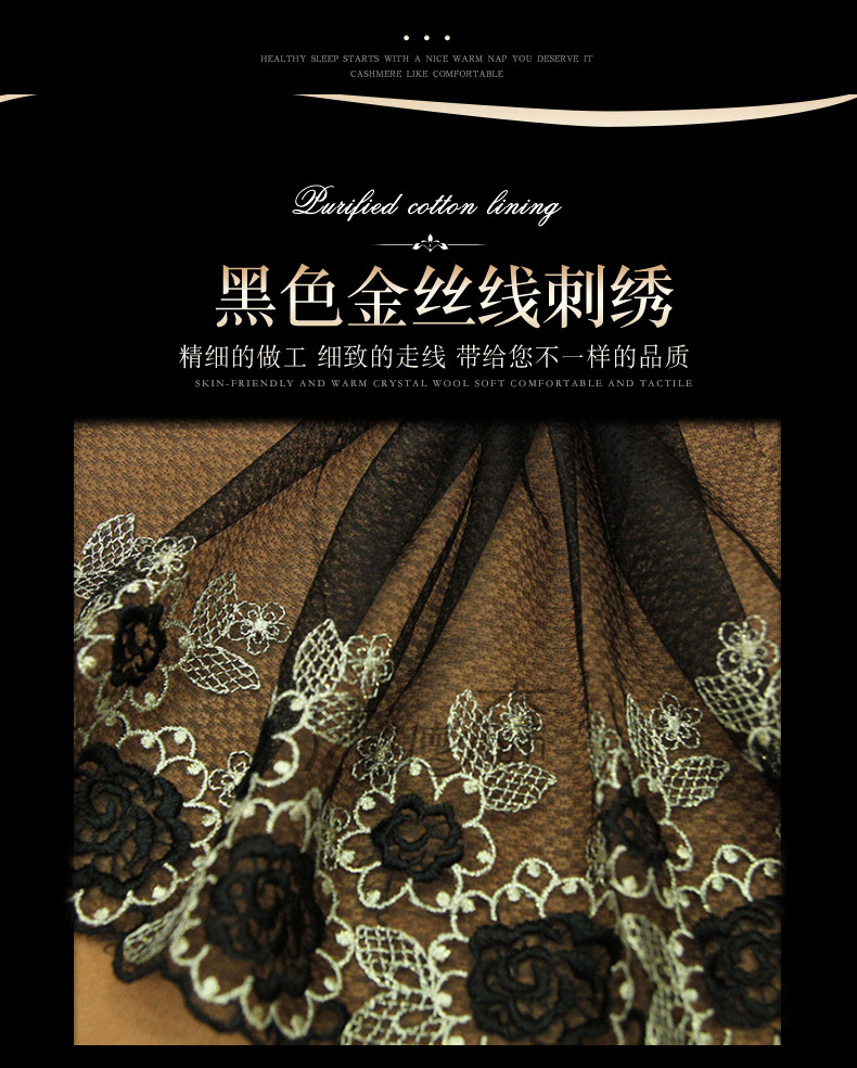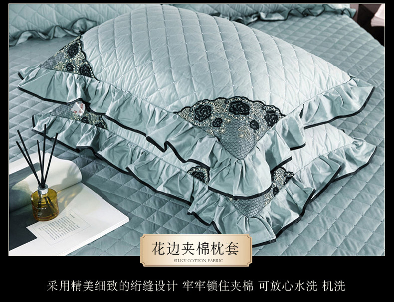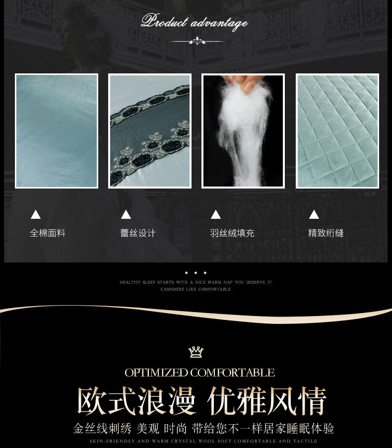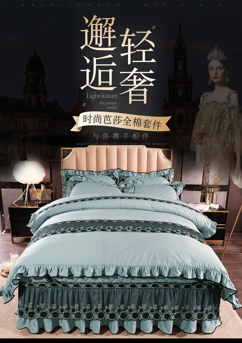 商品名称:时尚芭莎宫廷风黑色刺绣蕾丝款全棉133*72夹棉四件套瓷绿