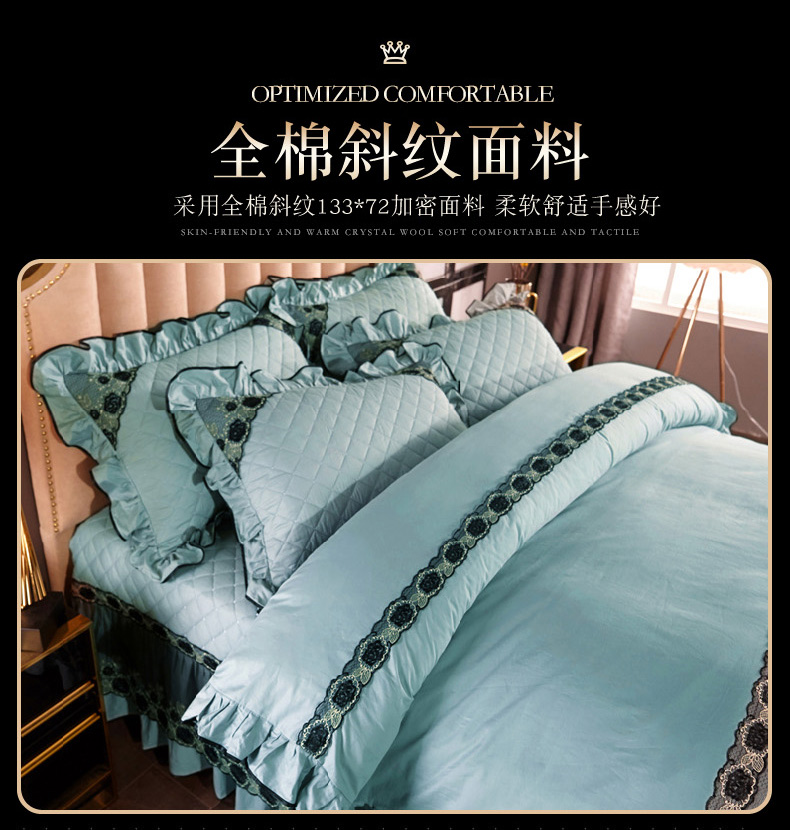 时尚芭莎宫廷风黑色刺绣蕾丝款全棉133*72夹棉四件套瓷绿