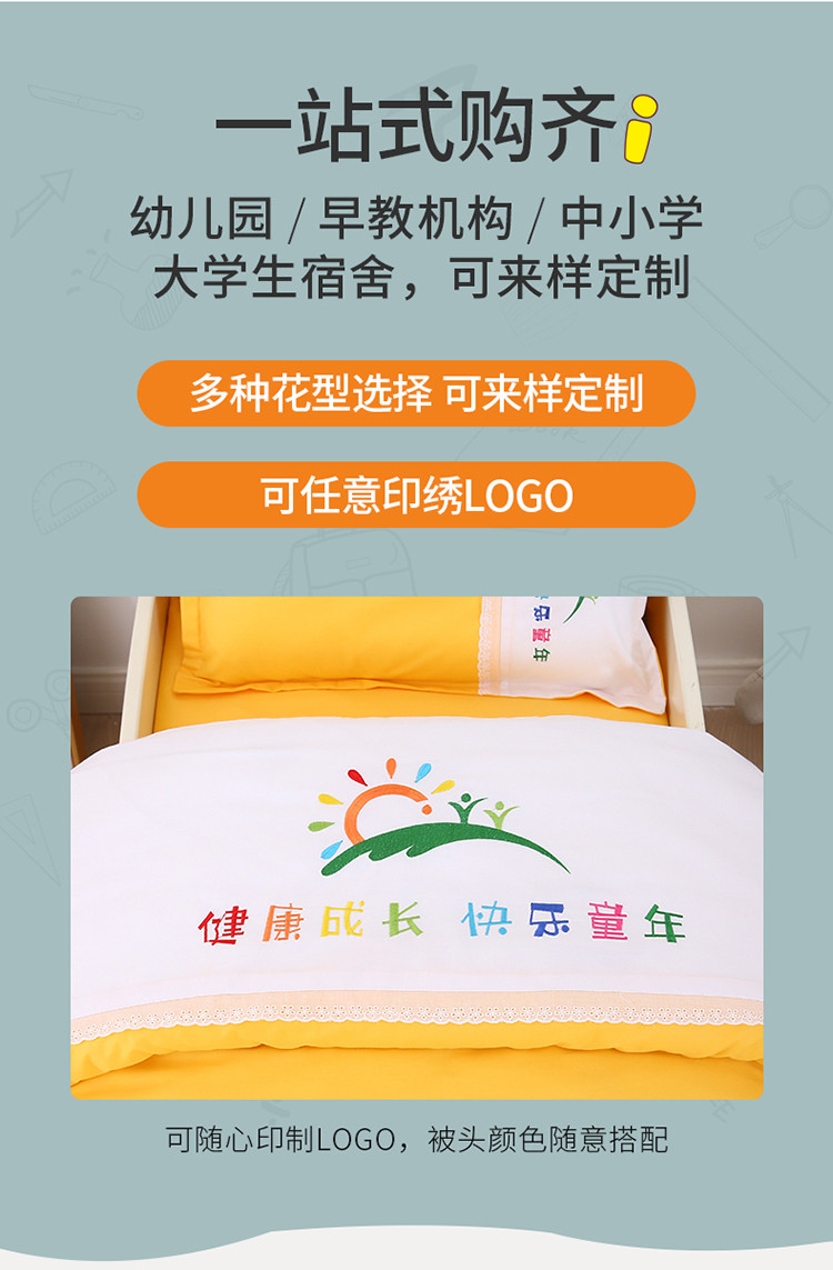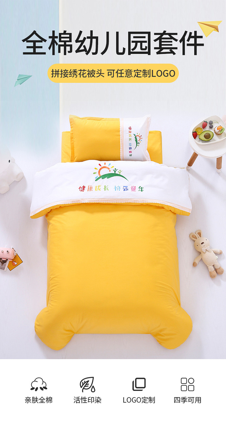 当前位置: 91家纺网 > 商品网购 > 床品套件 > 多件套 > 多件套 > 订做纯色绣花logo纯棉刺绣园标幼儿园被子三件套午睡六件套 经典黄白