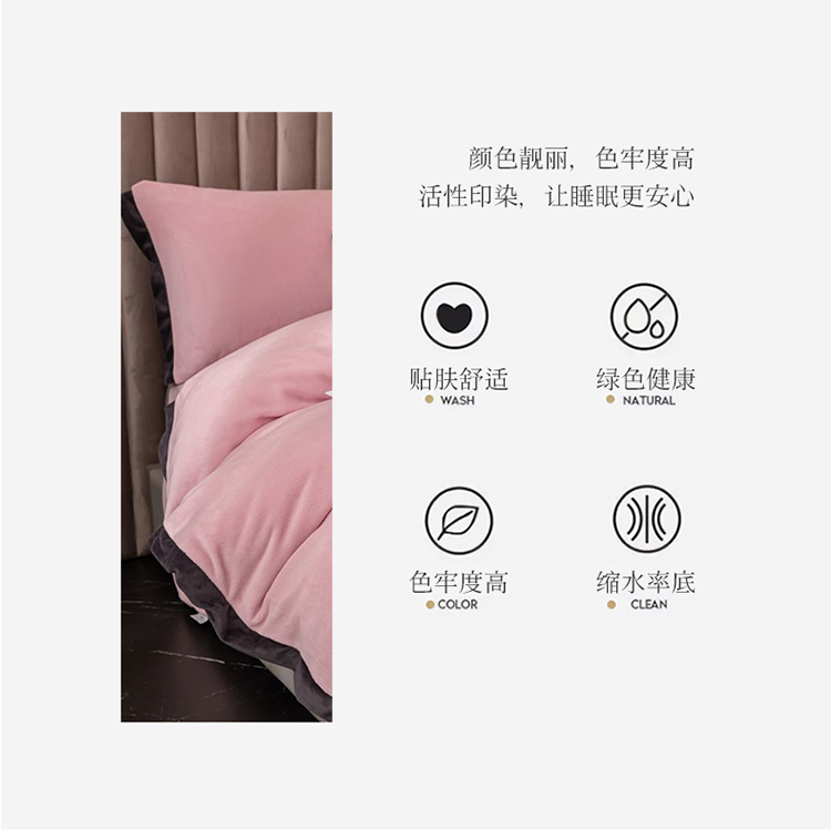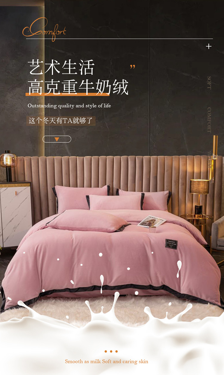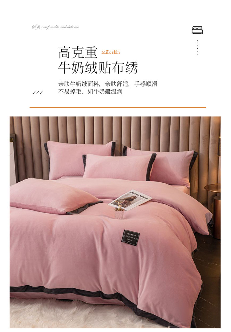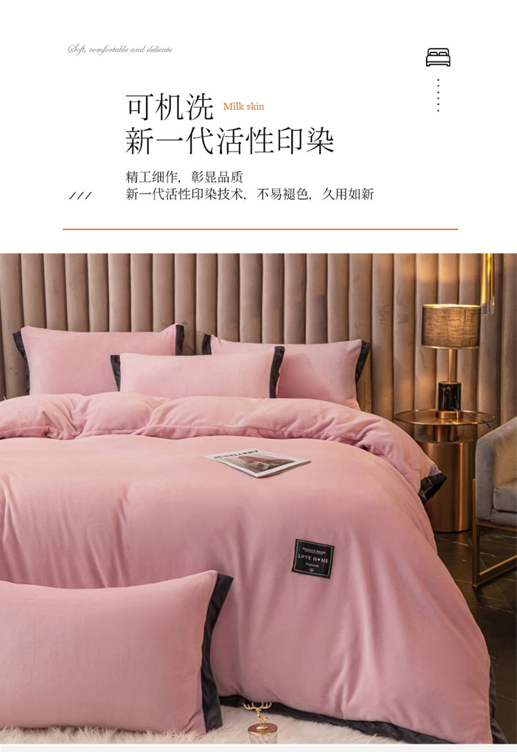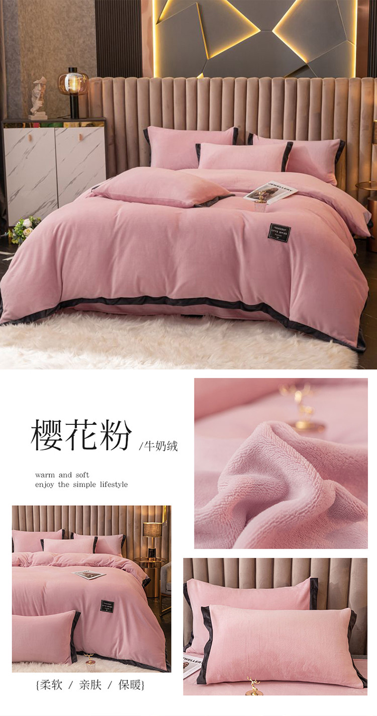 大米家居 新款高克重宽边牛奶宝宝绒法莱亲肤绒四件套荣耀樱花粉