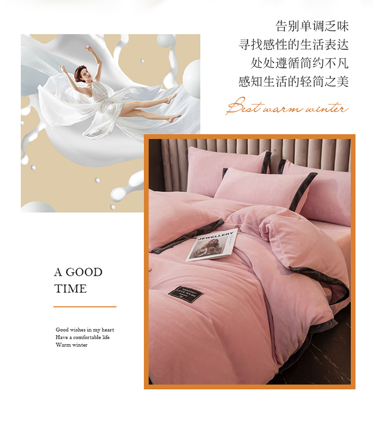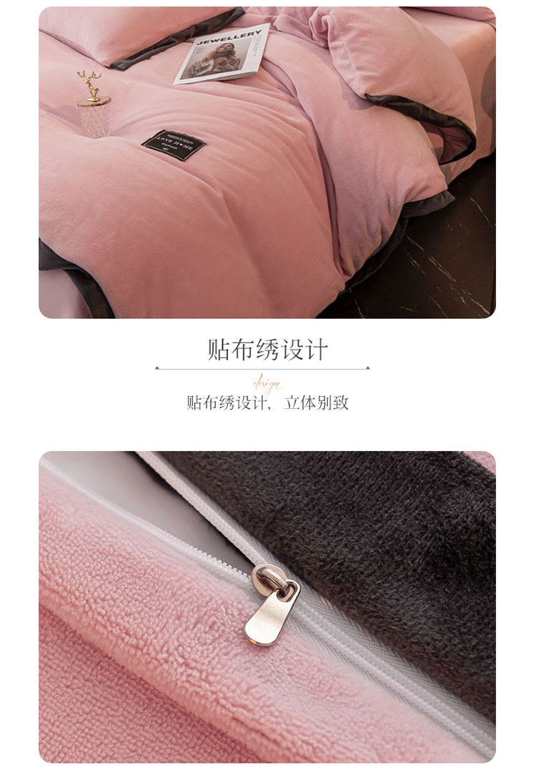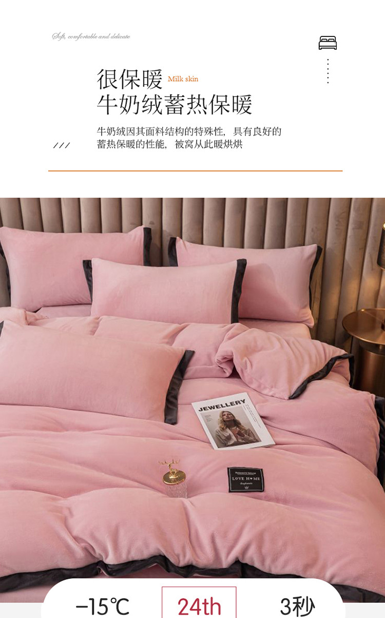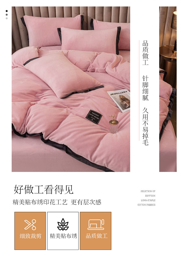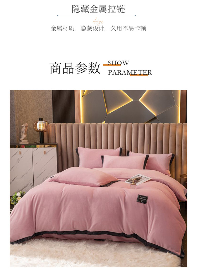 大米家居 新款高克重宽边牛奶宝宝绒法莱亲肤绒四件套荣耀樱花粉