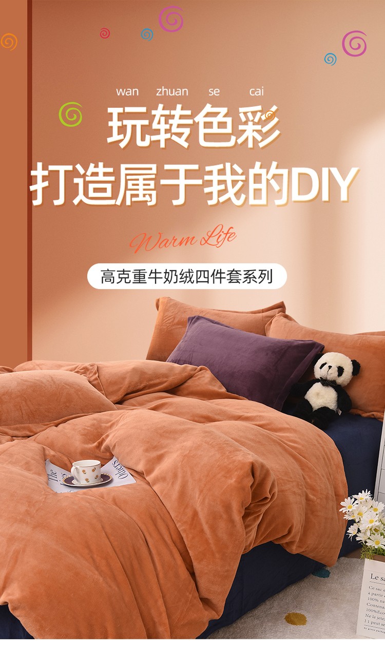 优彩 2021新款高克重纯色混搭牛奶绒四件套 蜜橙