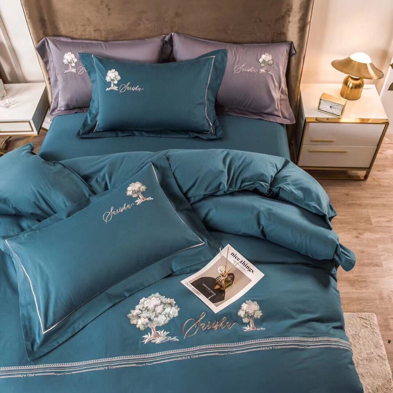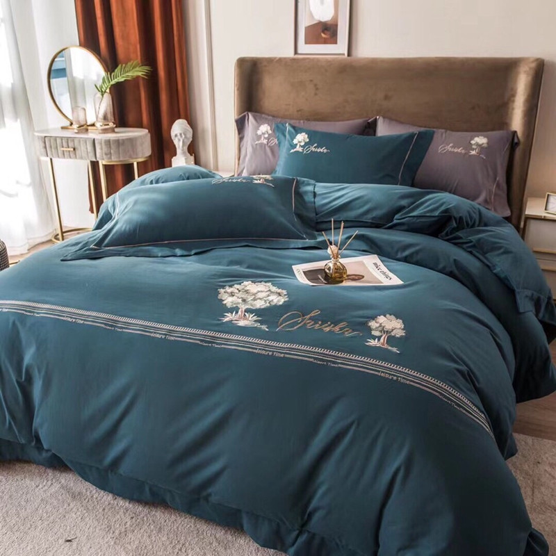 总玖玖爱家纺 纯棉100支贡缎长绒棉刺绣被套三件套四件套加大四件套,白色,高级灰,卡其,蓝灰,绿色,浅桔,深蓝,紫豆沙