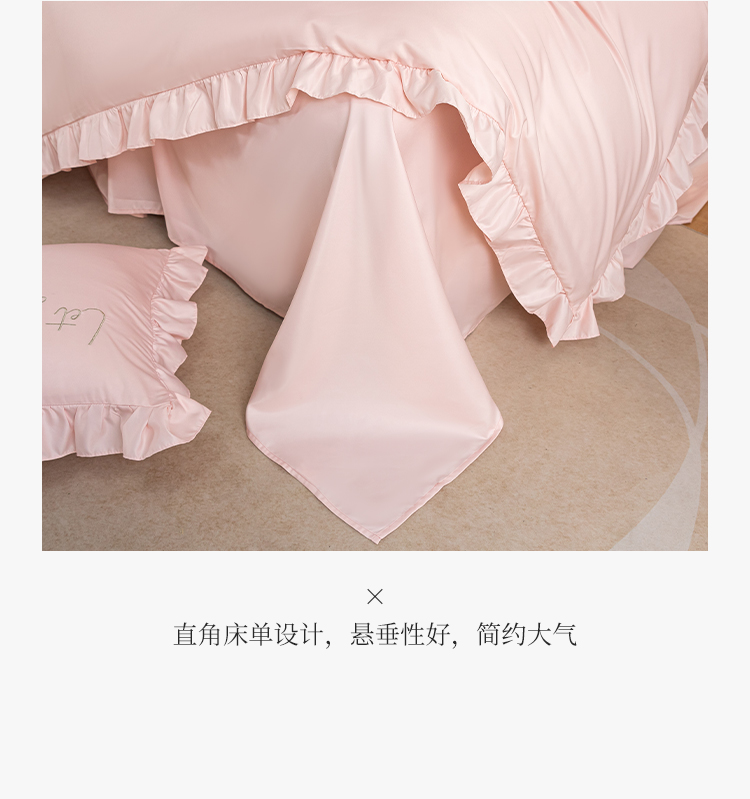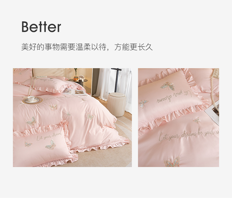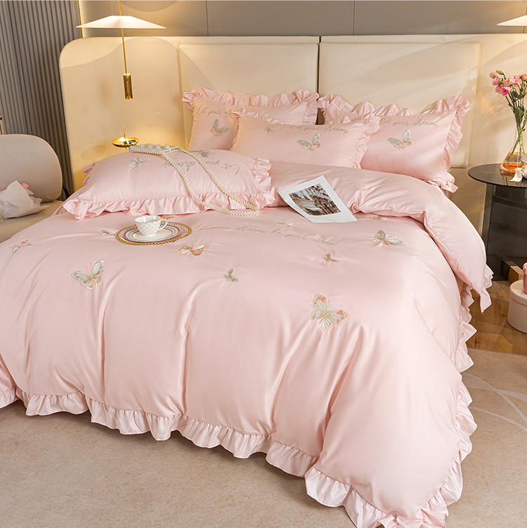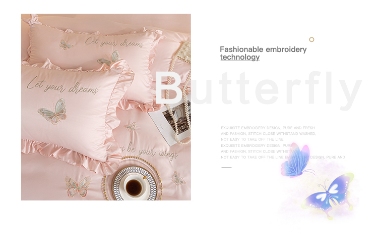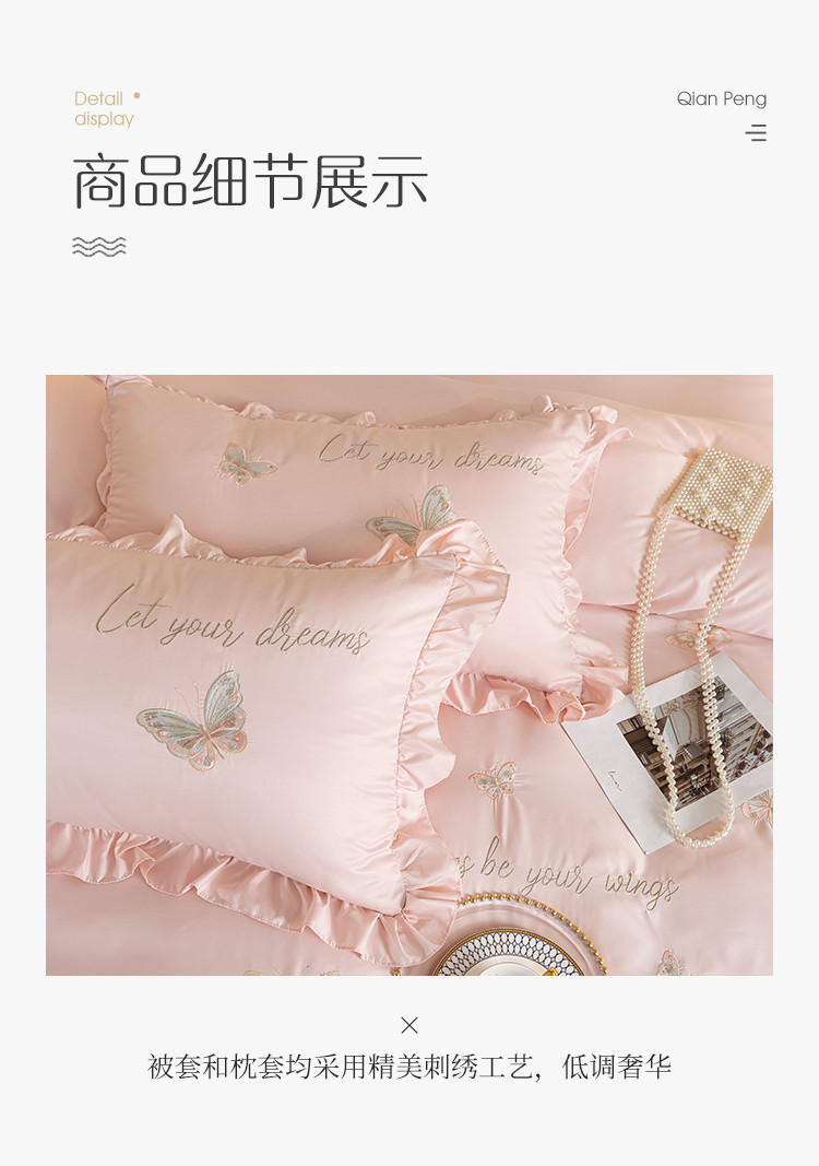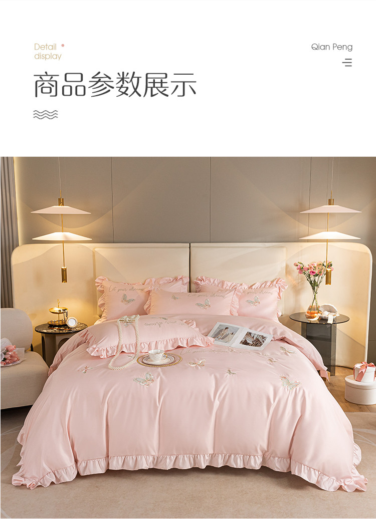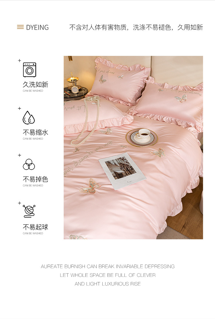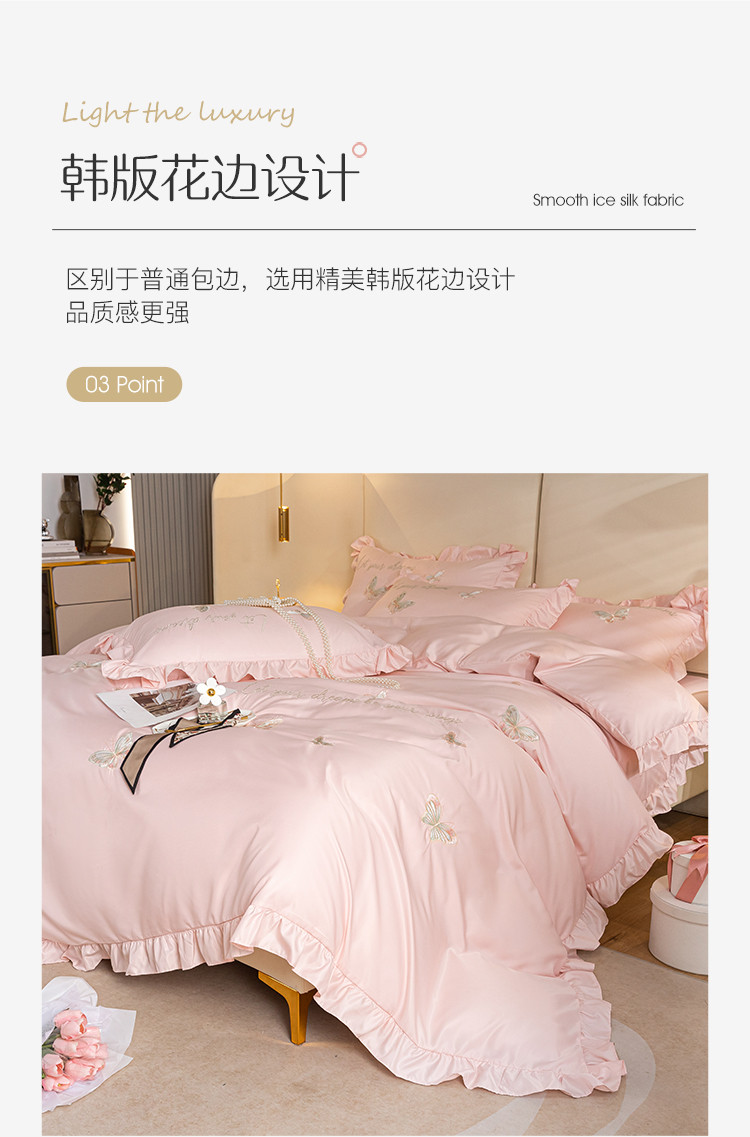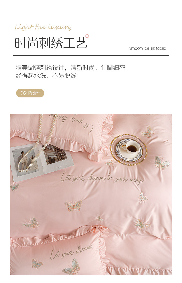 商品名称:理想家家纺 2022新款冰丝刺绣花边蝴蝶四件套 粉