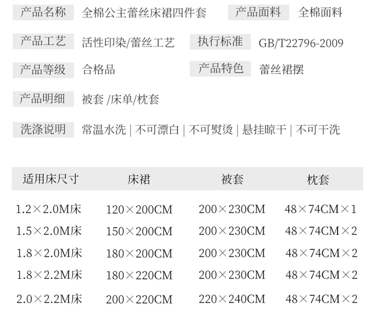 商品名称:(总)十个点 2022新款纯色全棉公主风蕾丝花边床裙四件套