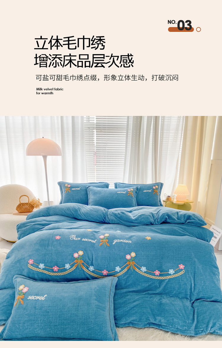 云锦22新肌理纹高克重200克牛奶绒毛巾绣四件套花开朵朵湖蓝