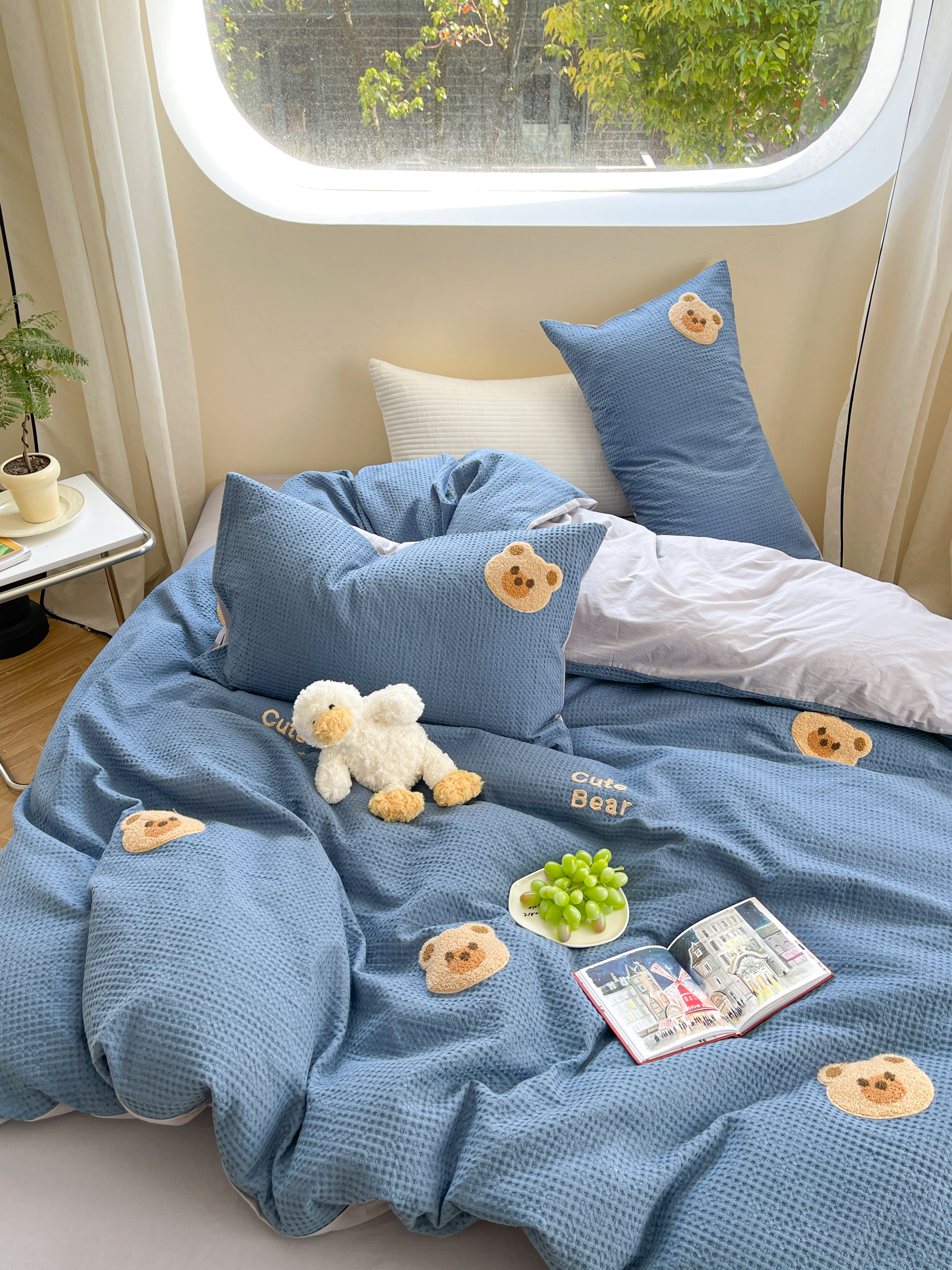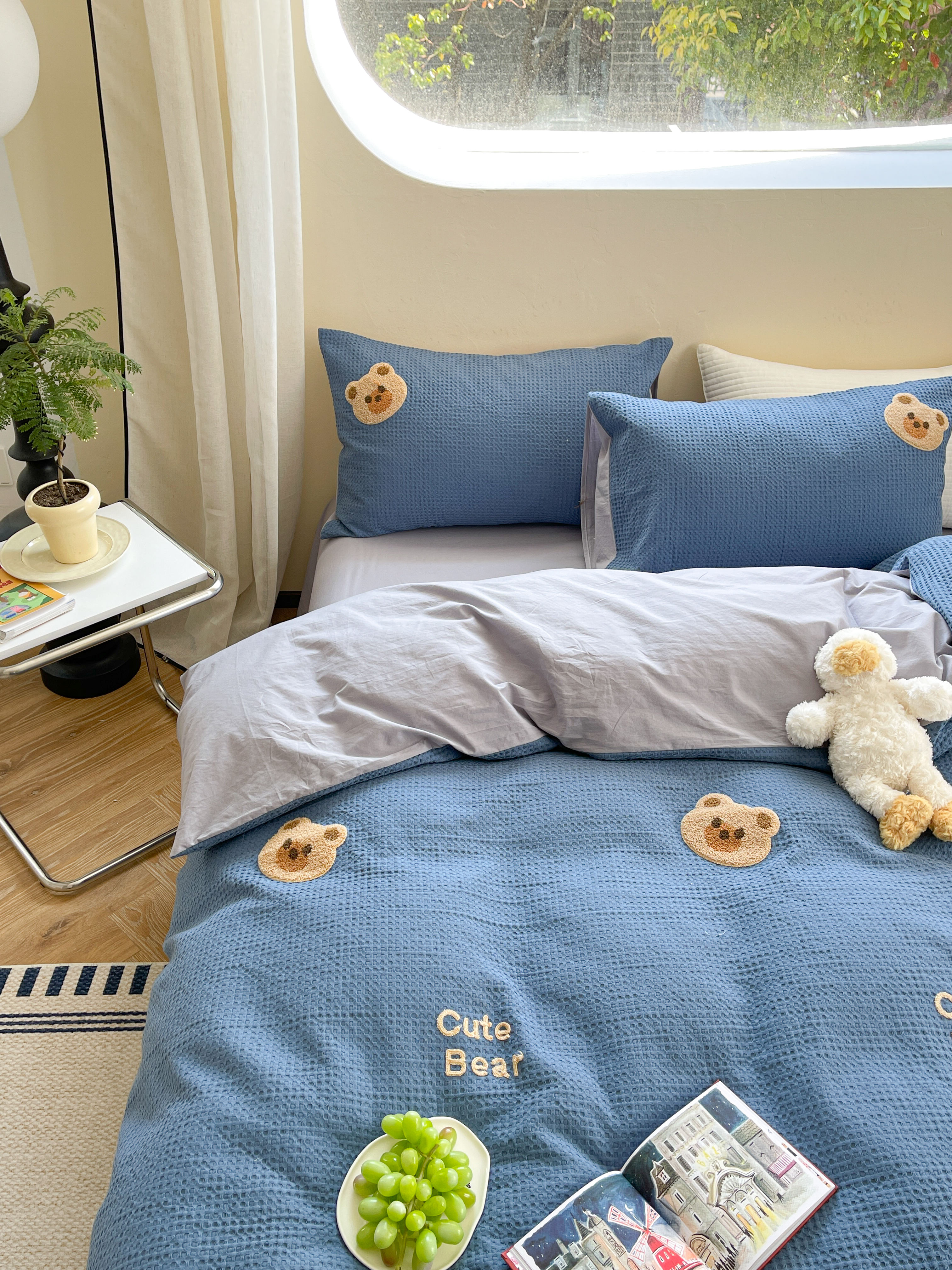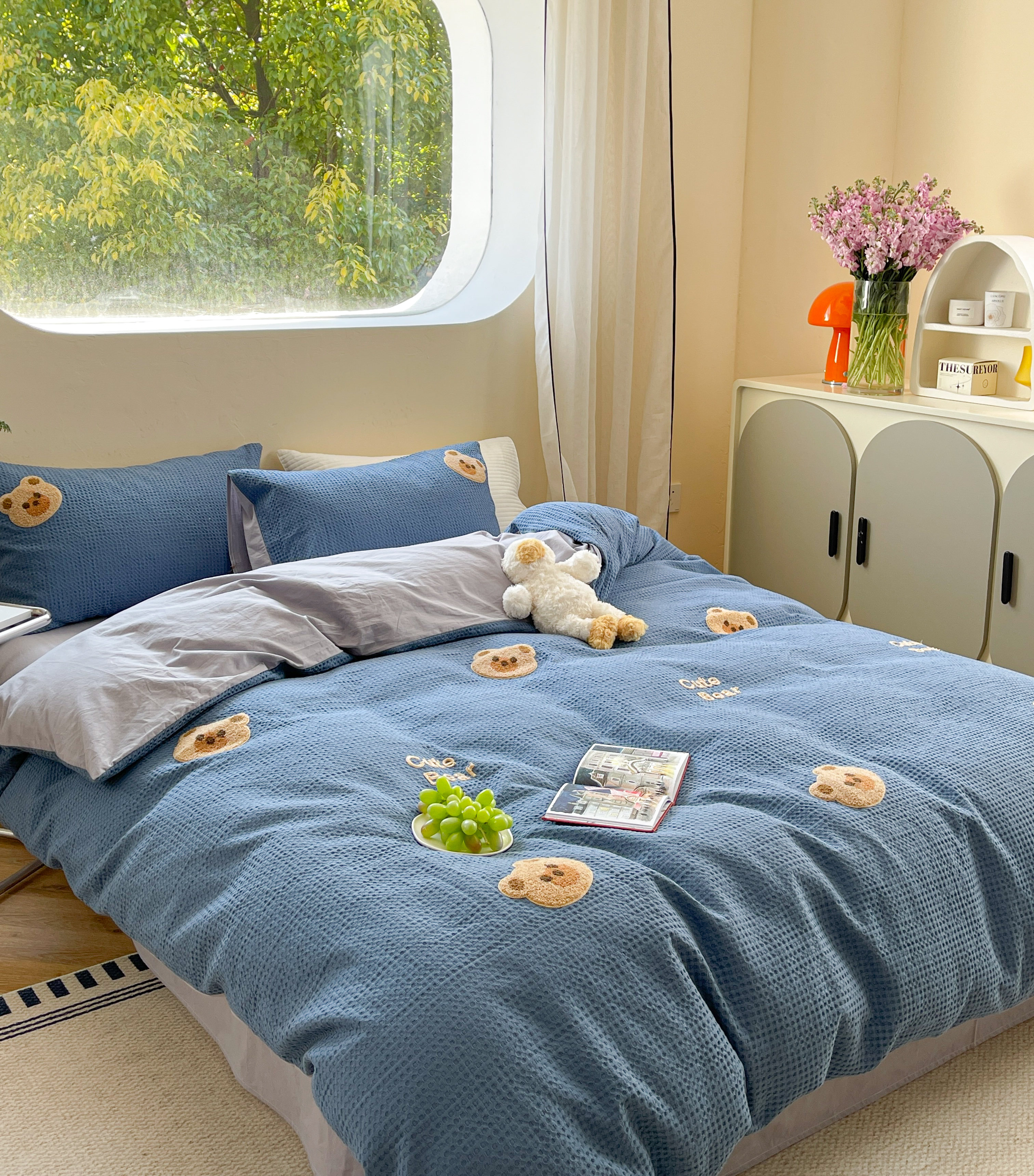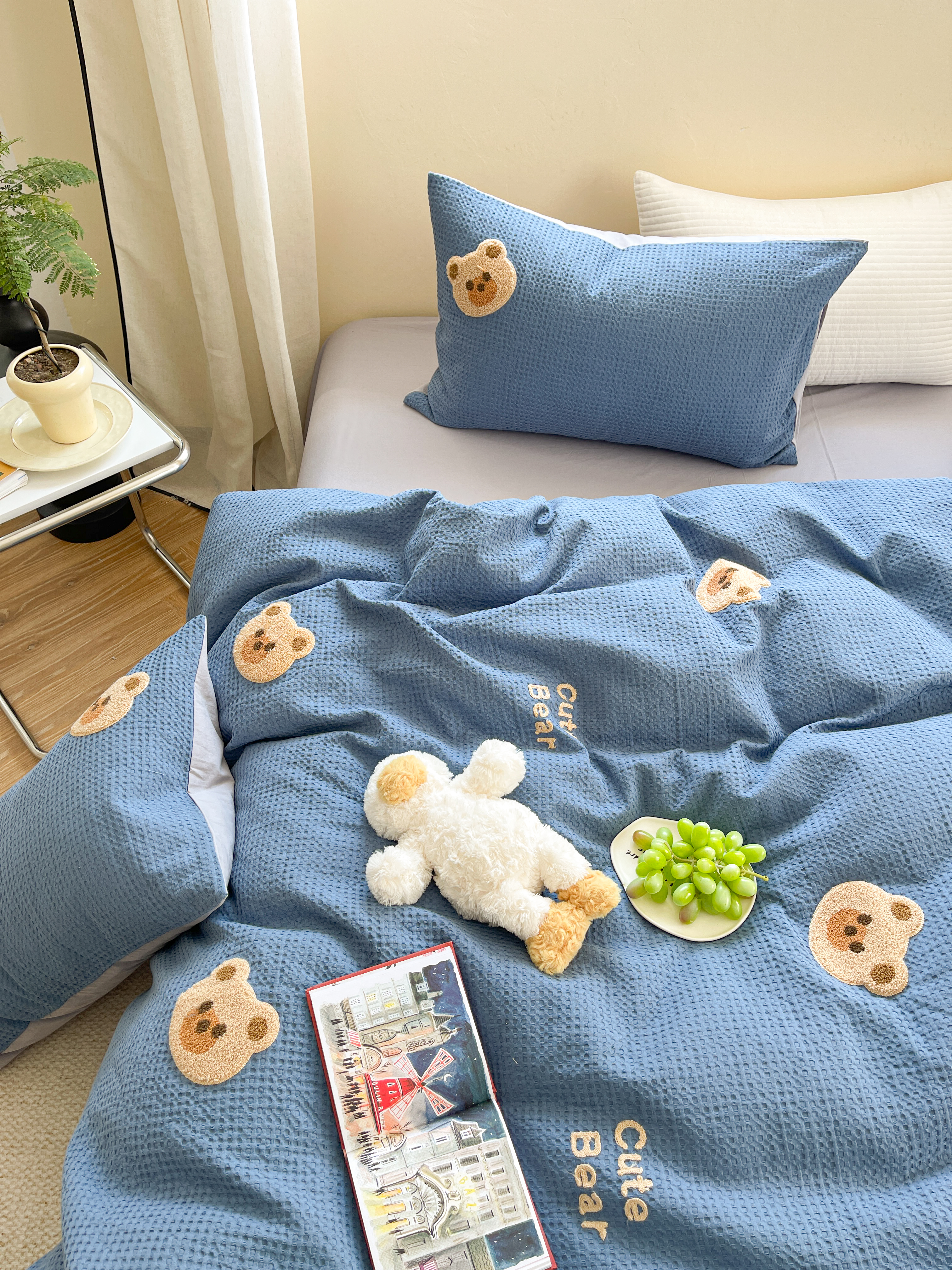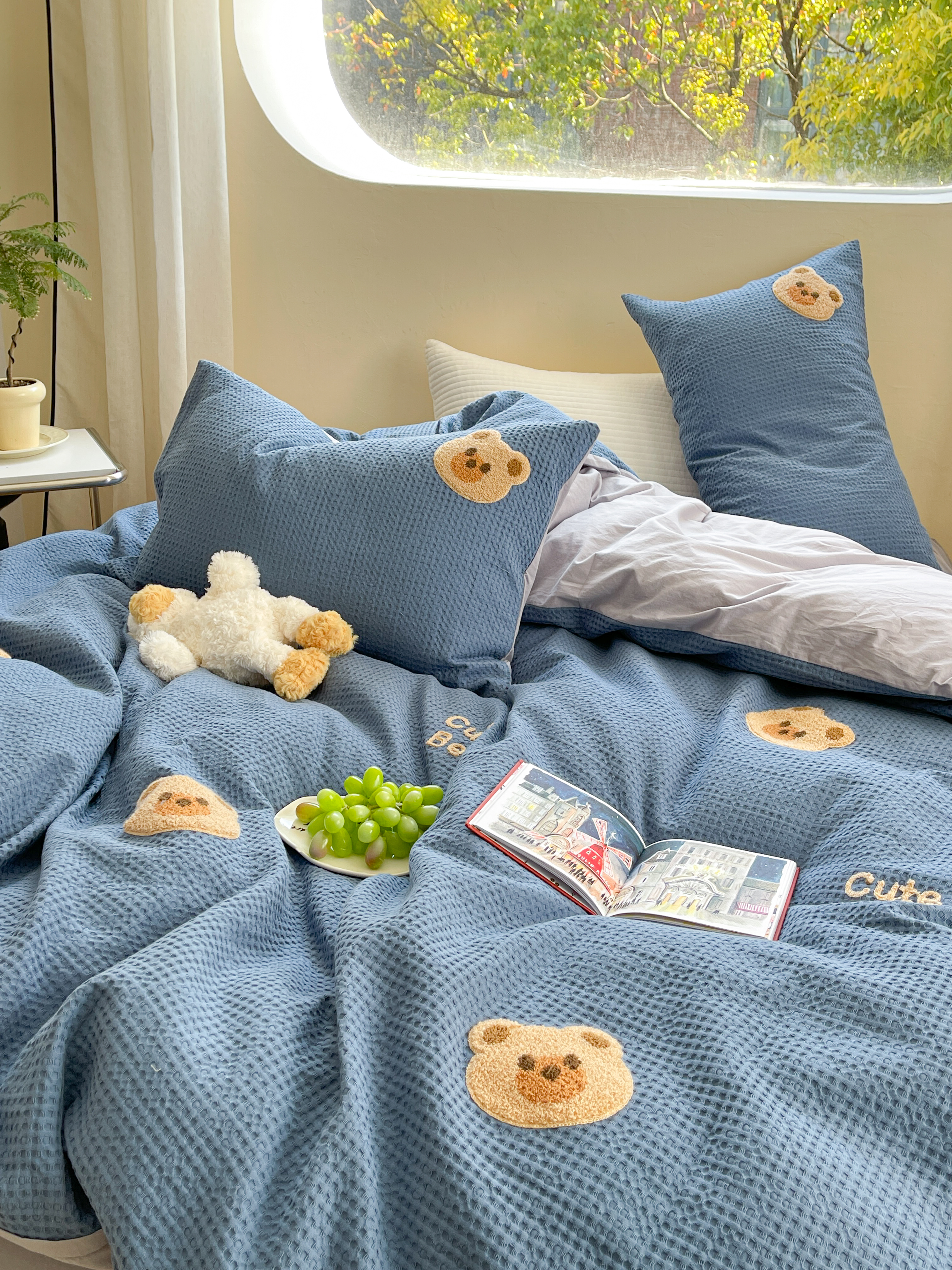商品名称:柚子 2023新款全棉高克重华夫格刺绣四件套 华夫格-小熊