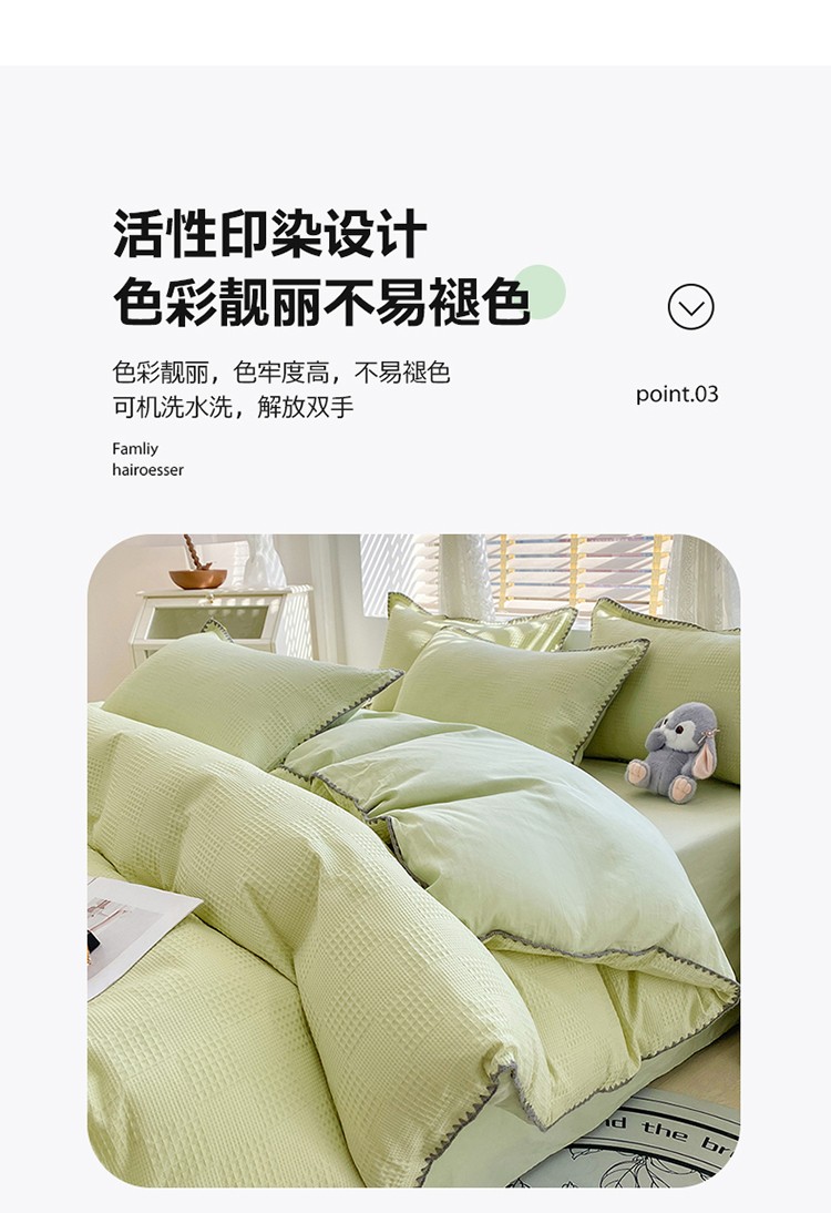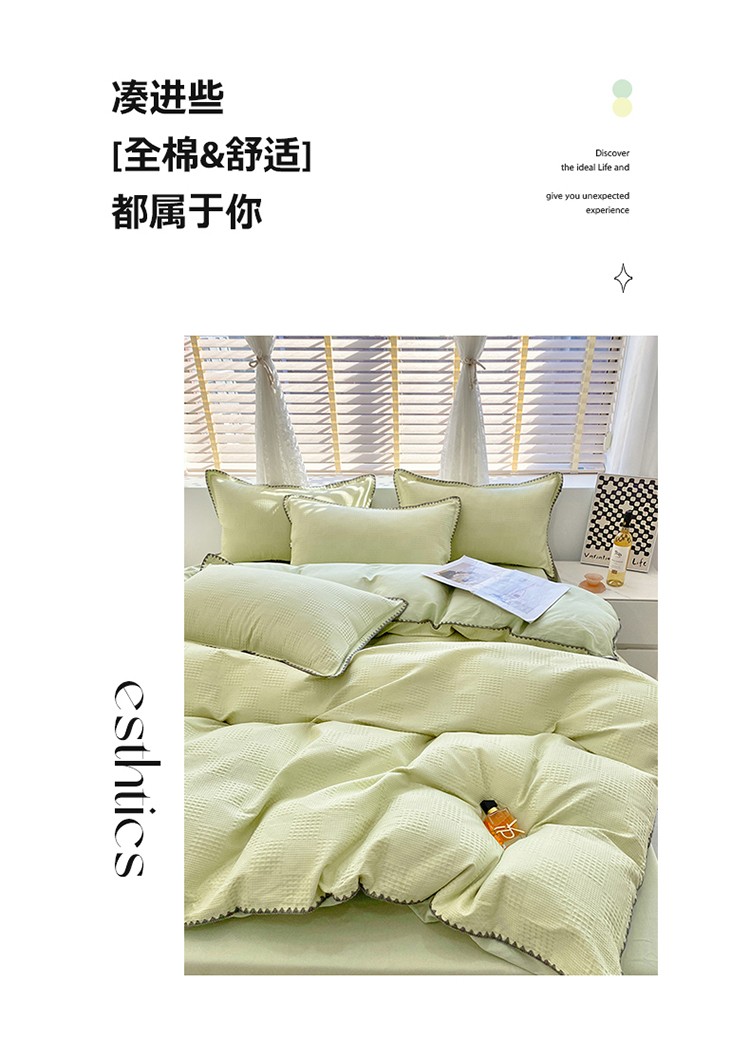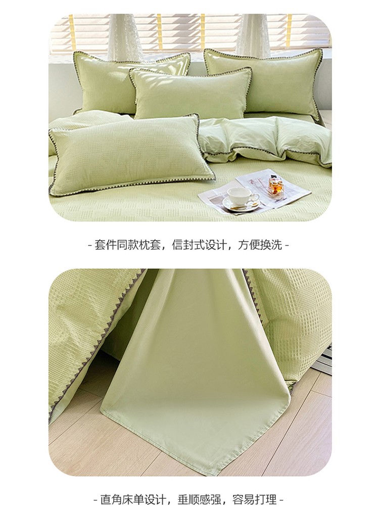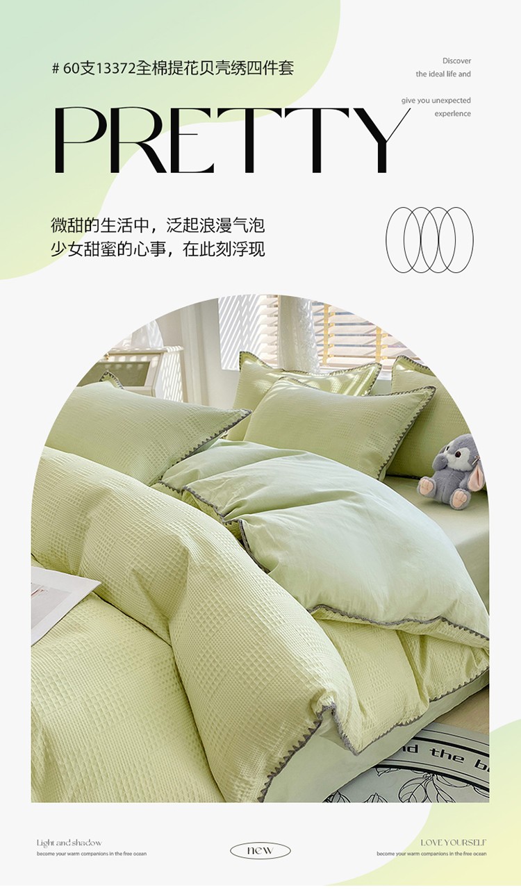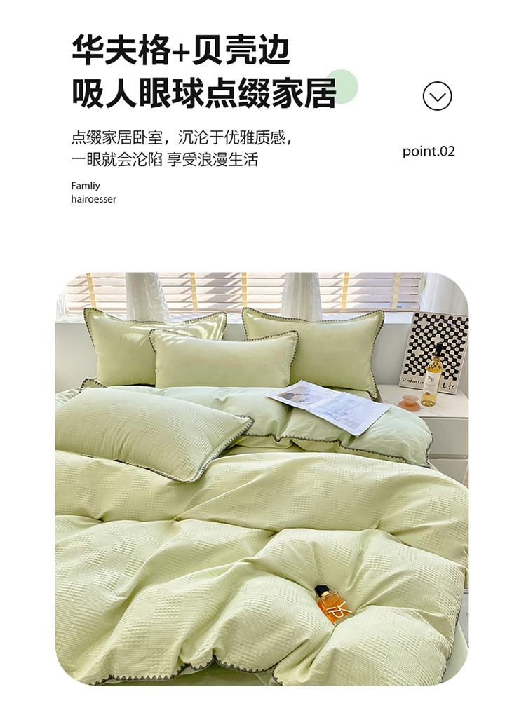 商品名称:(总)韩秀 2025新款13372纯棉大提花华夫格60s贝壳绣全棉四件套纯色丝光100长绒棉