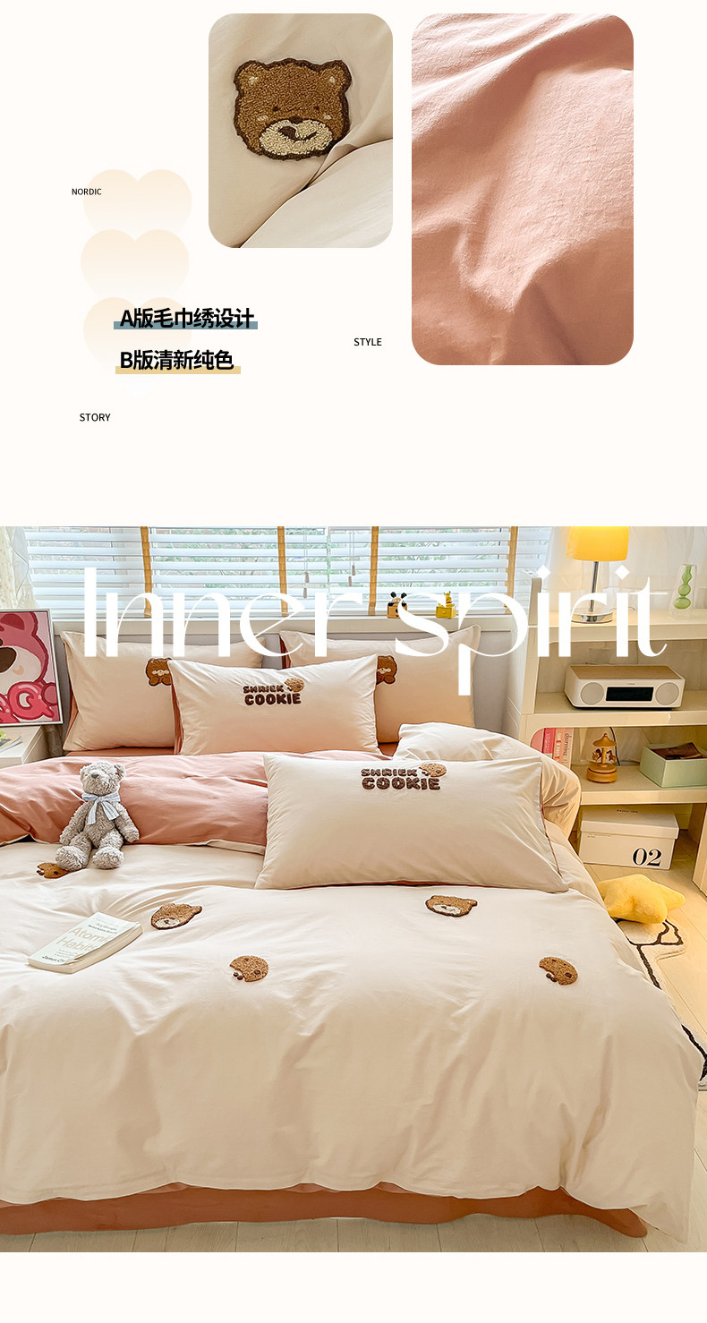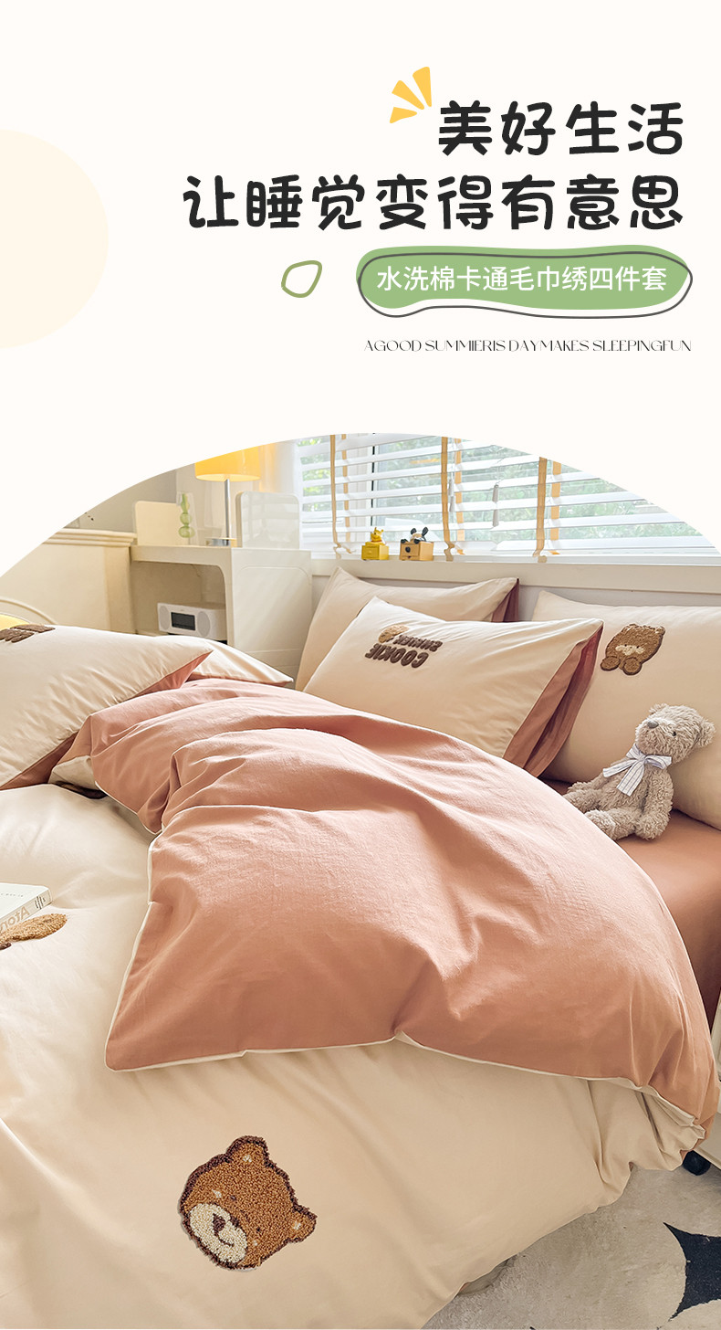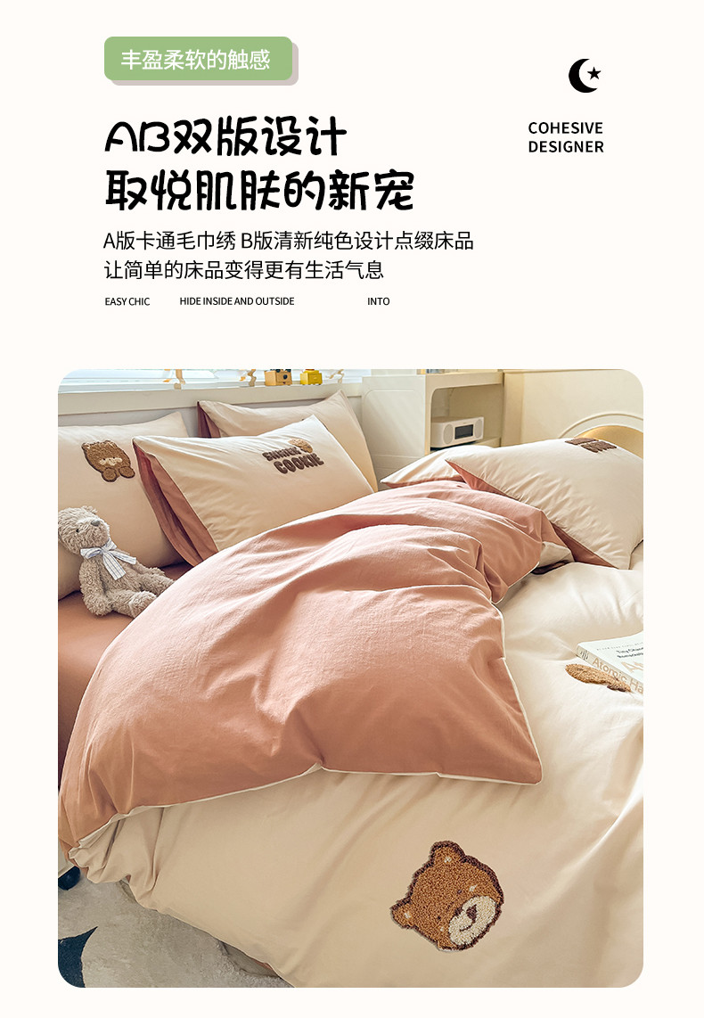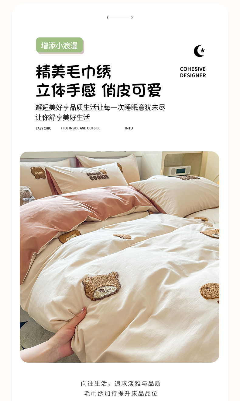 当前位置: 91家纺网 > 商品网购 > 床品套件 > 四件套 > 毛巾绣四件套 > 丽美人家纺 2023新款水洗棉卡通毛巾绣四件套 饼干熊