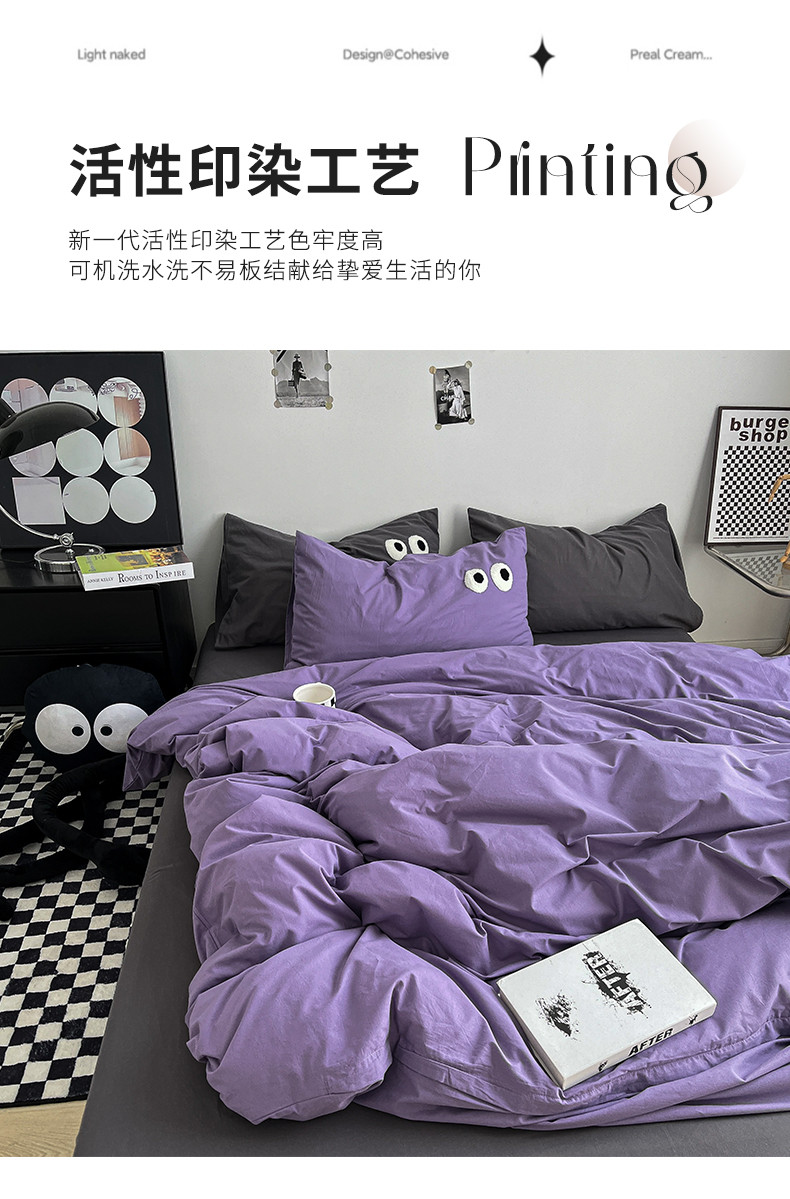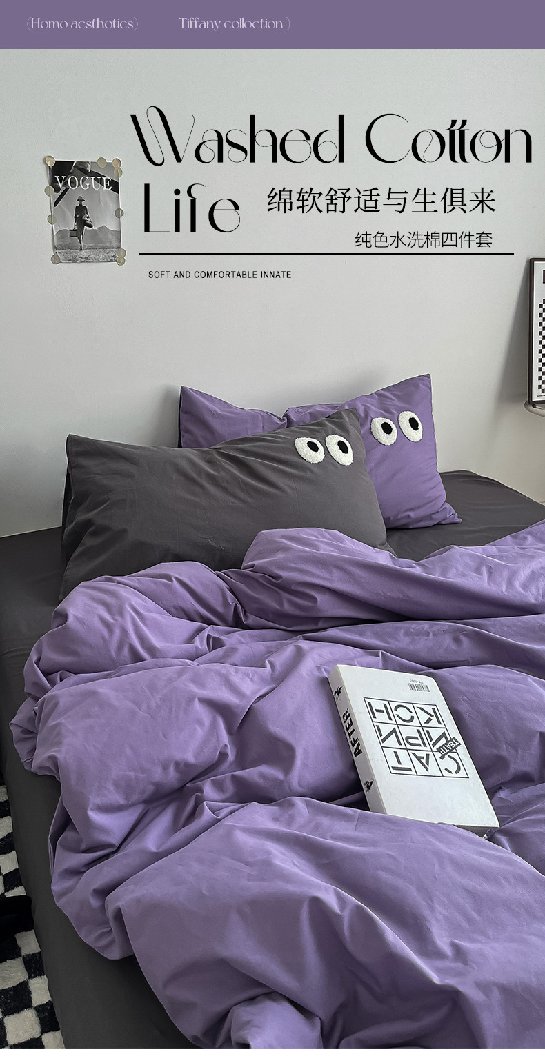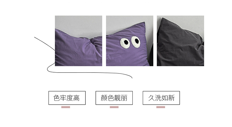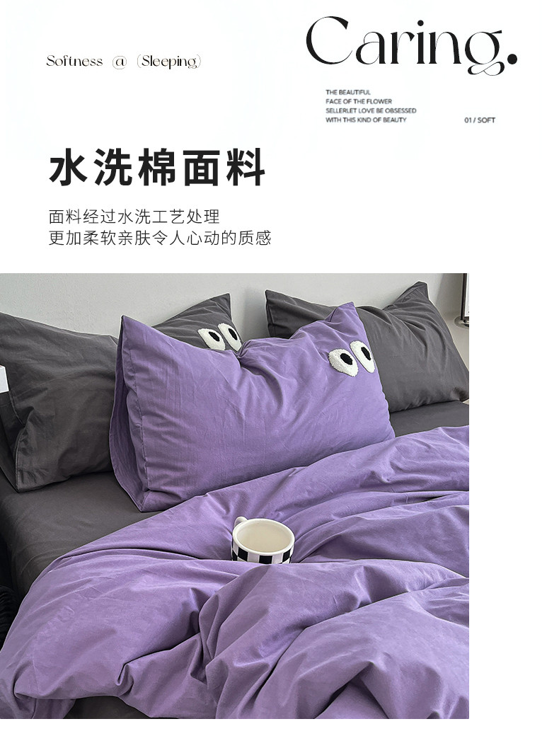当前位置: 91家纺网 > 商品网购 > 床品套件 > 四件套 > 水洗棉四件套 > 盼季家纺 2023新款纯色水洗棉大眼睛煤球四件套 大眼-紫黑混搭