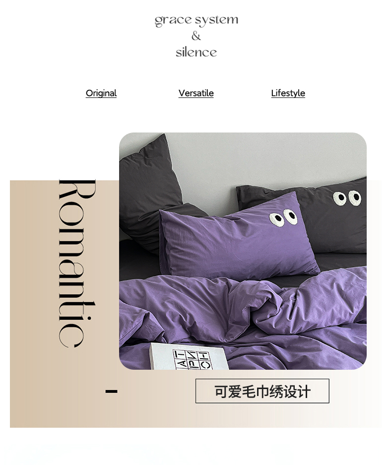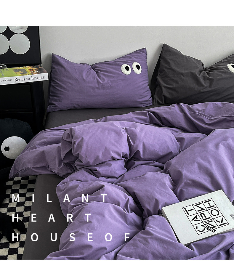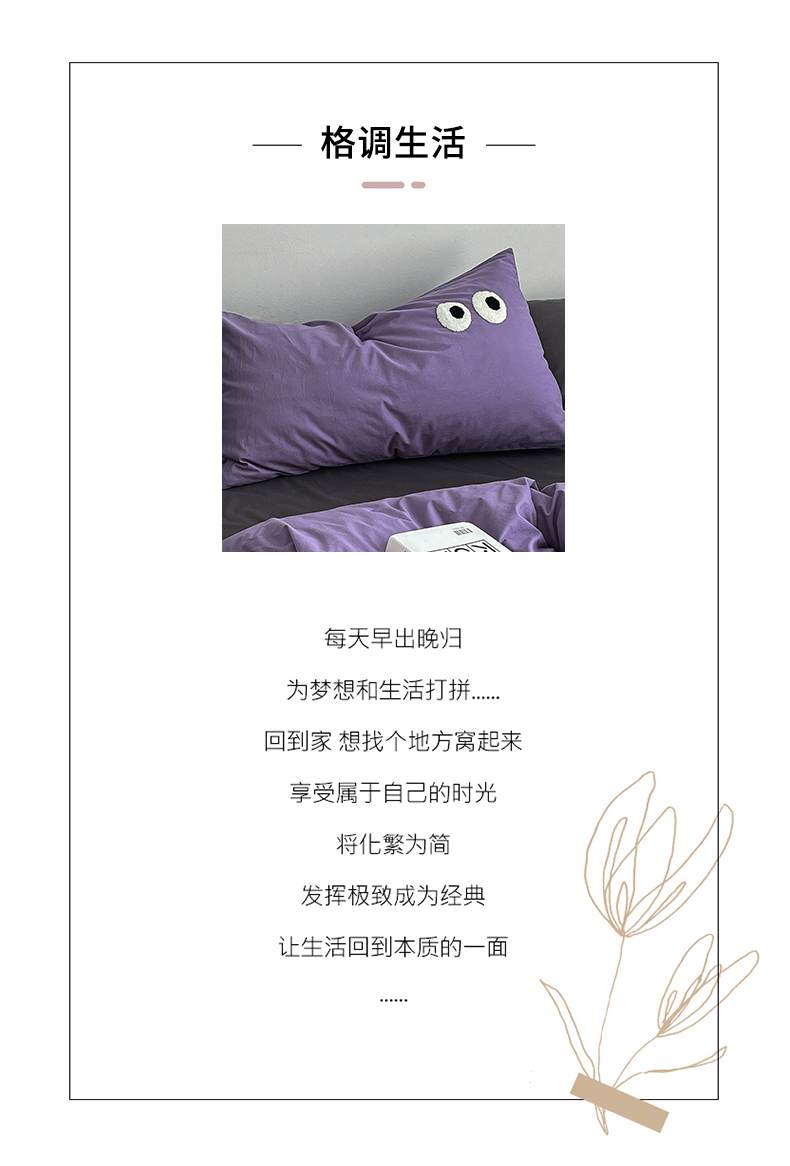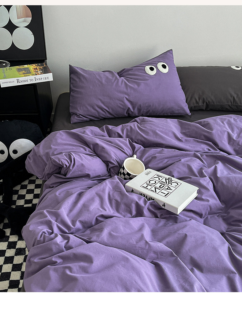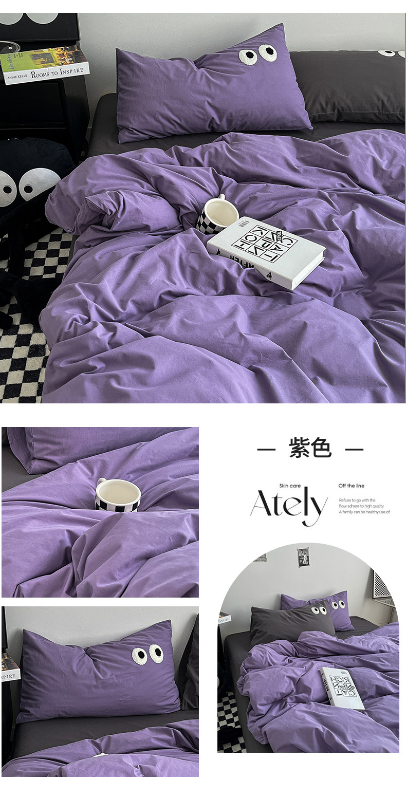 当前位置: 91家纺网 > 商品网购 > 床品套件 > 四件套 > 水洗棉四件套 > 盼季家纺 2023新款纯色水洗棉大眼睛煤球四件套 大眼-紫黑混搭