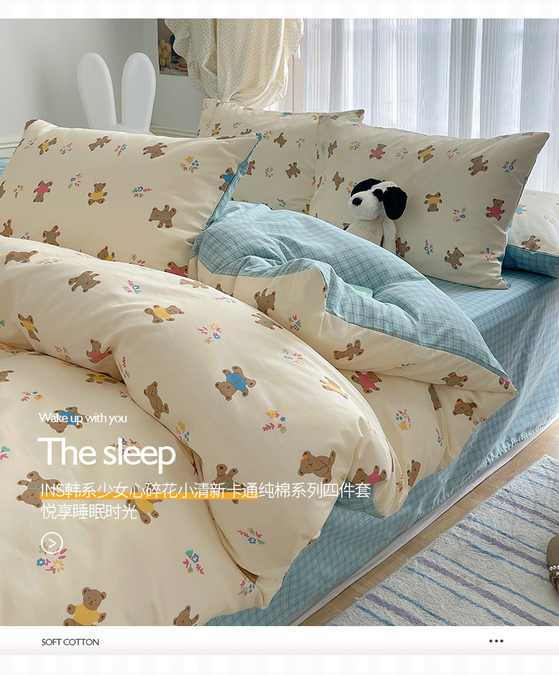 桃子 2023新款ins韩系少女心碎花小清新卡通纯棉系列四件套 棉-饼干熊