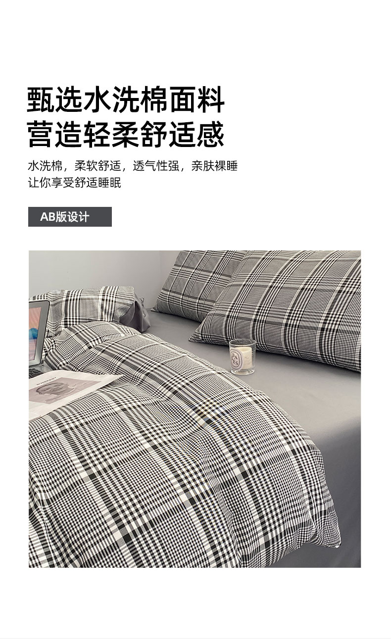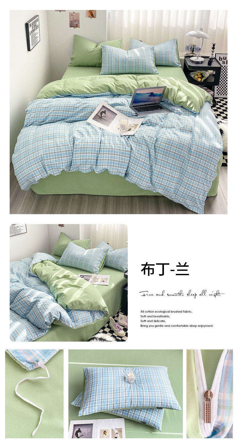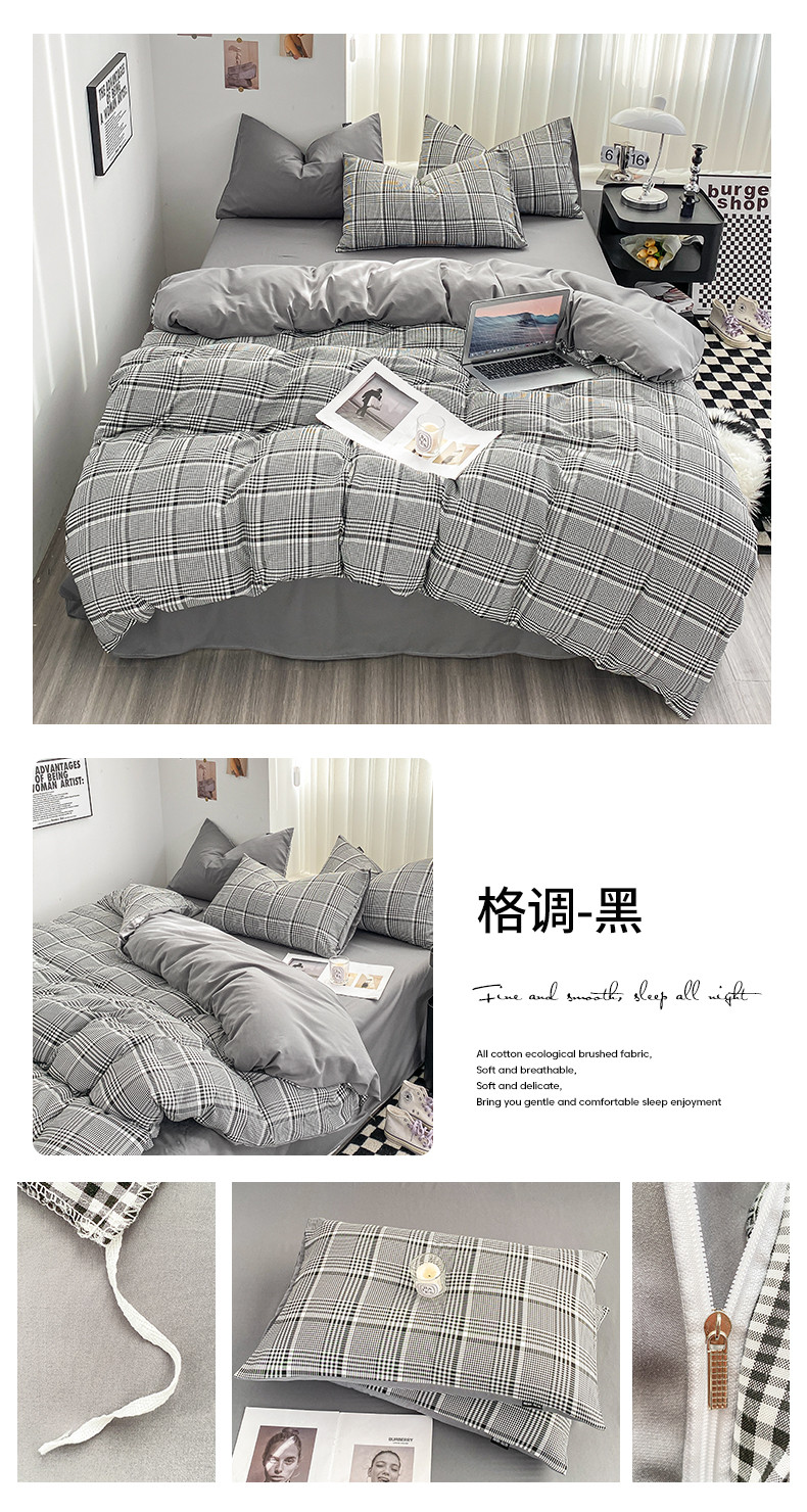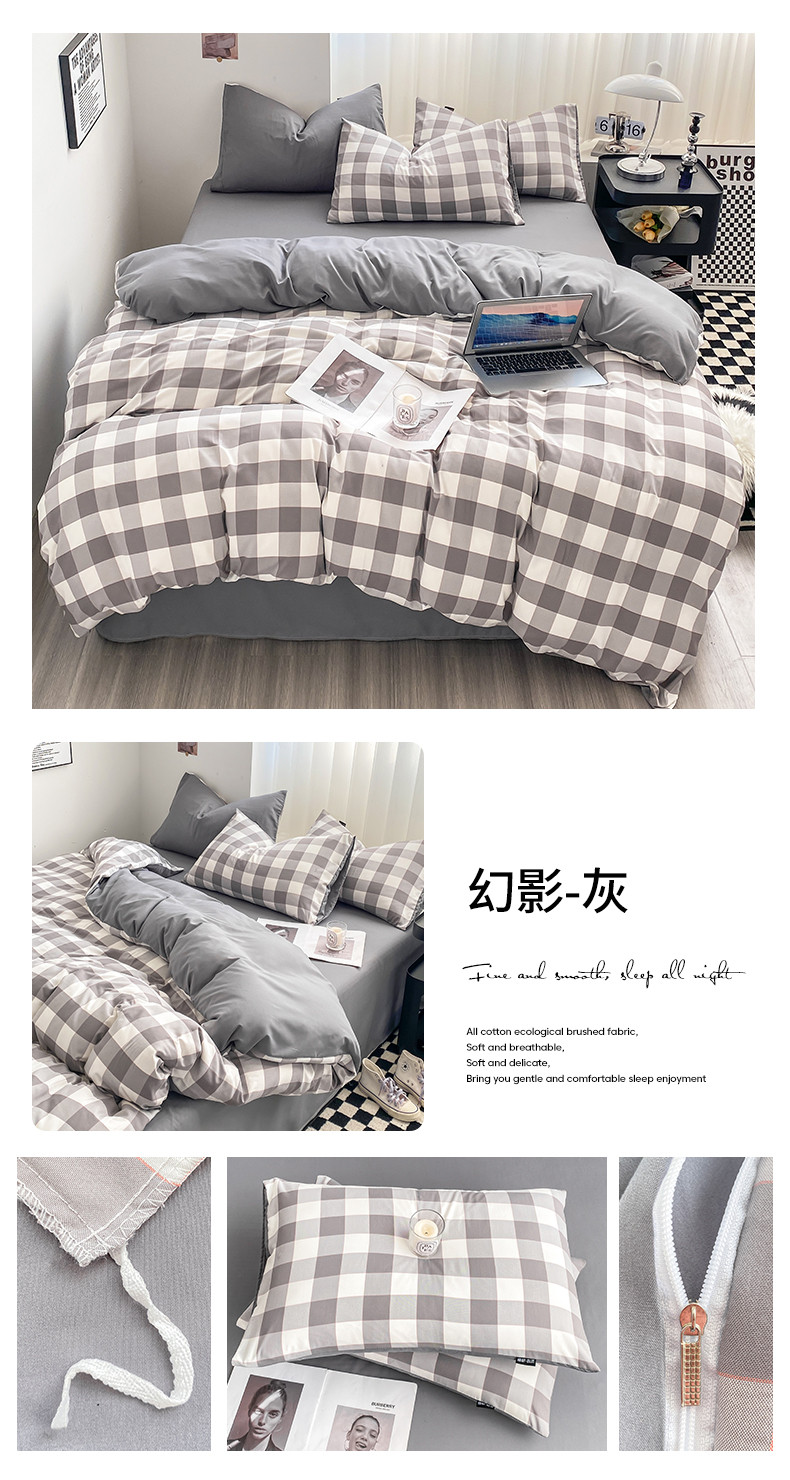 (总)水洗棉色织格子无印风三件套纯色双拼磨毛被套四件套