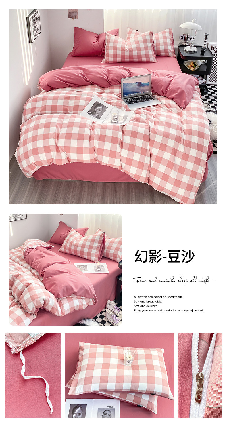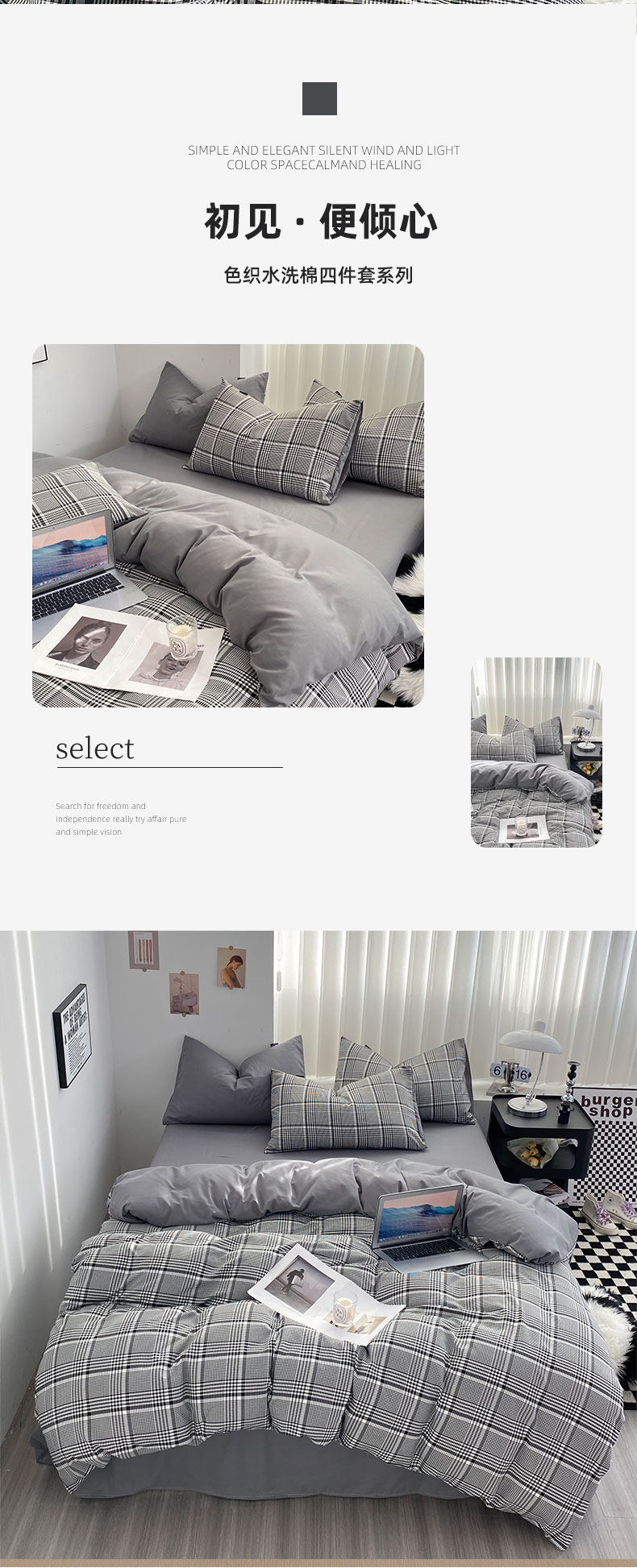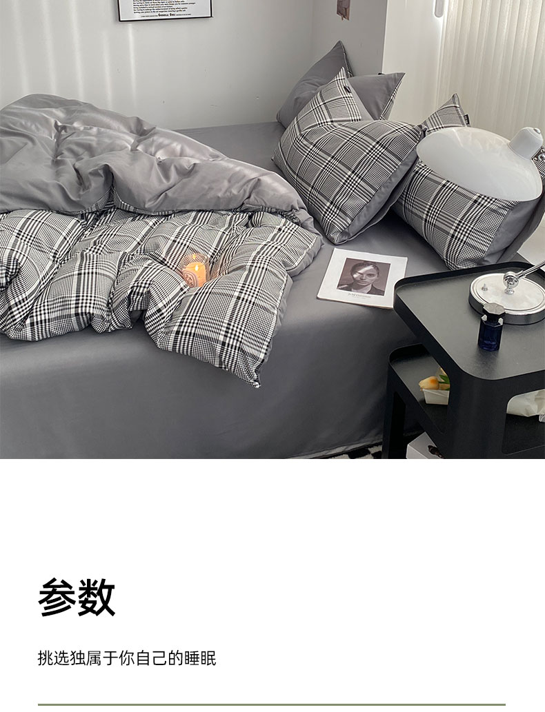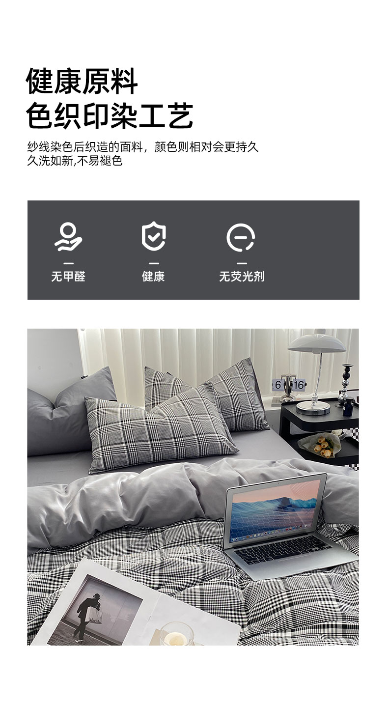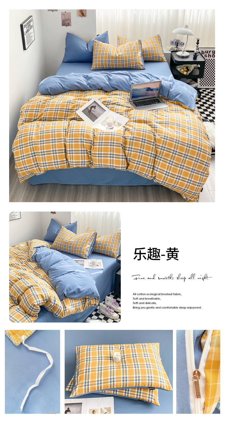 (总)水洗棉色织格子无印风三件套纯色双拼磨毛被套四件套