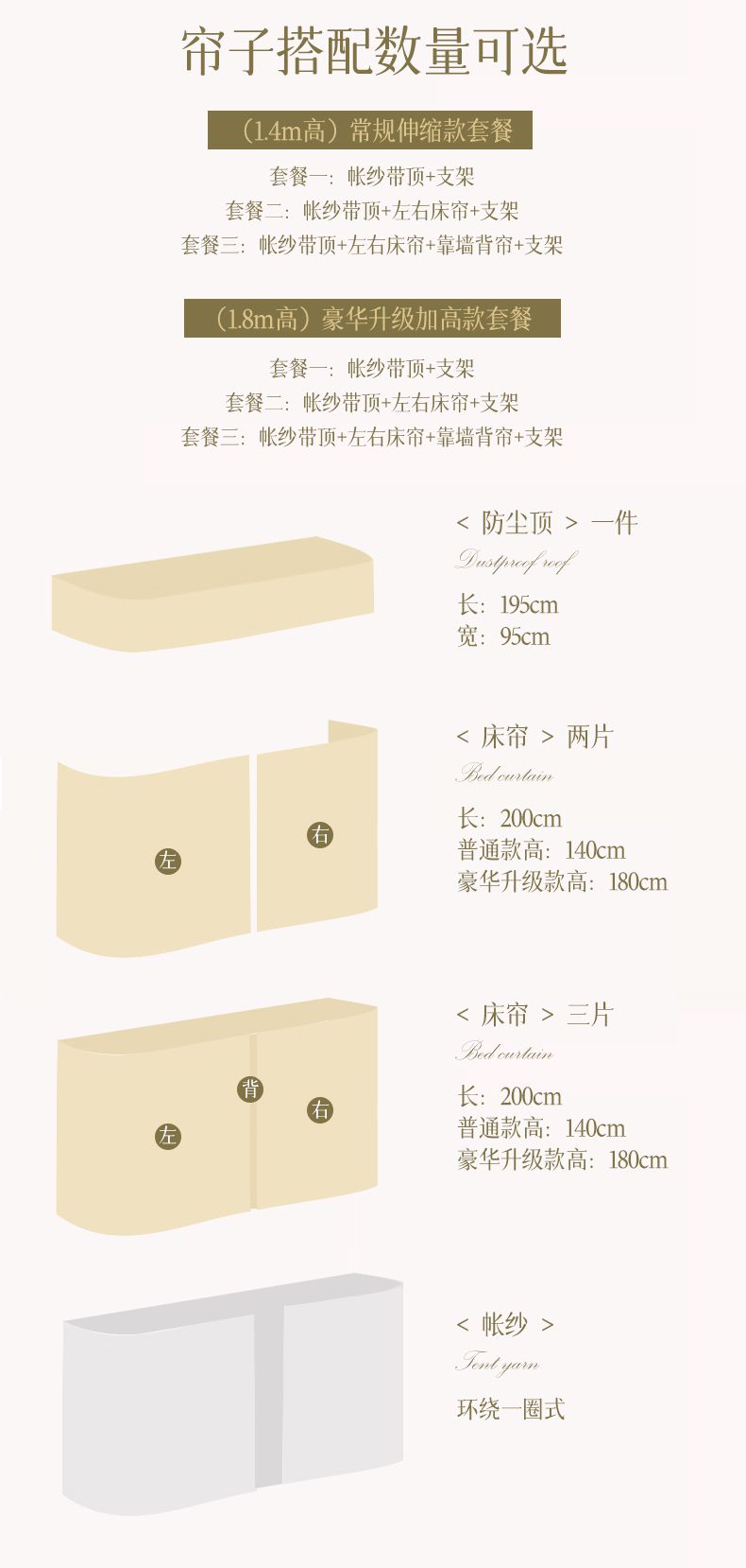 套餐三(1.8高) 蚊帐带顶+左右帘+靠墙帘+支架 | ¥265.00 |