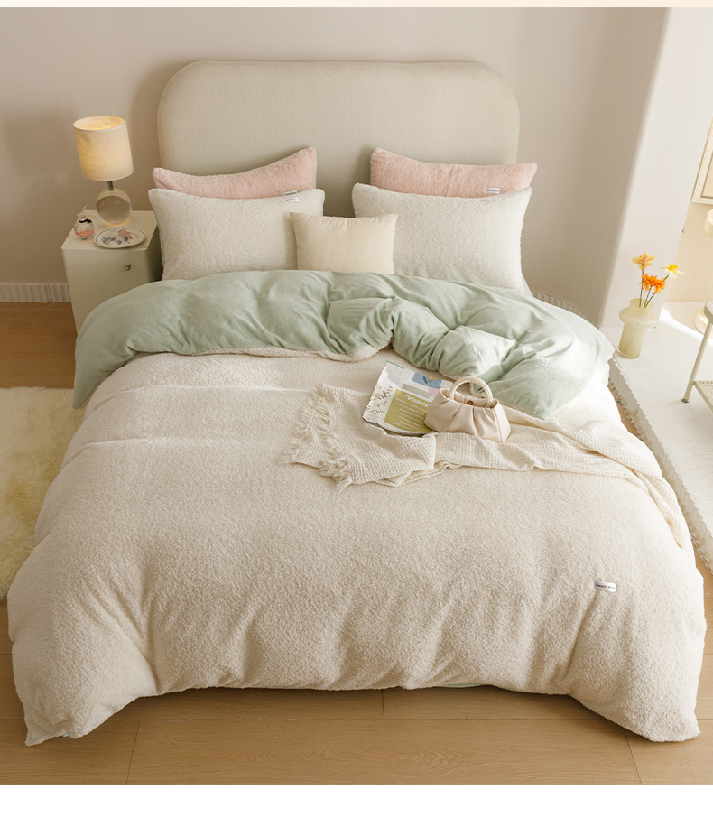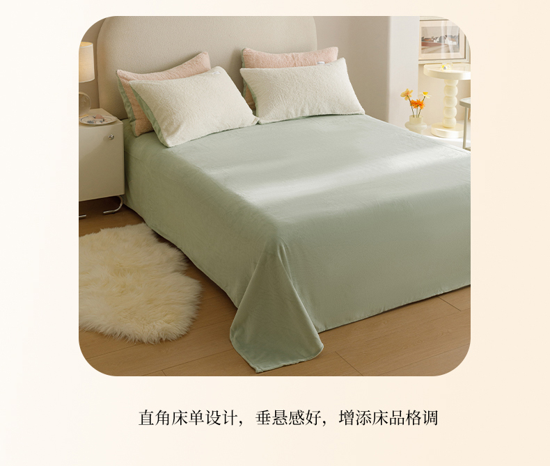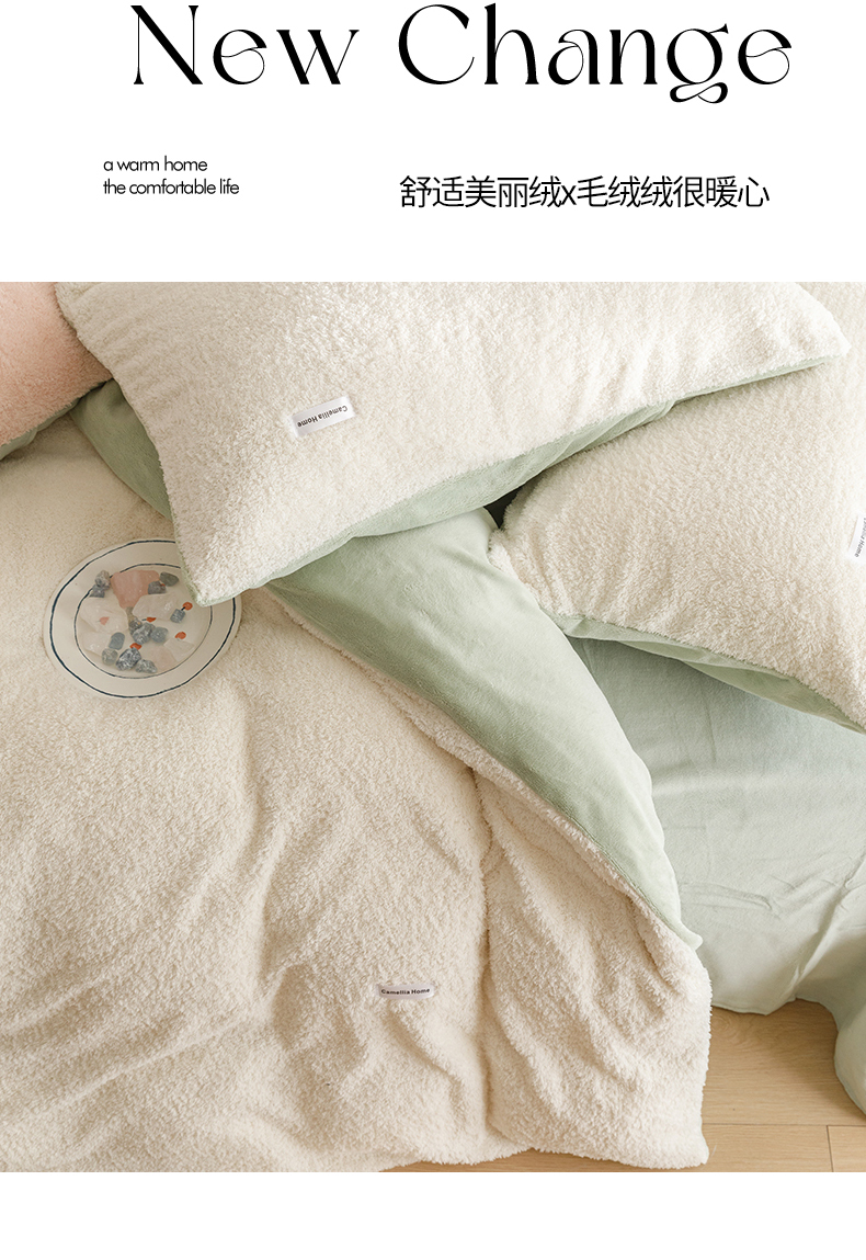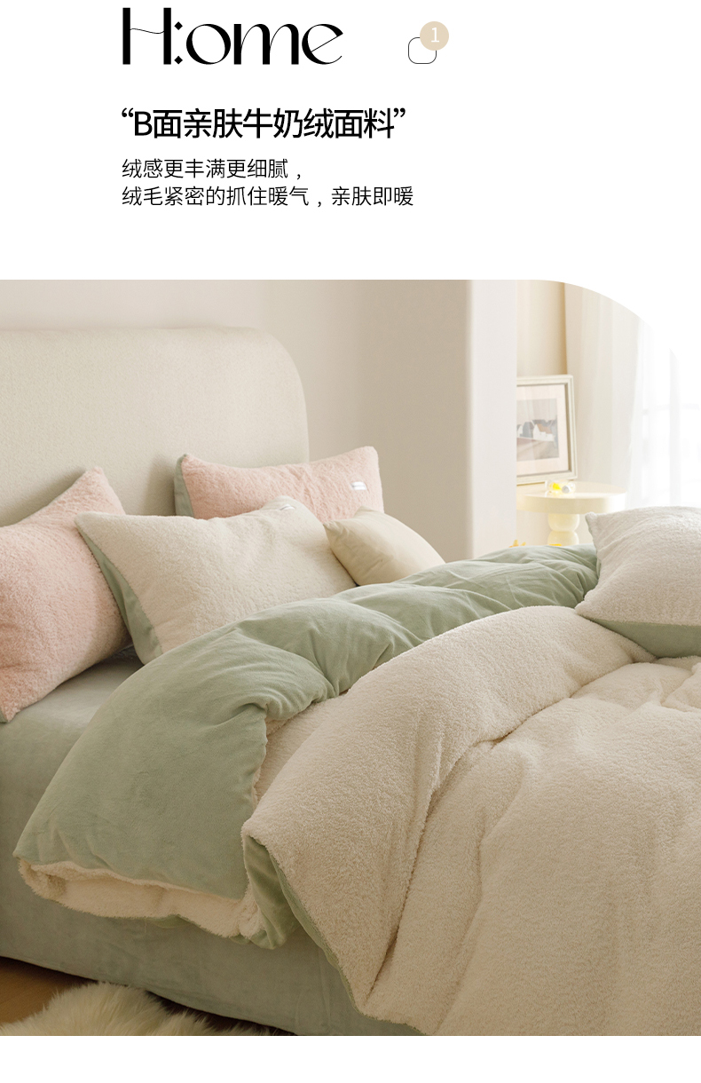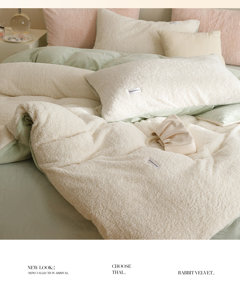 当前位置: 91家纺网 > 商品网购 > 床品套件 > 四件套 > 牛奶绒四件套 > 2023新款小清新纯色双拼美丽绒牛奶绒四件套 奶白拼果绿