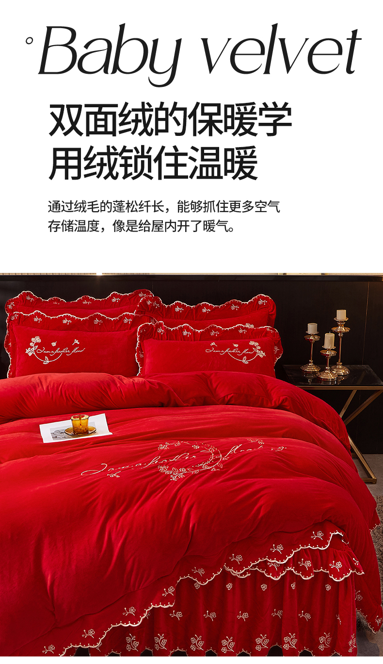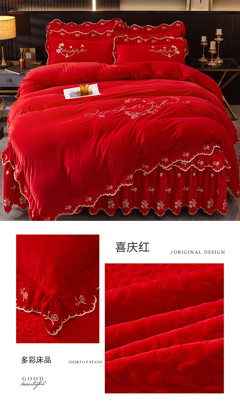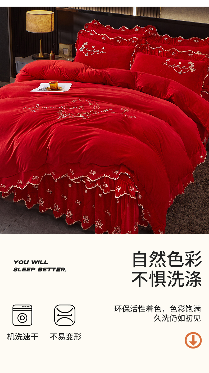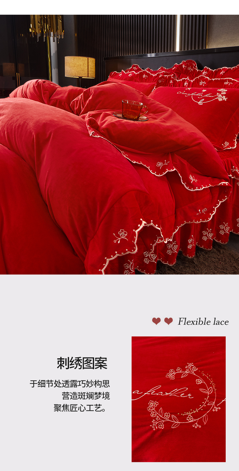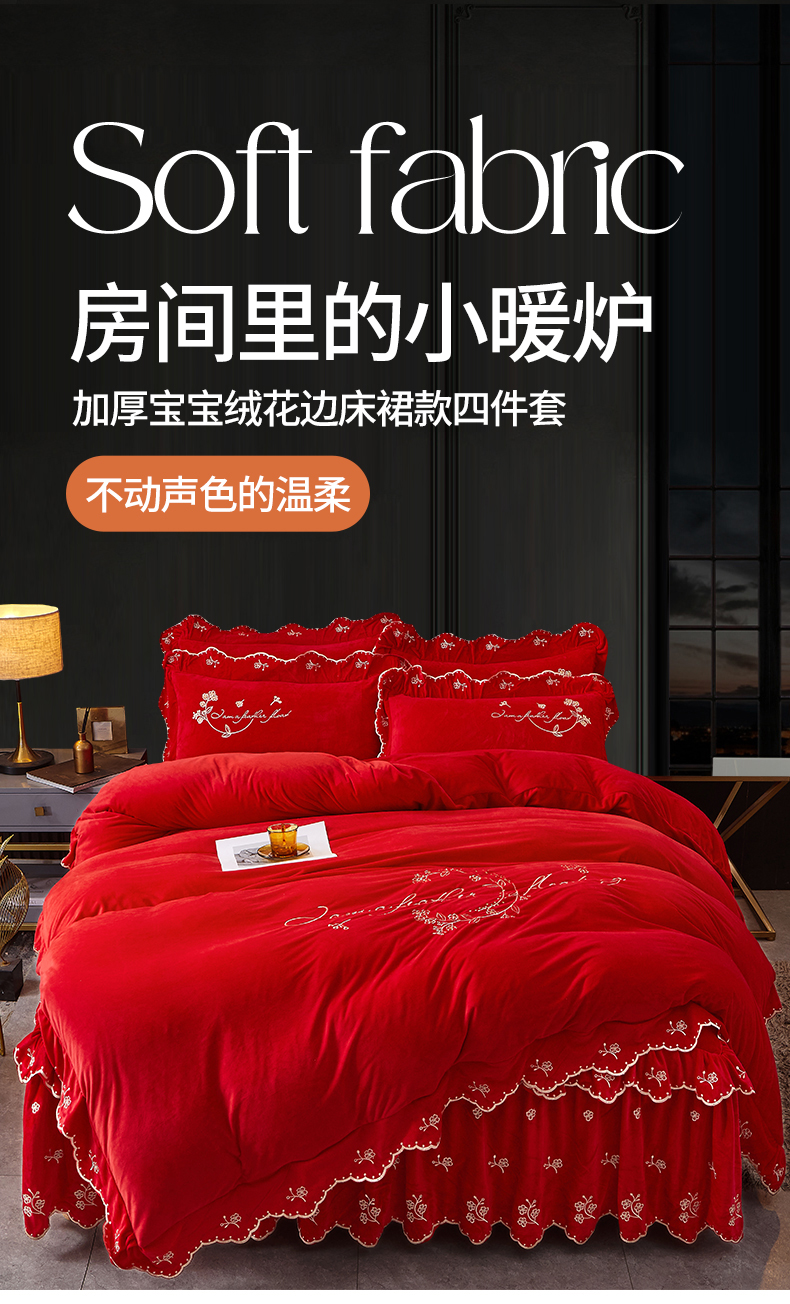 当前位置: 91家纺网 > 商品网购 > 床品套件 > 四件套 > 宝宝绒四件套 > 2023 恒爱家纺 花好月圆宝宝绒床裙四件套 喜庆红