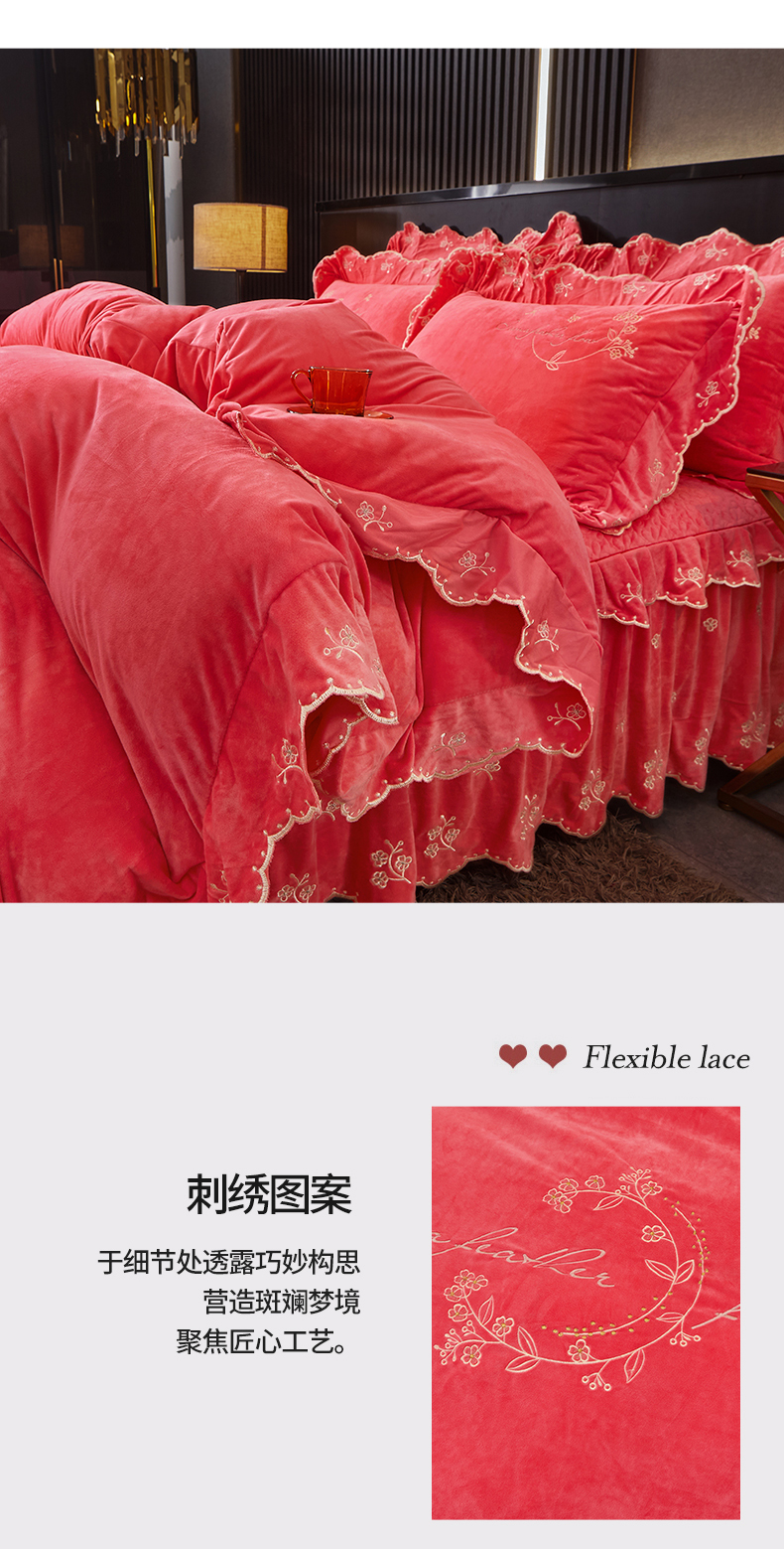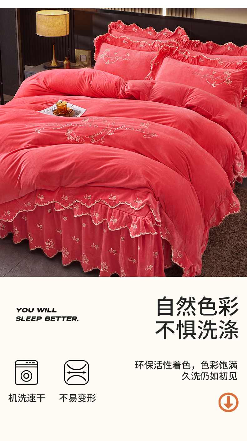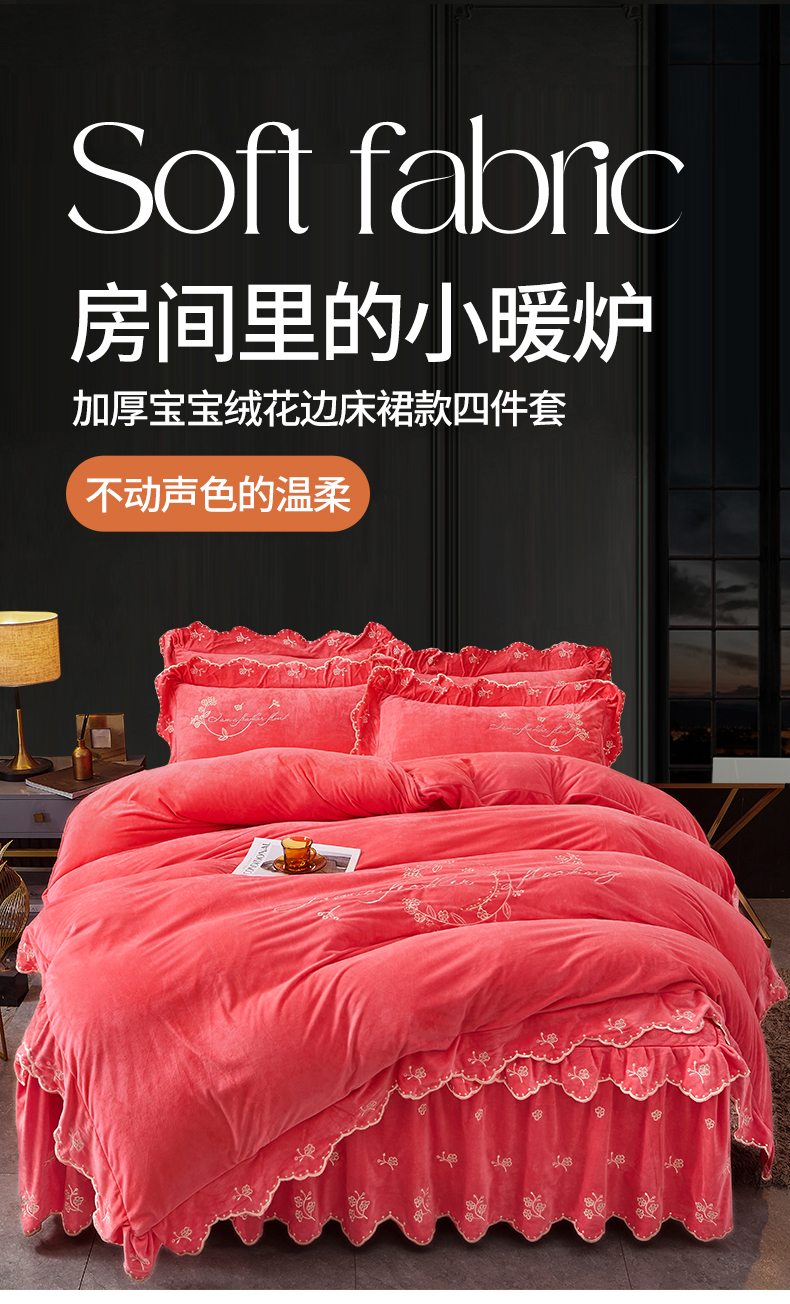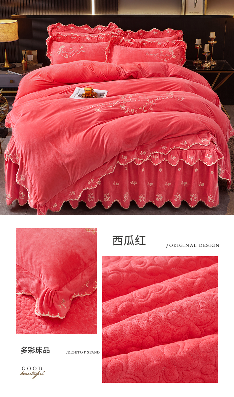当前位置: 91家纺网 > 商品网购 > 床品套件 > 四件套 > 宝宝绒四件套 > 2023 恒爱家纺 花好月圆宝宝绒床裙四件套 西瓜红
