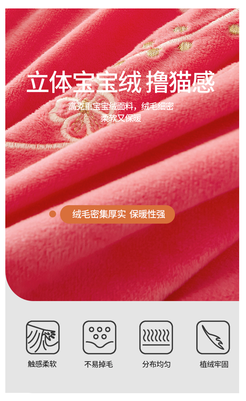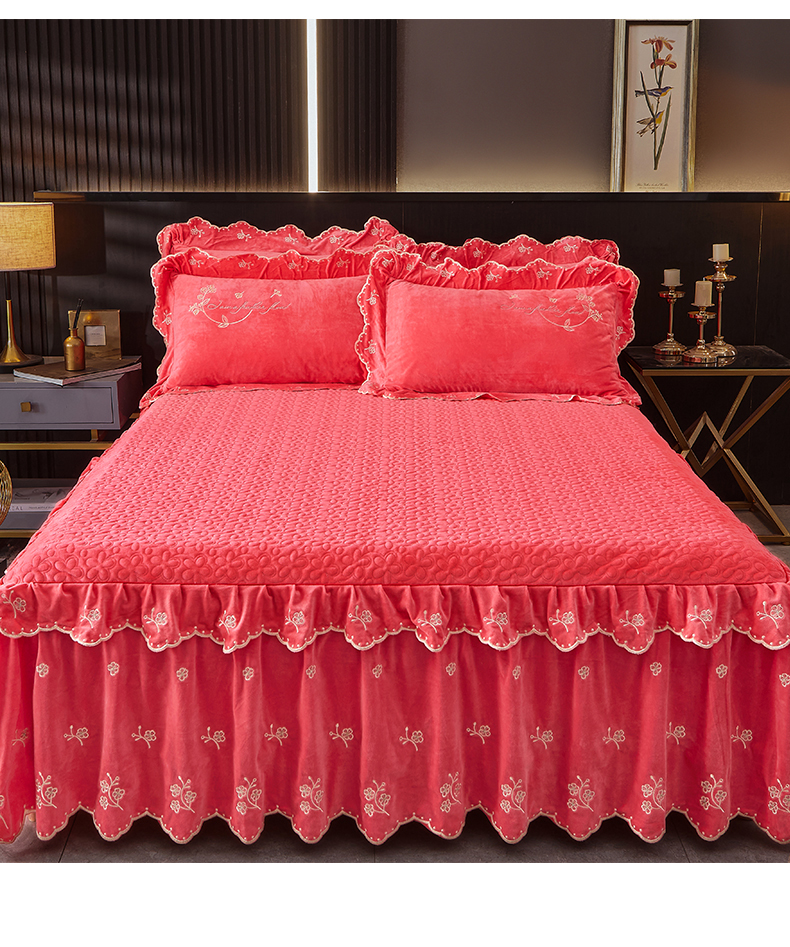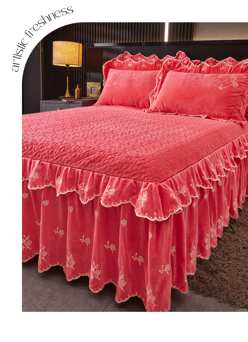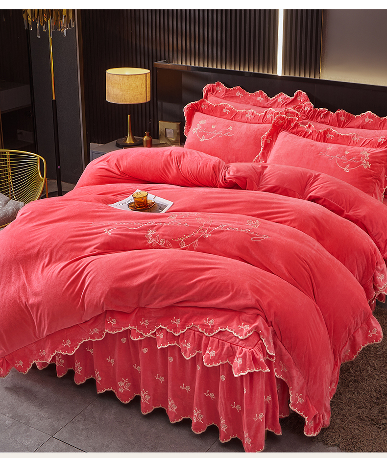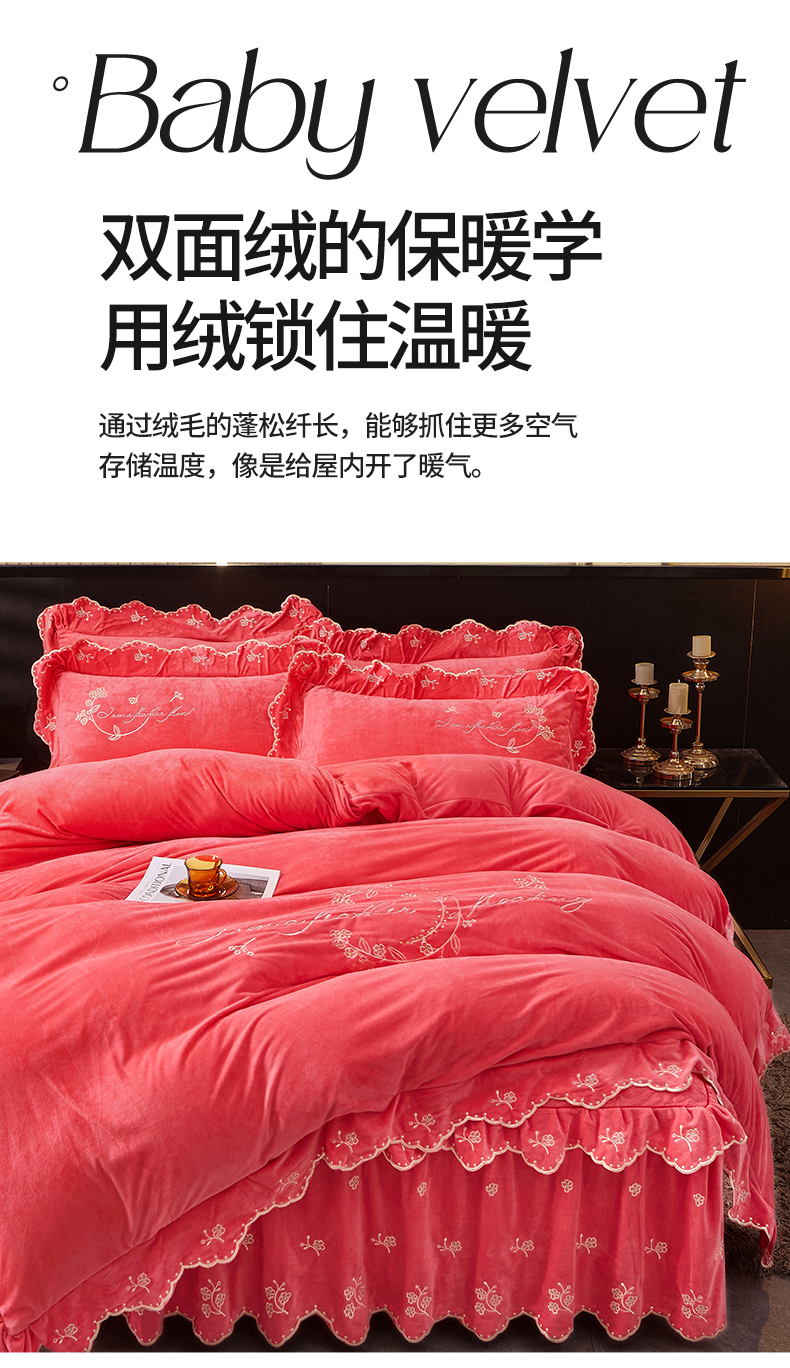 当前位置: 91家纺网 > 商品网购 > 床品套件 > 四件套 > 宝宝绒四件套 > 2023 恒爱家纺 花好月圆宝宝绒床裙四件套 西瓜红