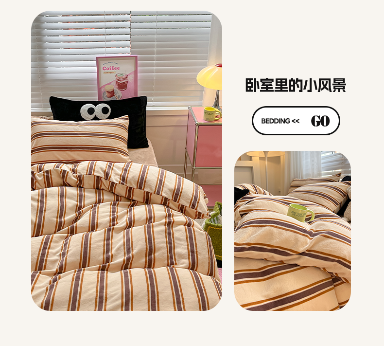 商品名称:雅居纺家纺 2023新款毛巾绣混搭牛奶绒四件套 混搭咖条