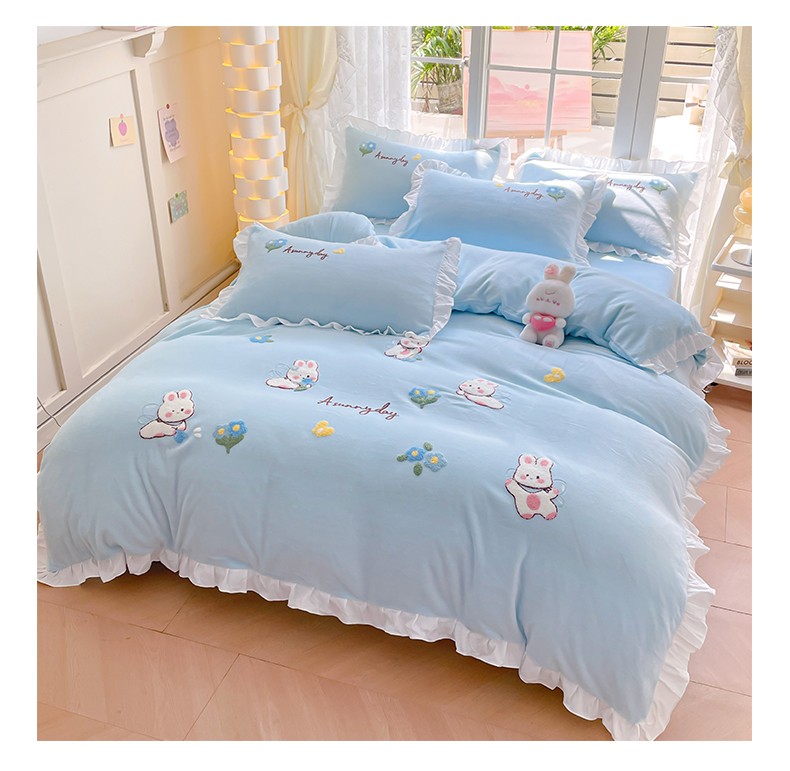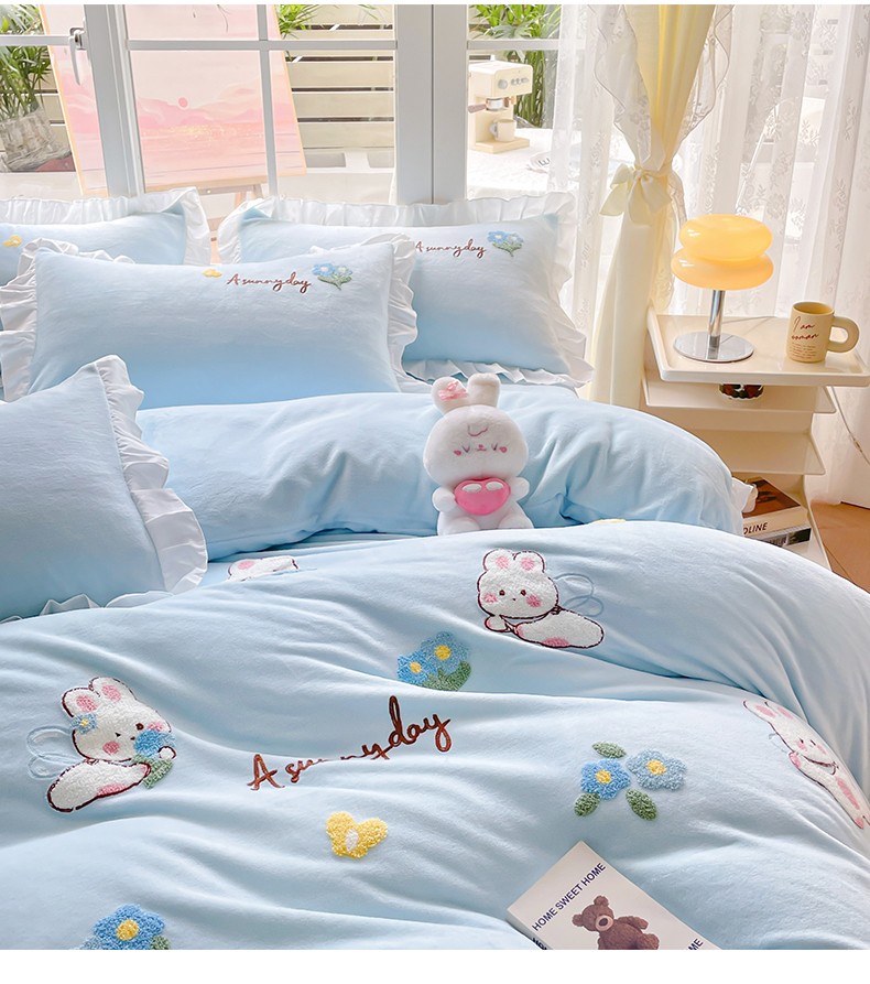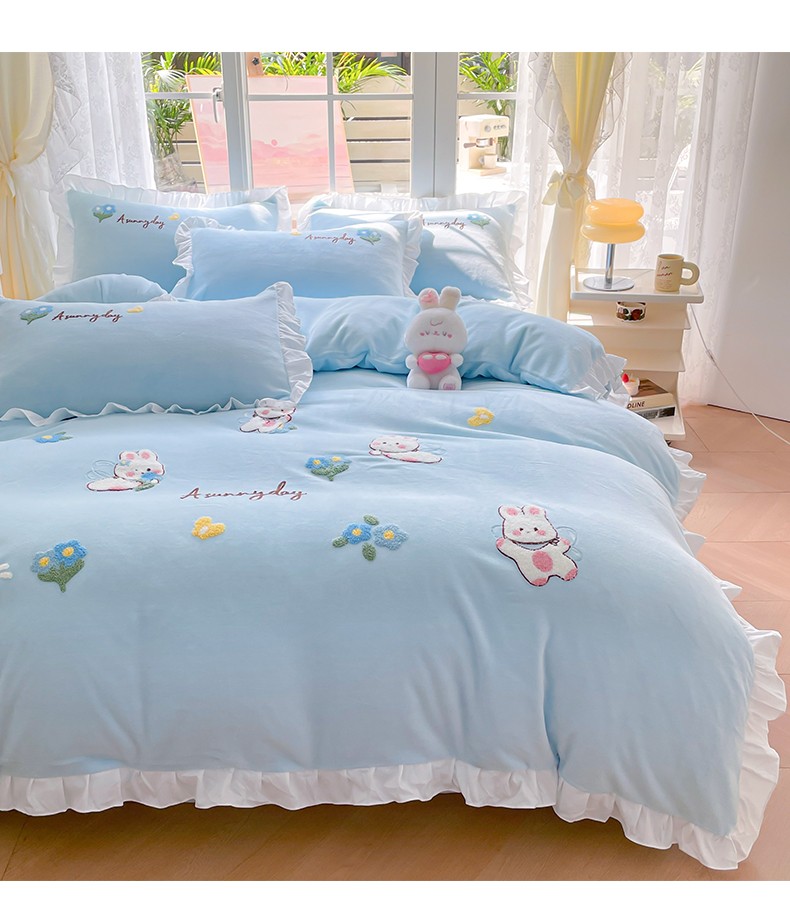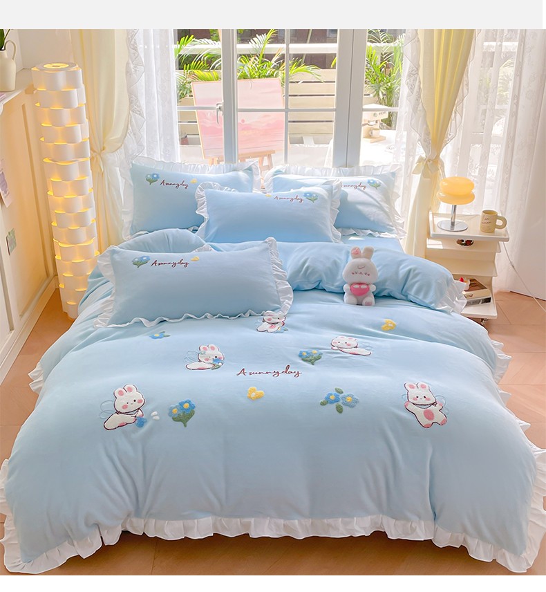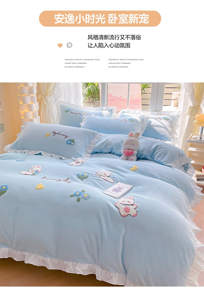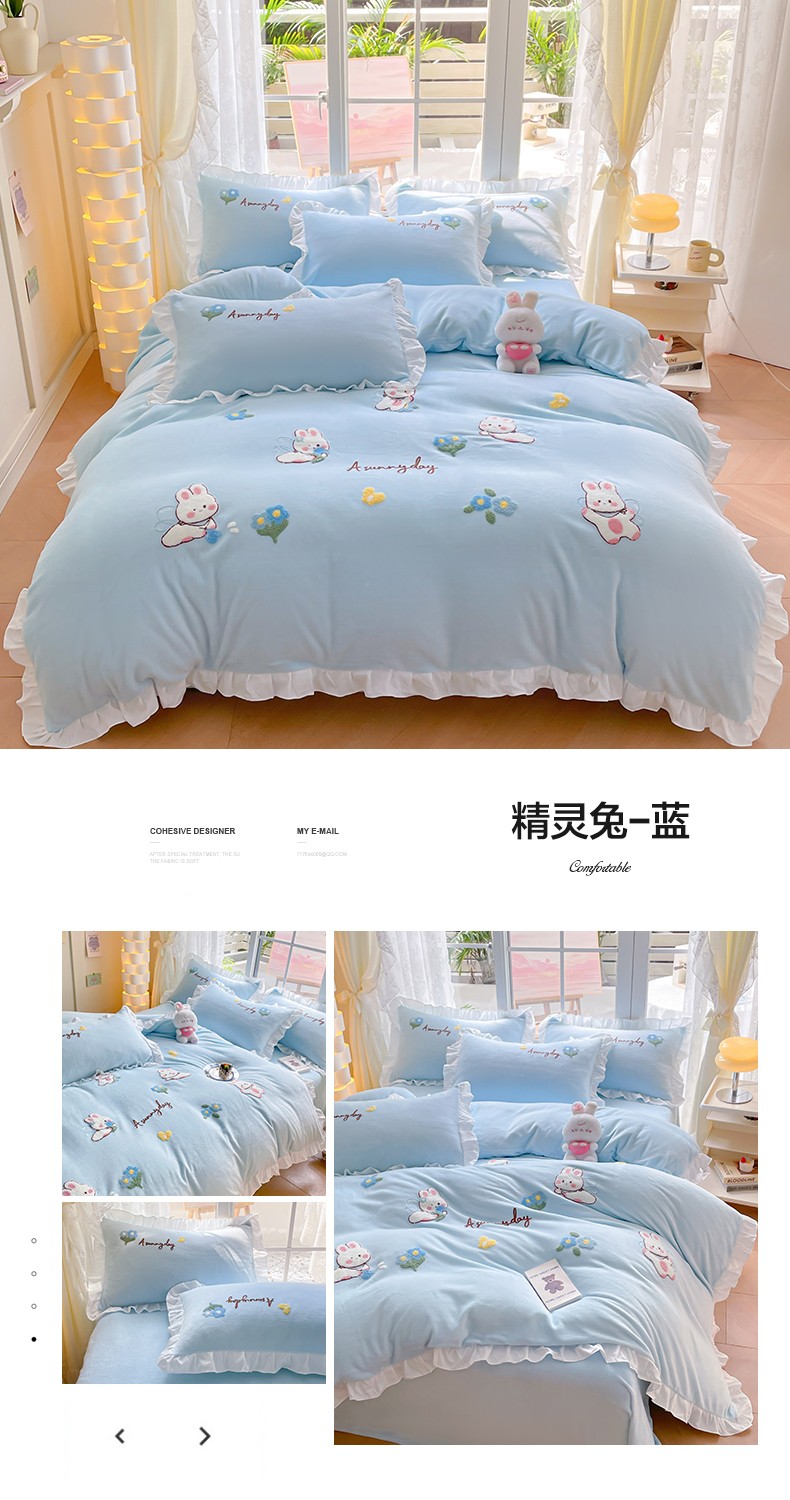 当前位置: 91家纺网 > 商品网购 > 床品套件 > 四件套 > 牛奶绒四件套 > 易禾 2024新款牛奶绒毛巾绣兔绒荷叶边四件套-精灵 精灵兔-蓝