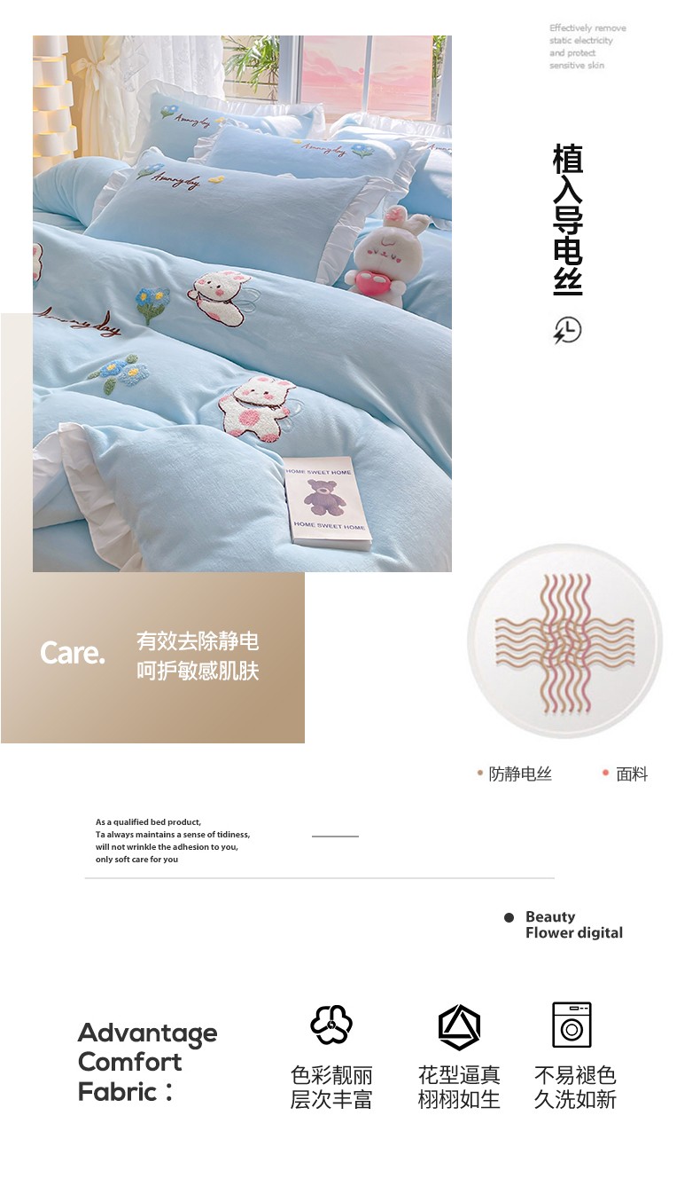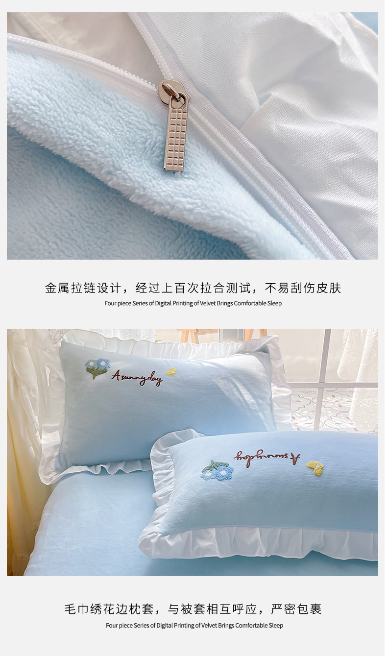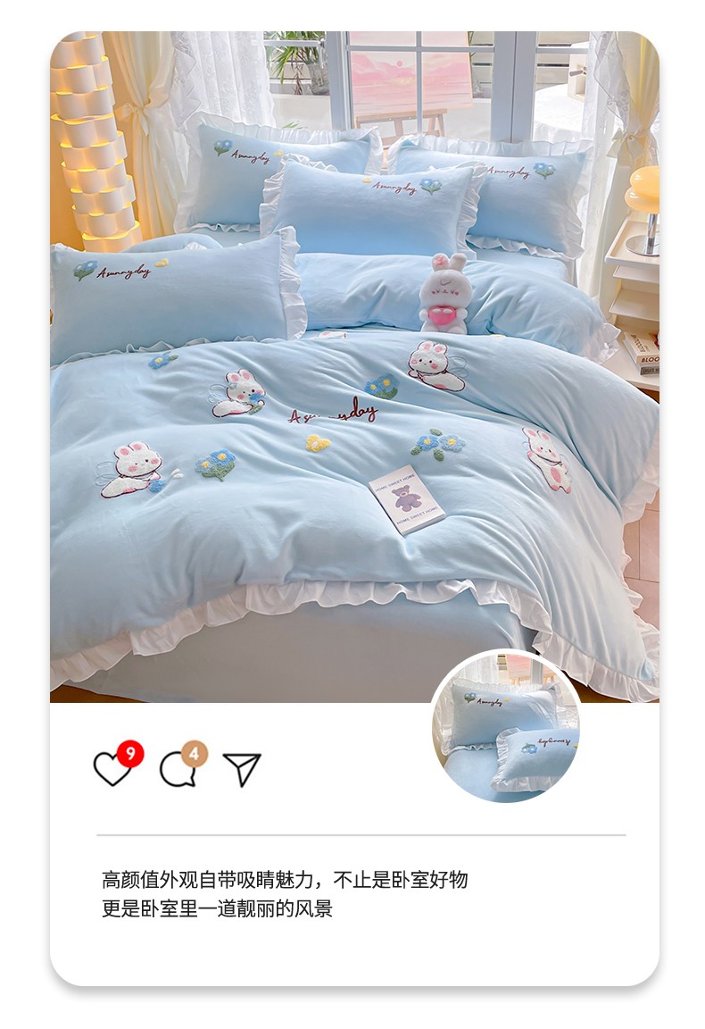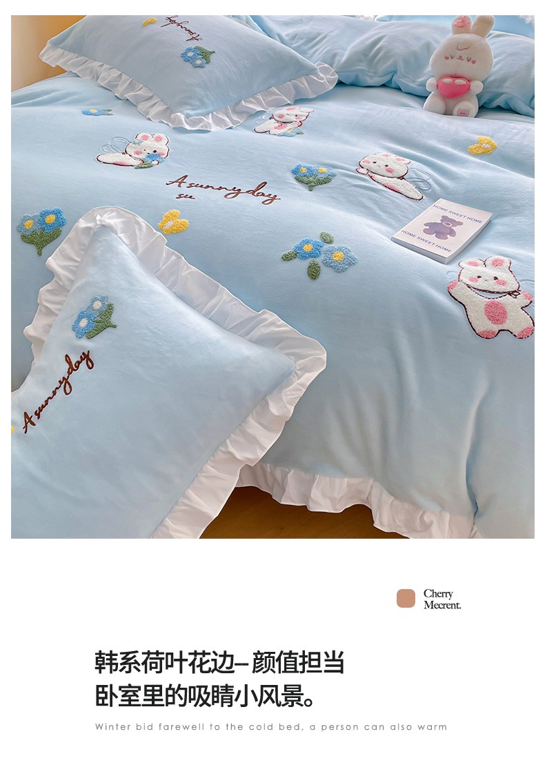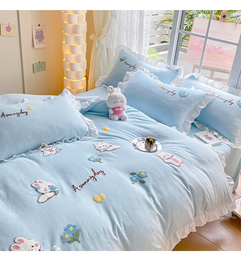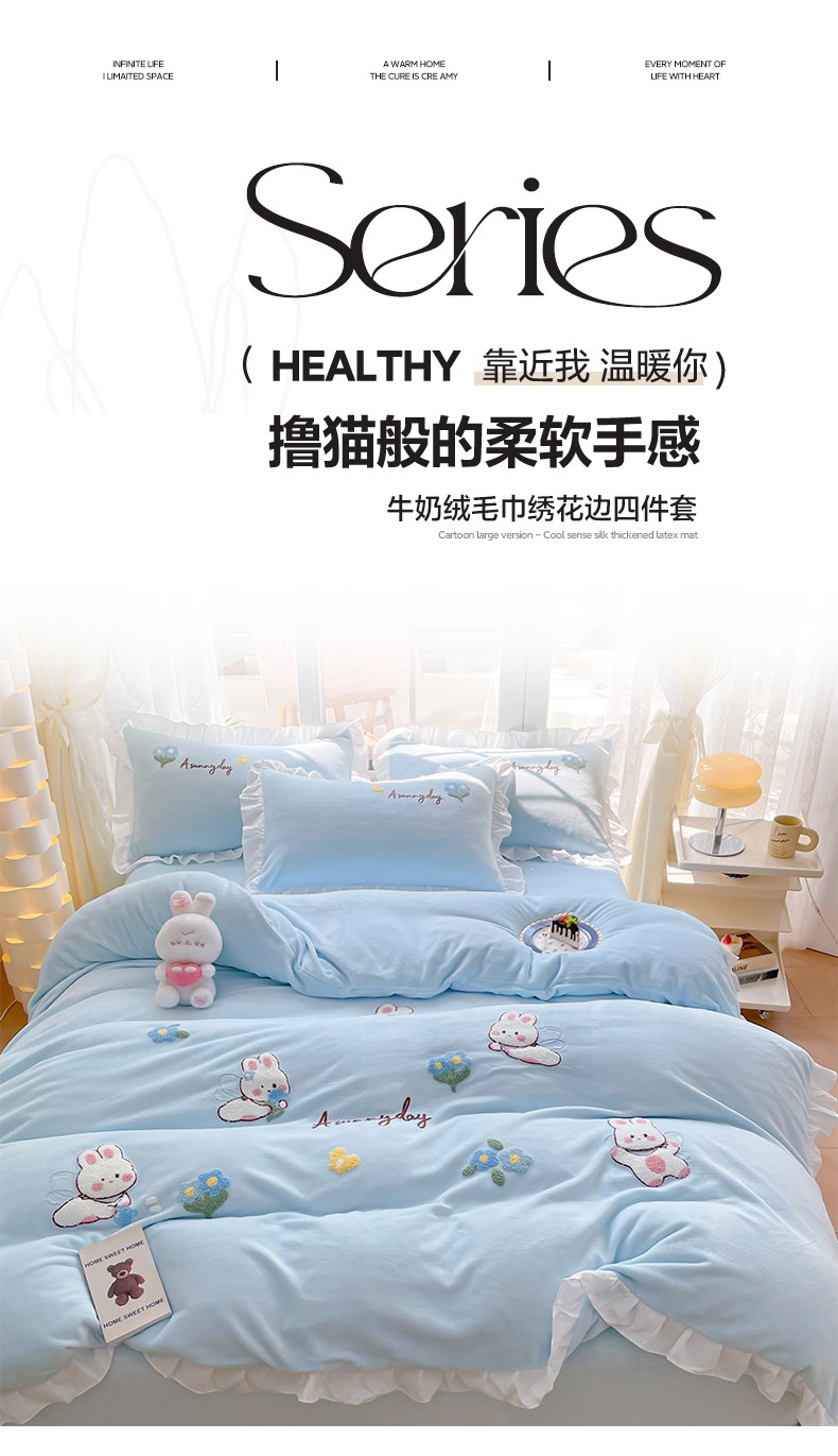 当前位置: 91家纺网 > 商品网购 > 床品套件 > 四件套 > 牛奶绒四件套 > 易禾 2024新款牛奶绒毛巾绣兔绒荷叶边四件套-精灵 精灵兔-蓝