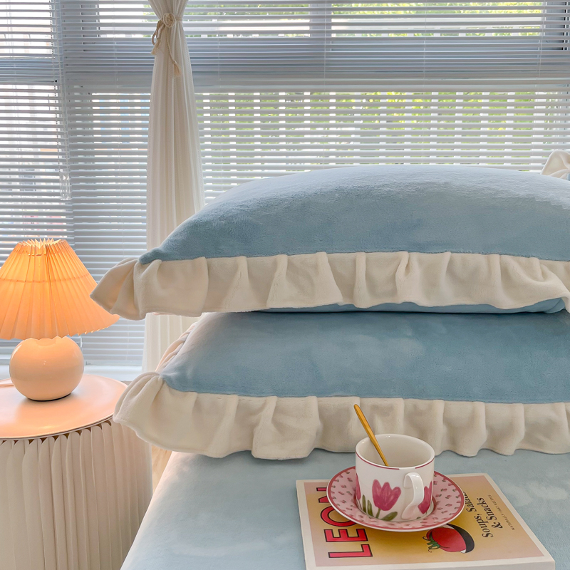 十里居 2023新款纯色韩版花边牛奶绒单床裙三件套 柔和蓝