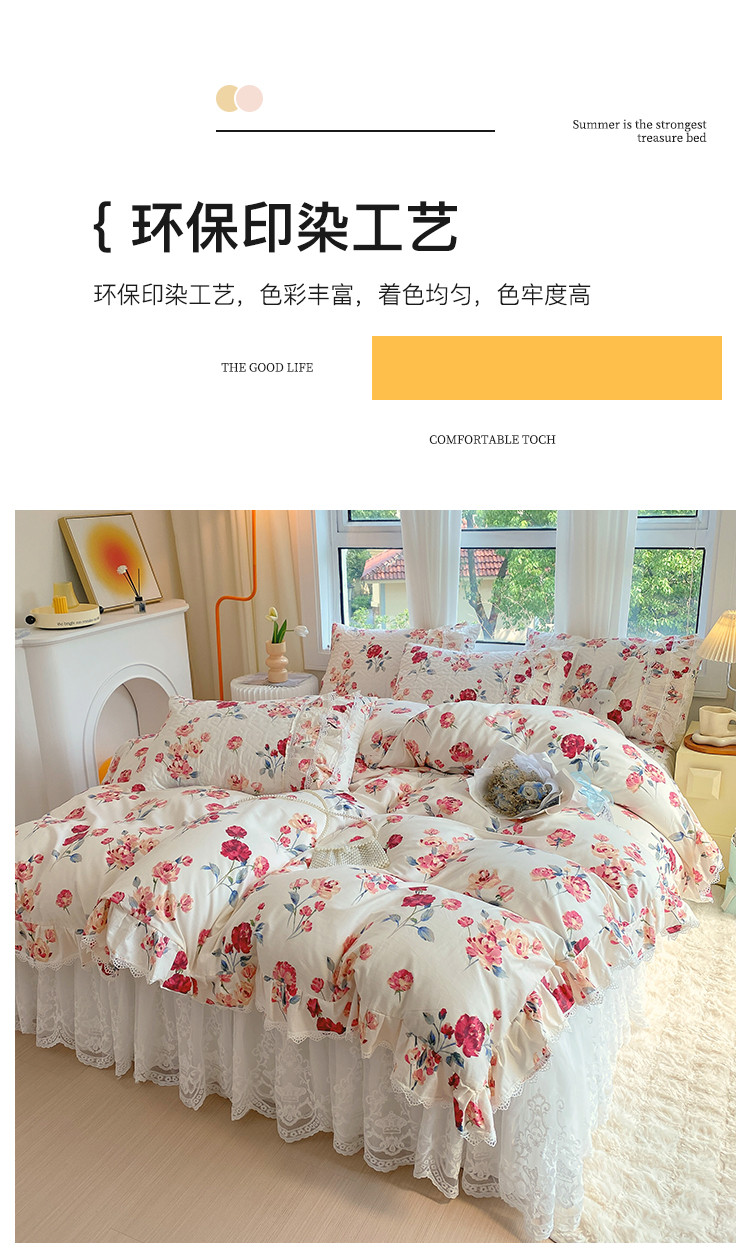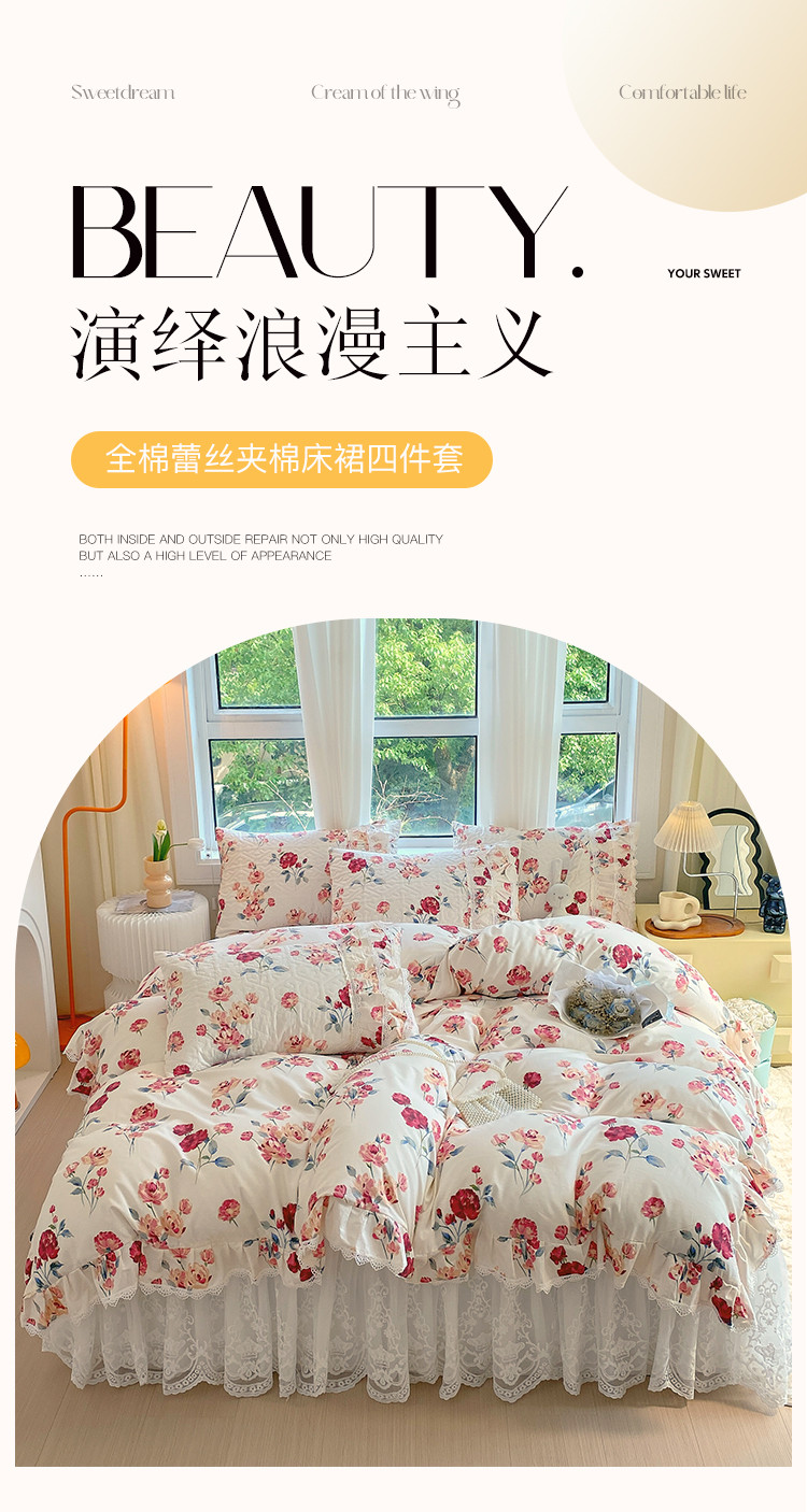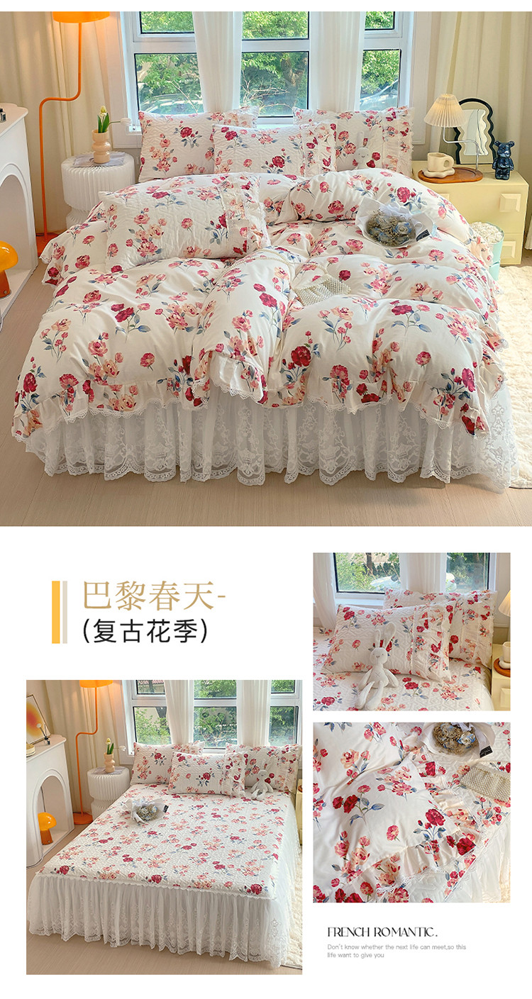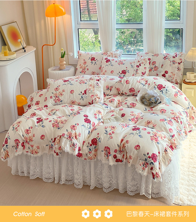 当前位置: 91家纺网 > 商品网购 > 床品套件 > 四件套 > 全棉普通四件套 > 罗艺轩 2024新款全棉蕾丝夹棉床裙巴黎春天系列四件套 复古花季