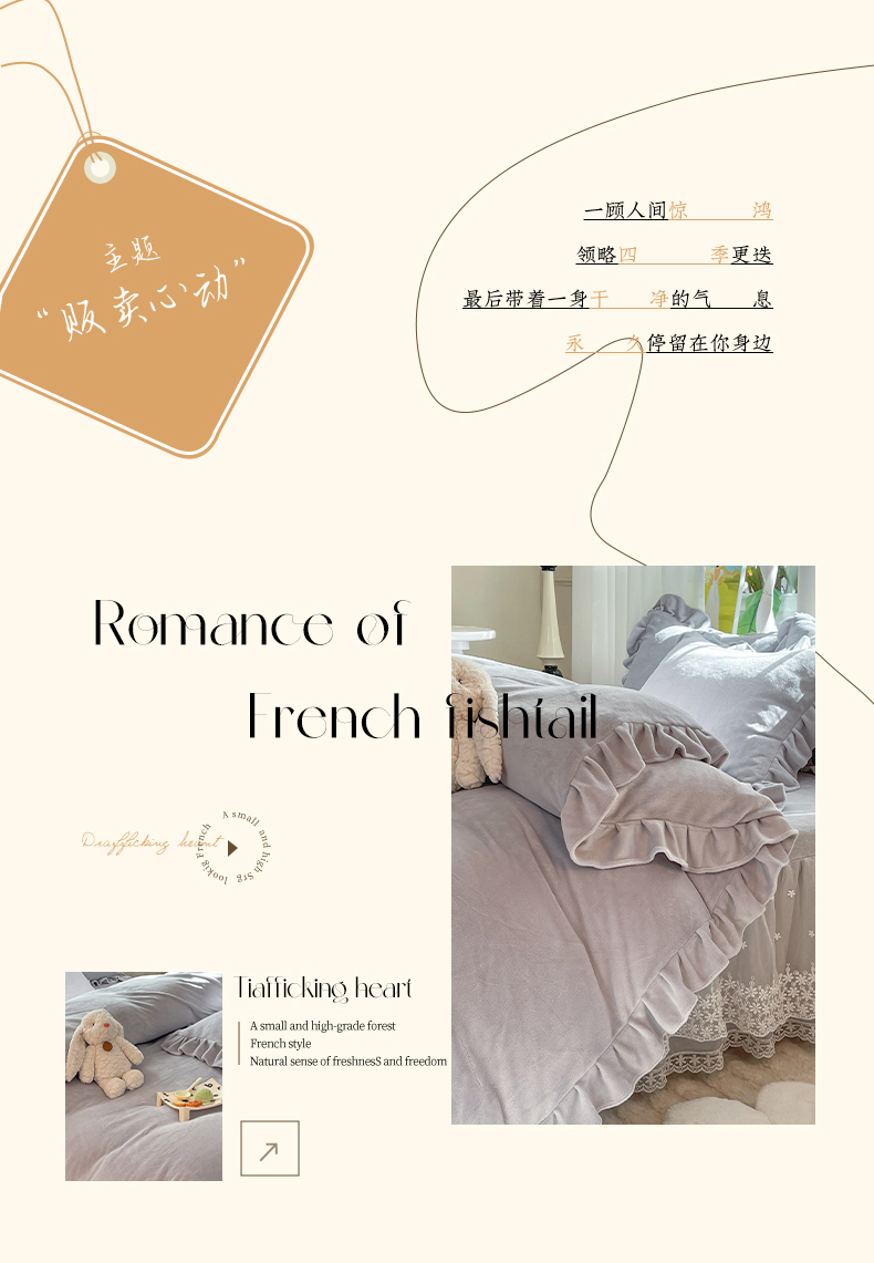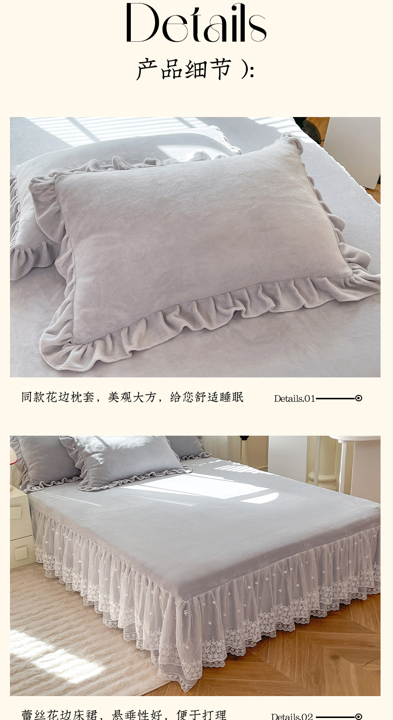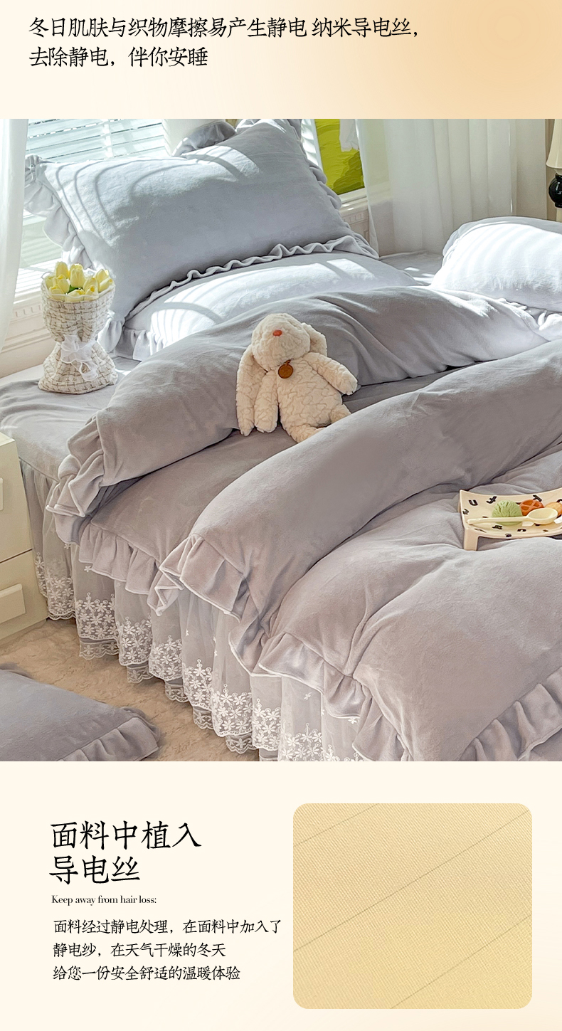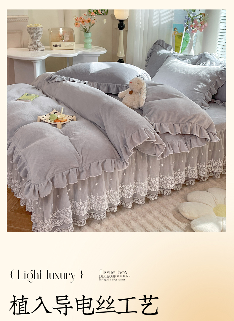 商品名称:【8斤重】2025新款秋冬加厚牛奶绒床裙款四件套法式浪漫蕾丝花边工艺-遇见系列 遇见-高级灰