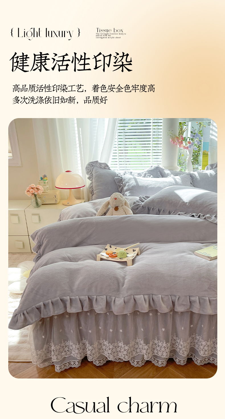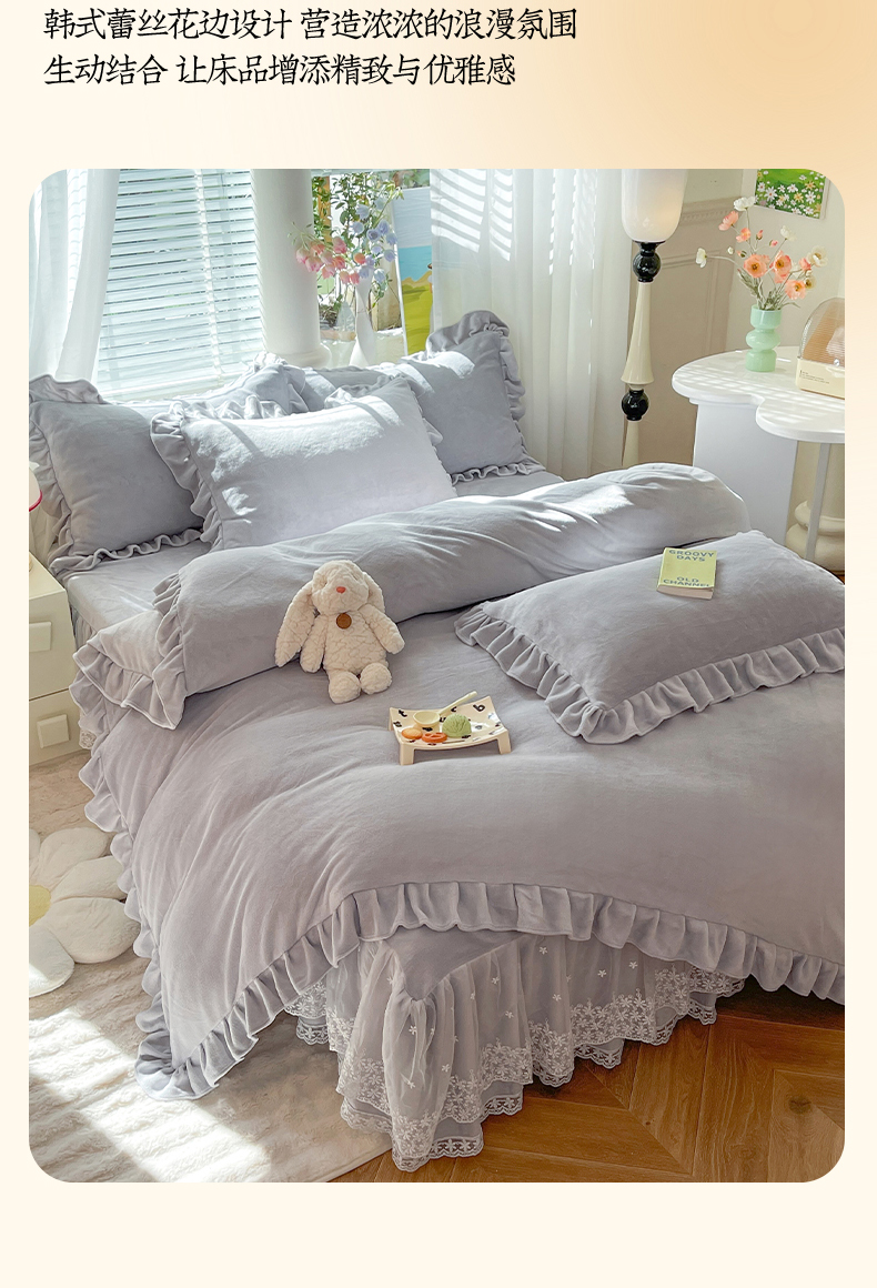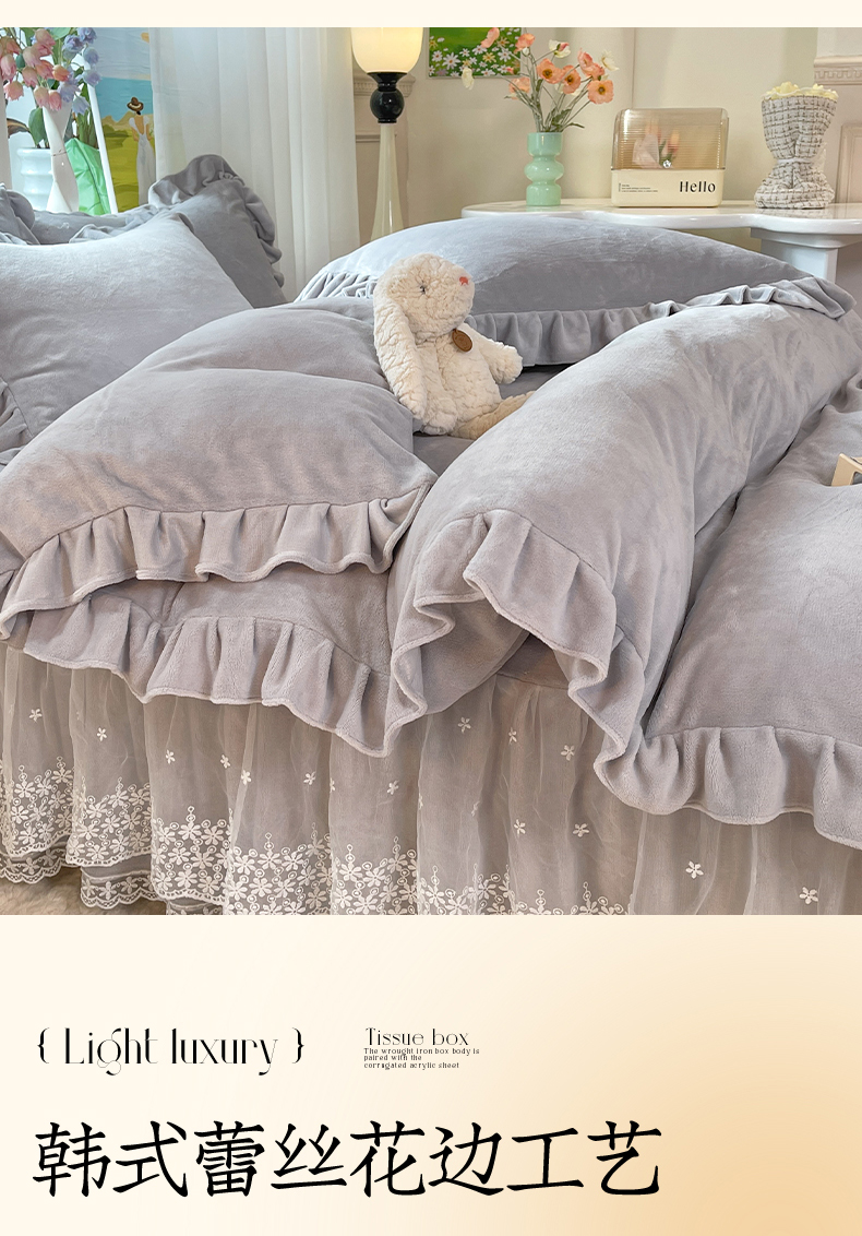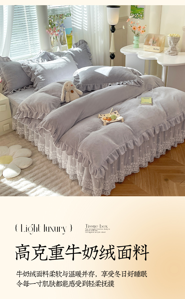 【8斤重】2025新款秋冬加厚牛奶绒床裙款四件套法式浪漫蕾丝花边工艺-遇见系列 遇见-高级灰