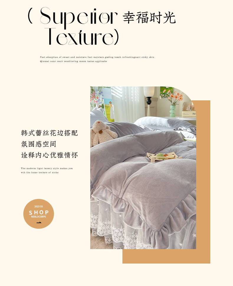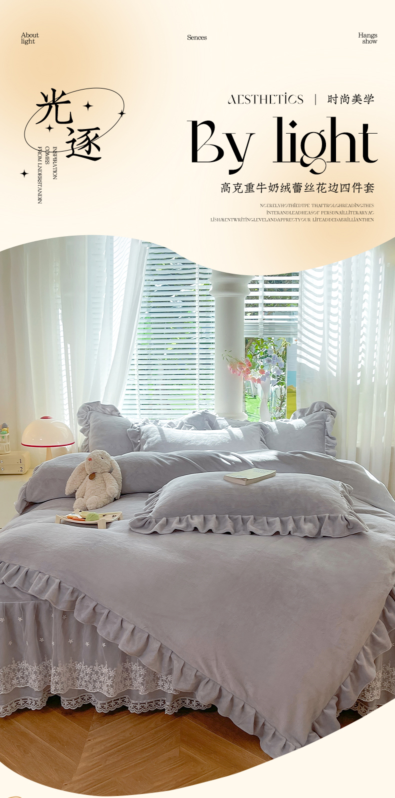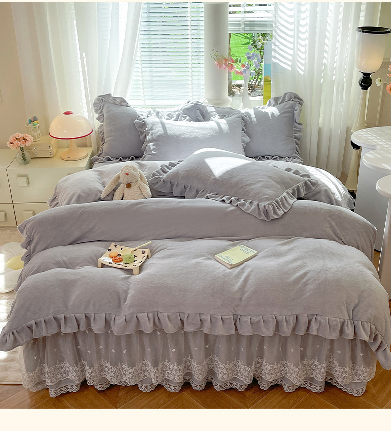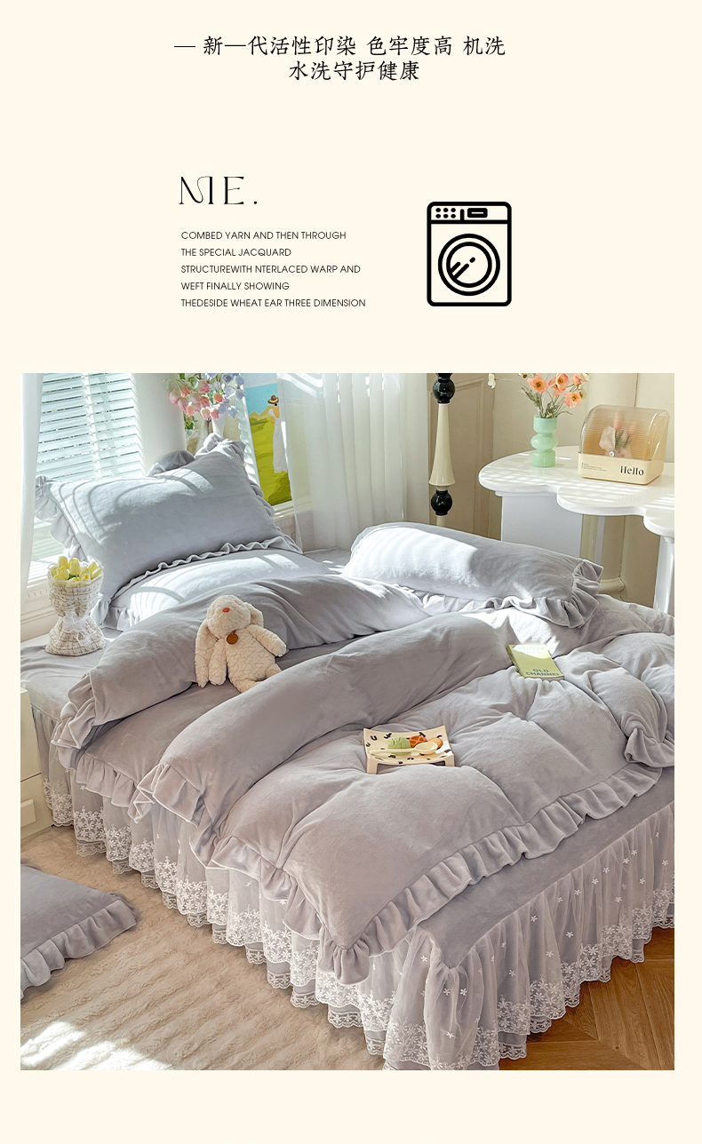 【8斤重】2025新款秋冬加厚牛奶绒床裙款四件套法式浪漫蕾丝花边工艺-遇见系列 遇见-高级灰