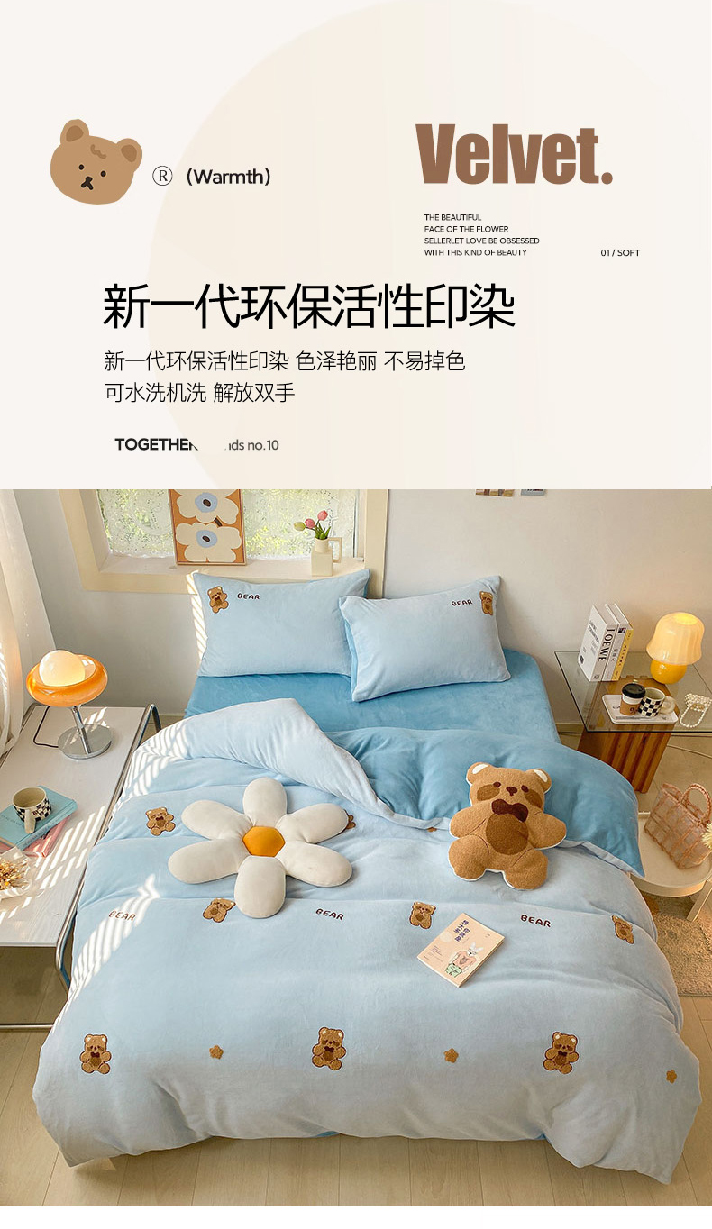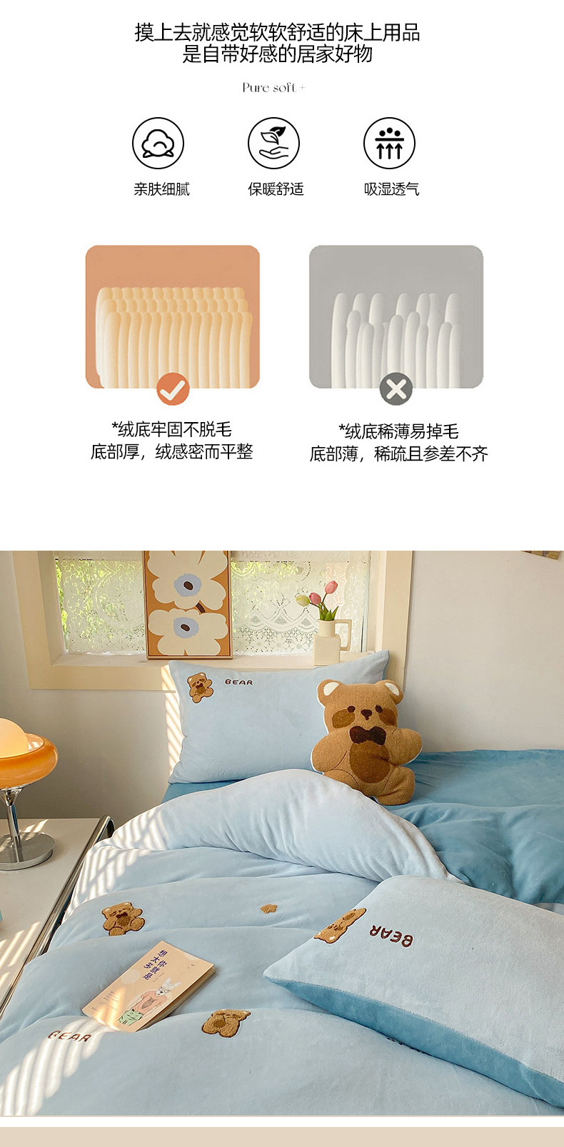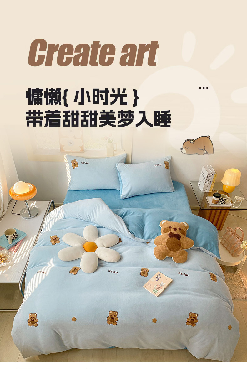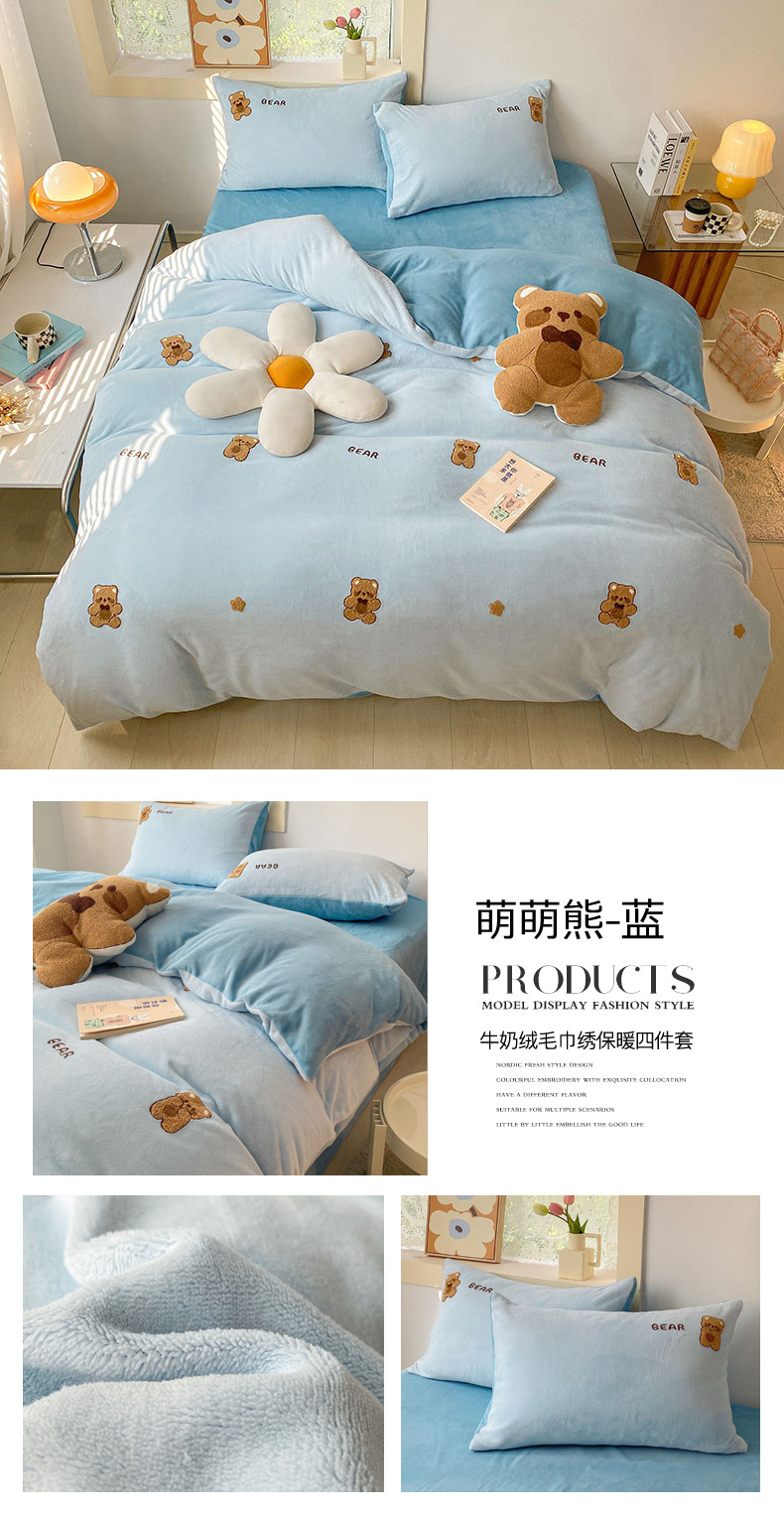 商品名称:寐居家纺 2023毛巾绣牛奶绒四件套 萌萌熊-蓝