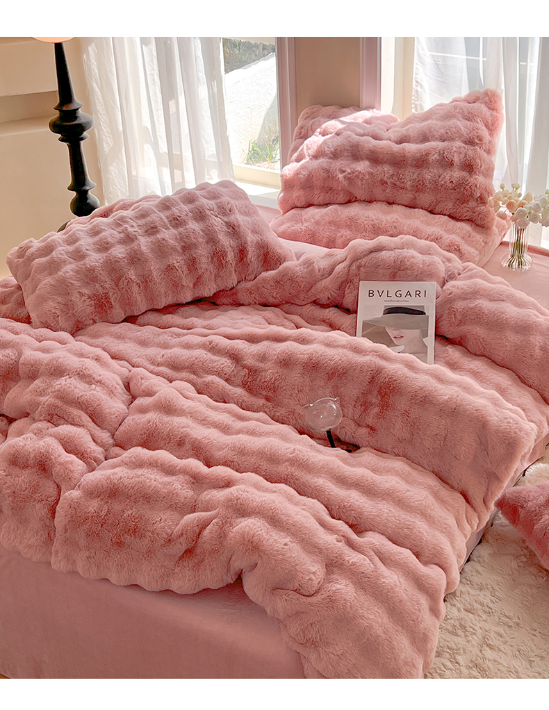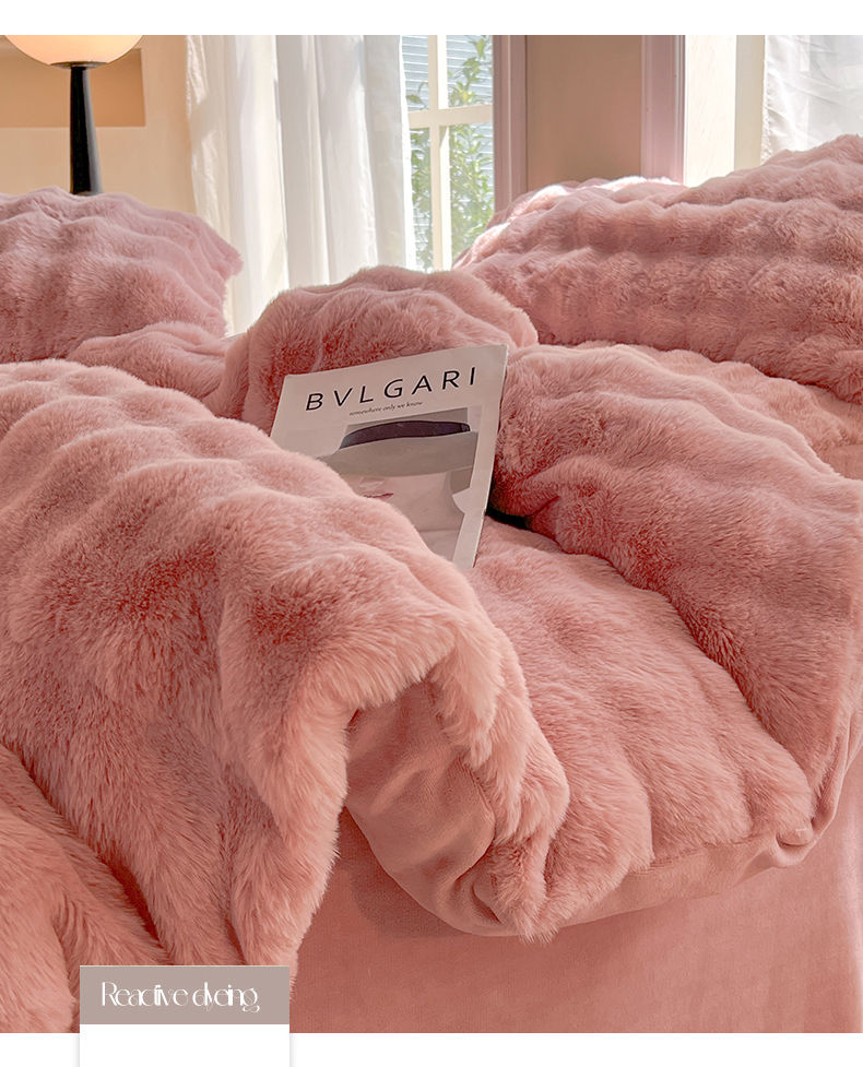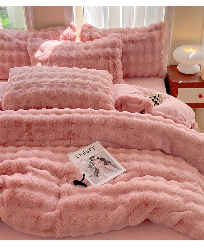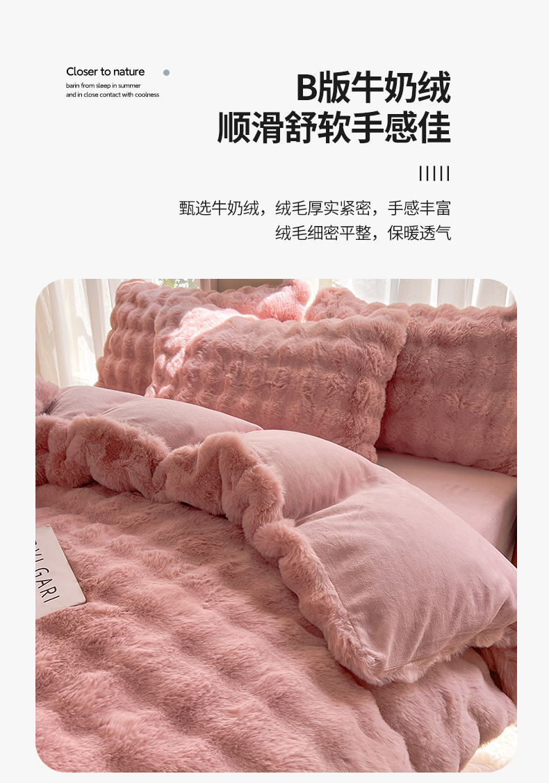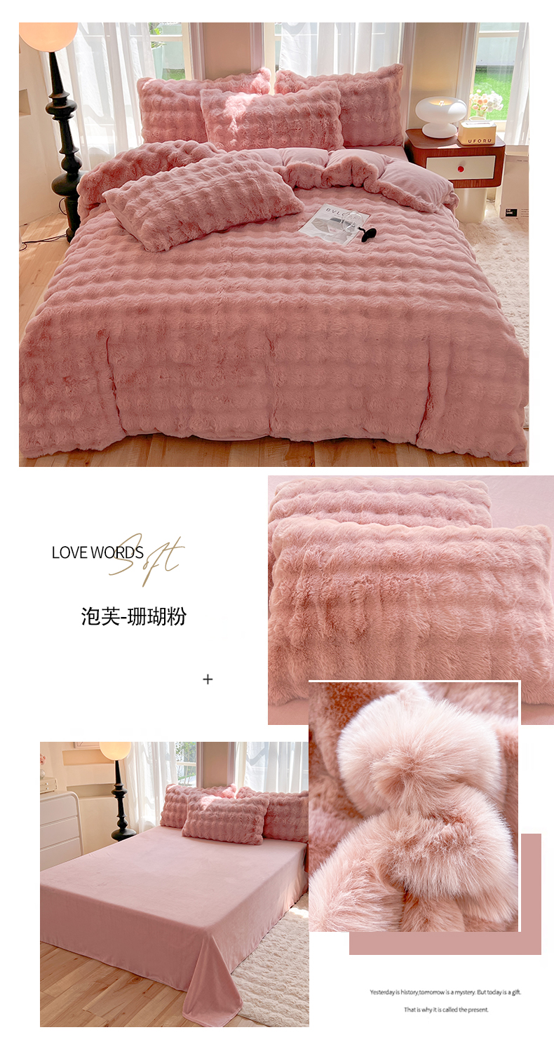 商品名称:妖妖 2023新款兔毛牛奶绒四件套-泡芙 泡芙-珊瑚粉