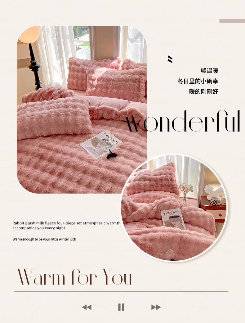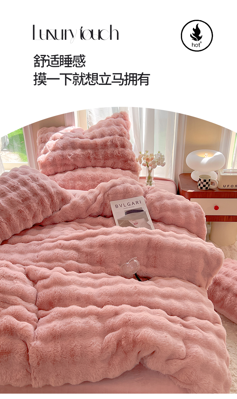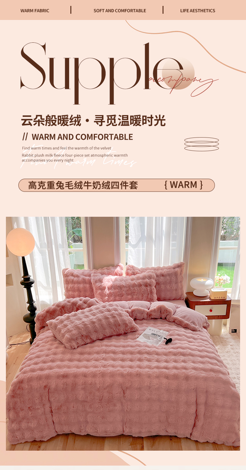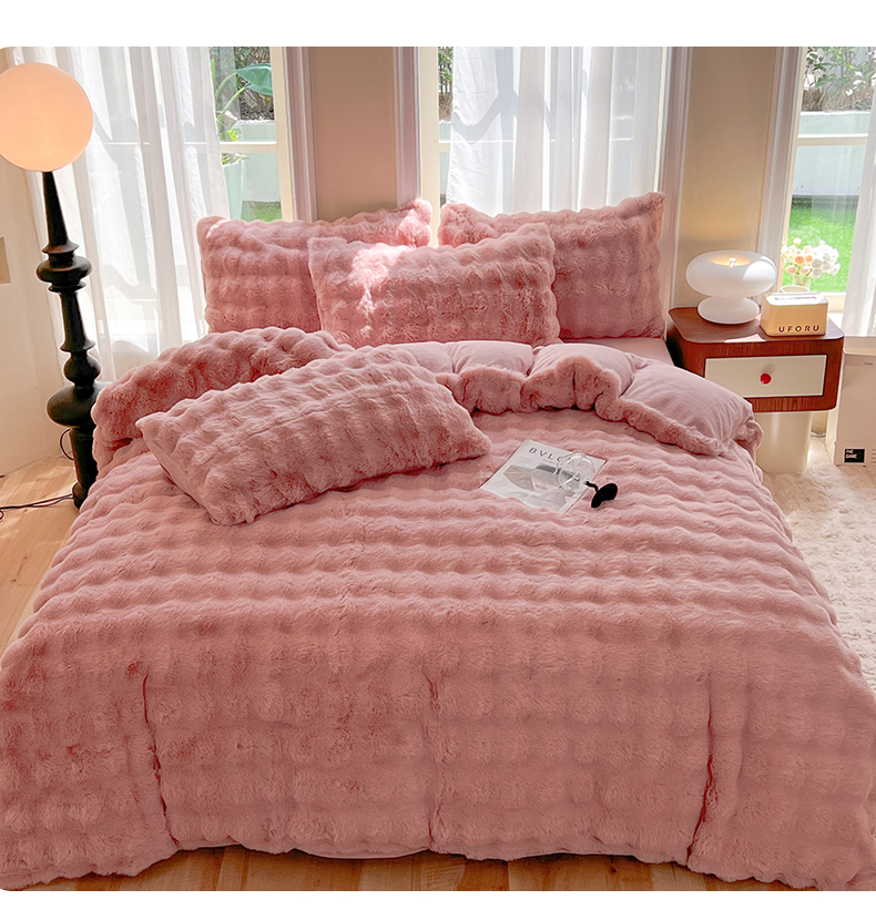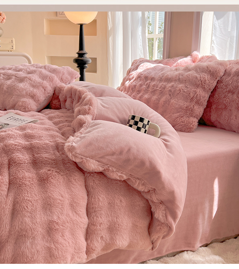 商品名称:妖妖 2023新款兔毛牛奶绒四件套-泡芙 泡芙-珊瑚粉